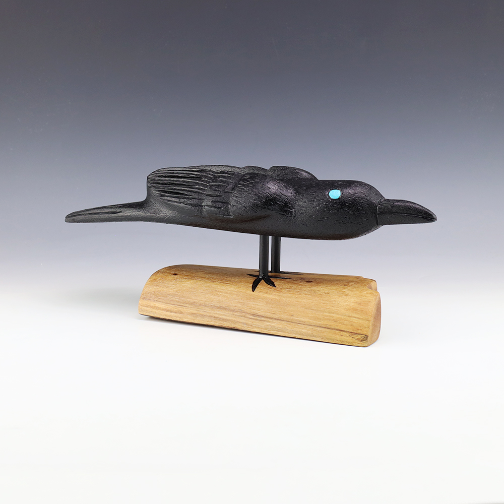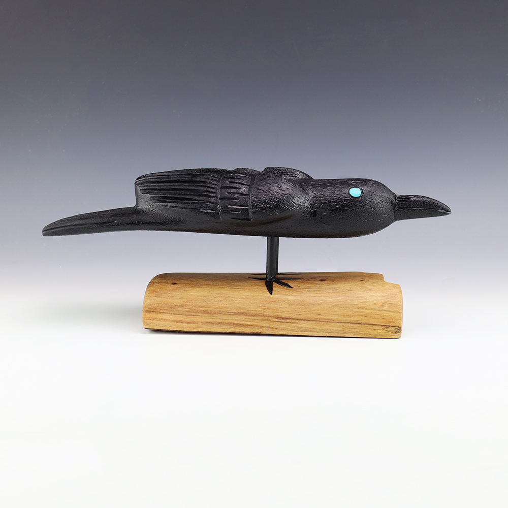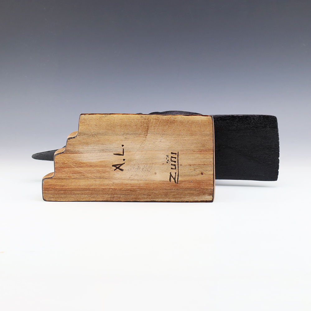 Zuni artist Alan Lewis carved this magnificent crow out of wood. He burns the wood with intricate detail and then stains it with alluring colors. A wonderful addition to your Native American art collection. Signed