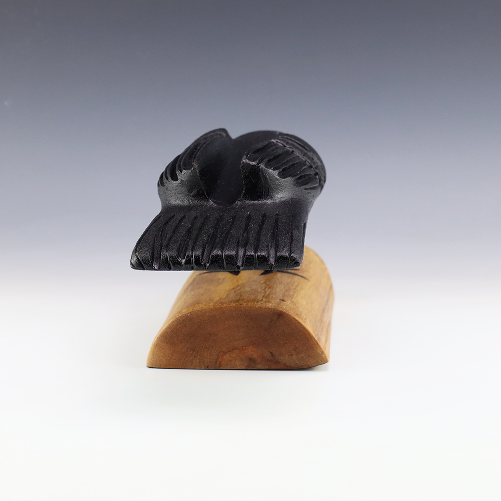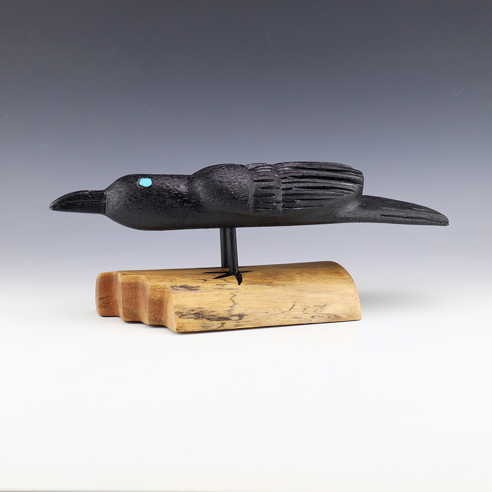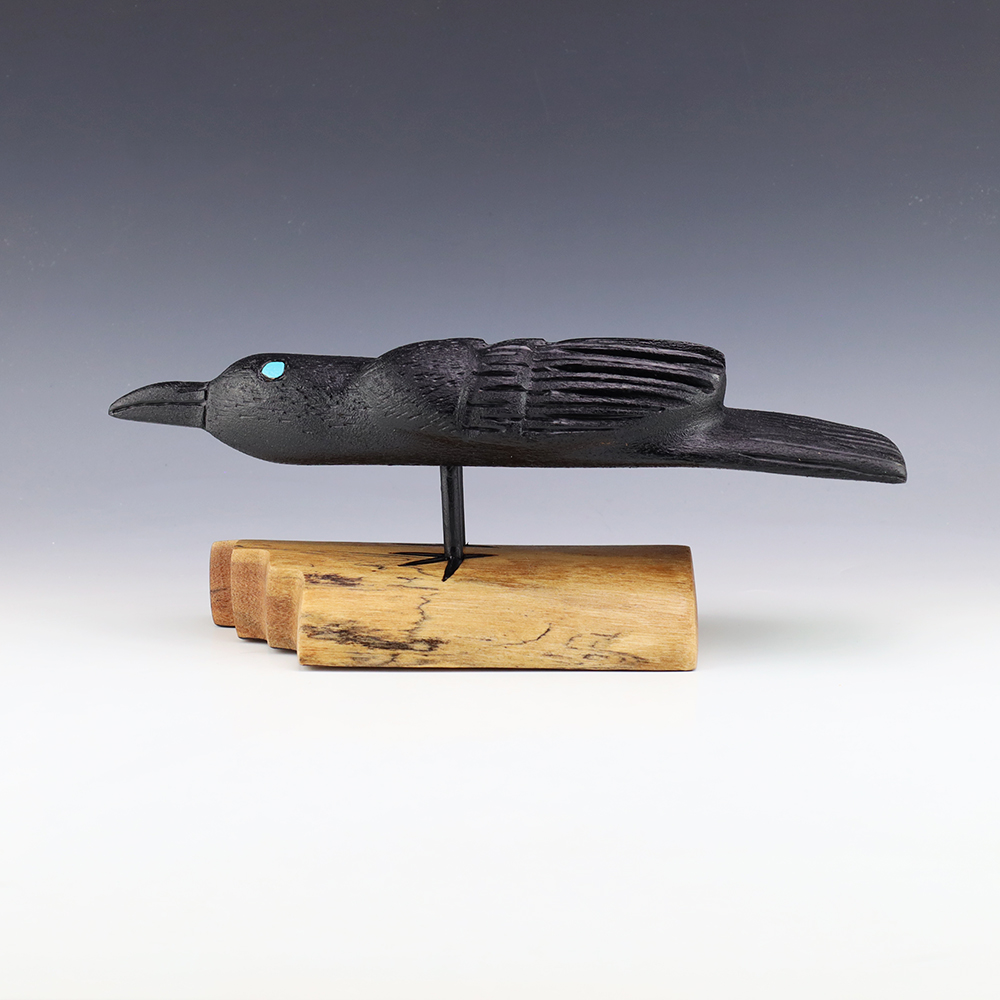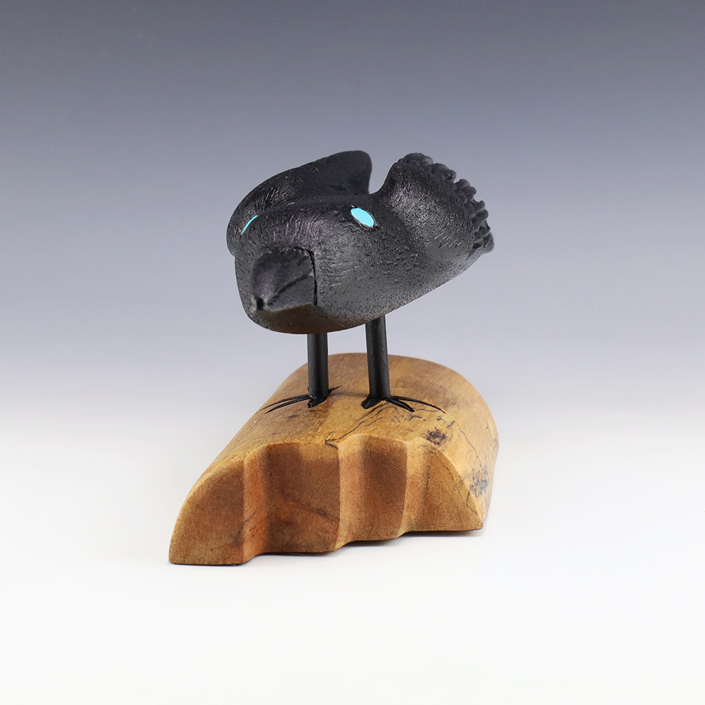 Zuni artist Alan Lewis carved this magnificent crow out of wood. He burns the wood with intricate detail and then stains it with alluring colors. A wonderful addition to your Native American art collection. Signed