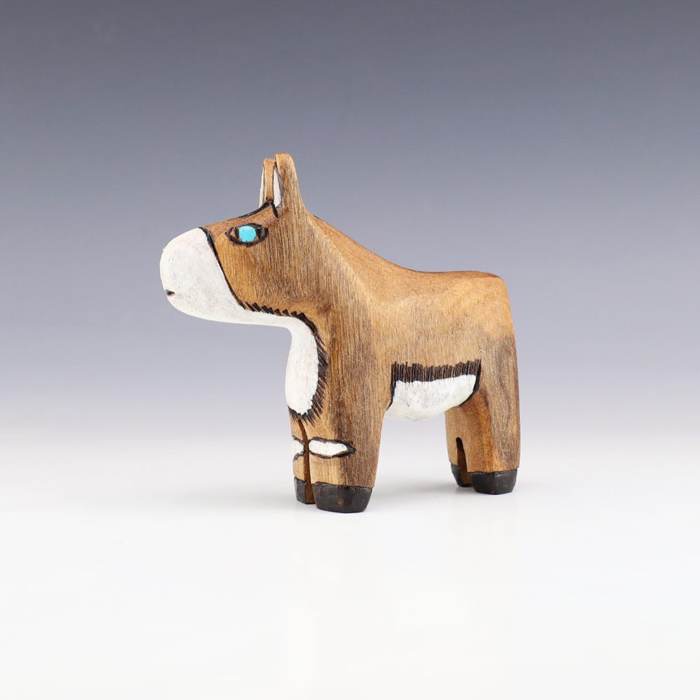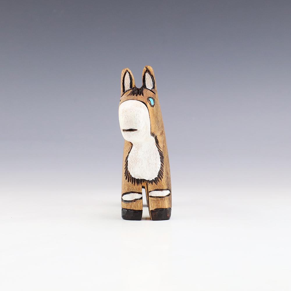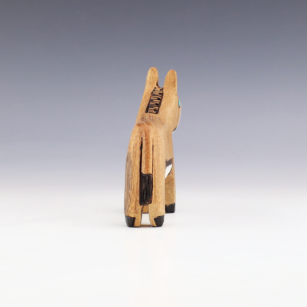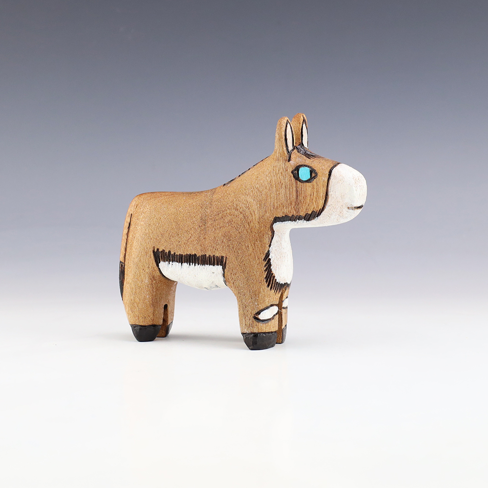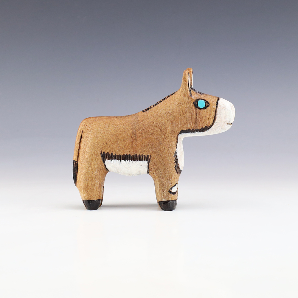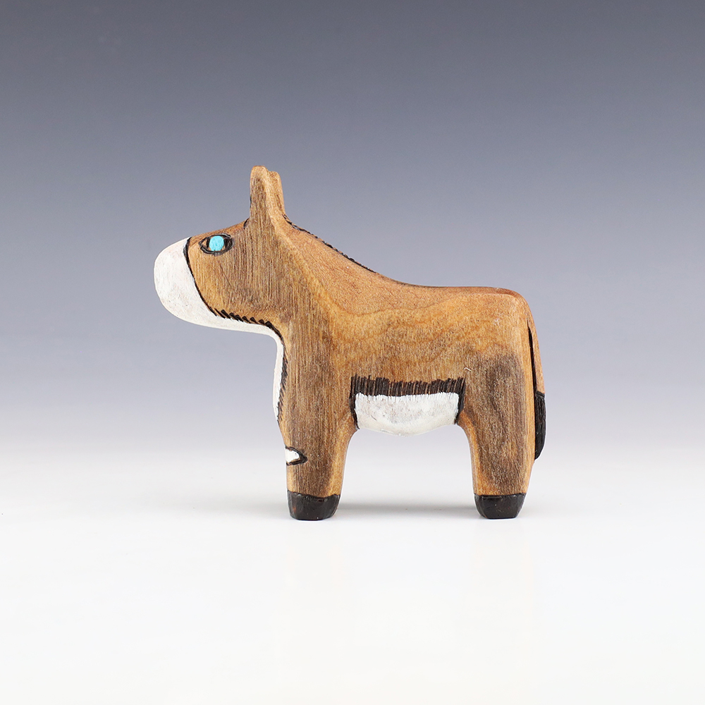 Zuni artist Alan Lewis carved this wonderful donkey out of wood. He burns the wood with intricate detail and then stains it with alluring colors. A wonderful addition to your Native American art collection. Signed
