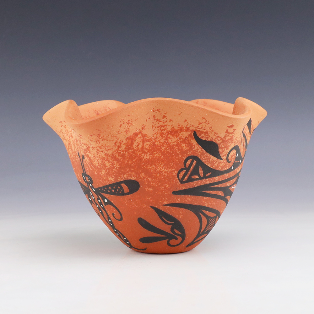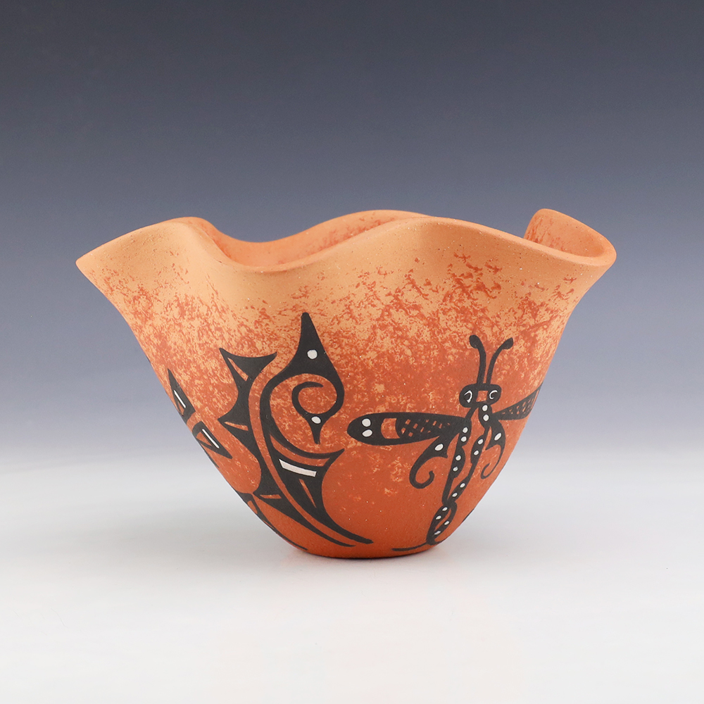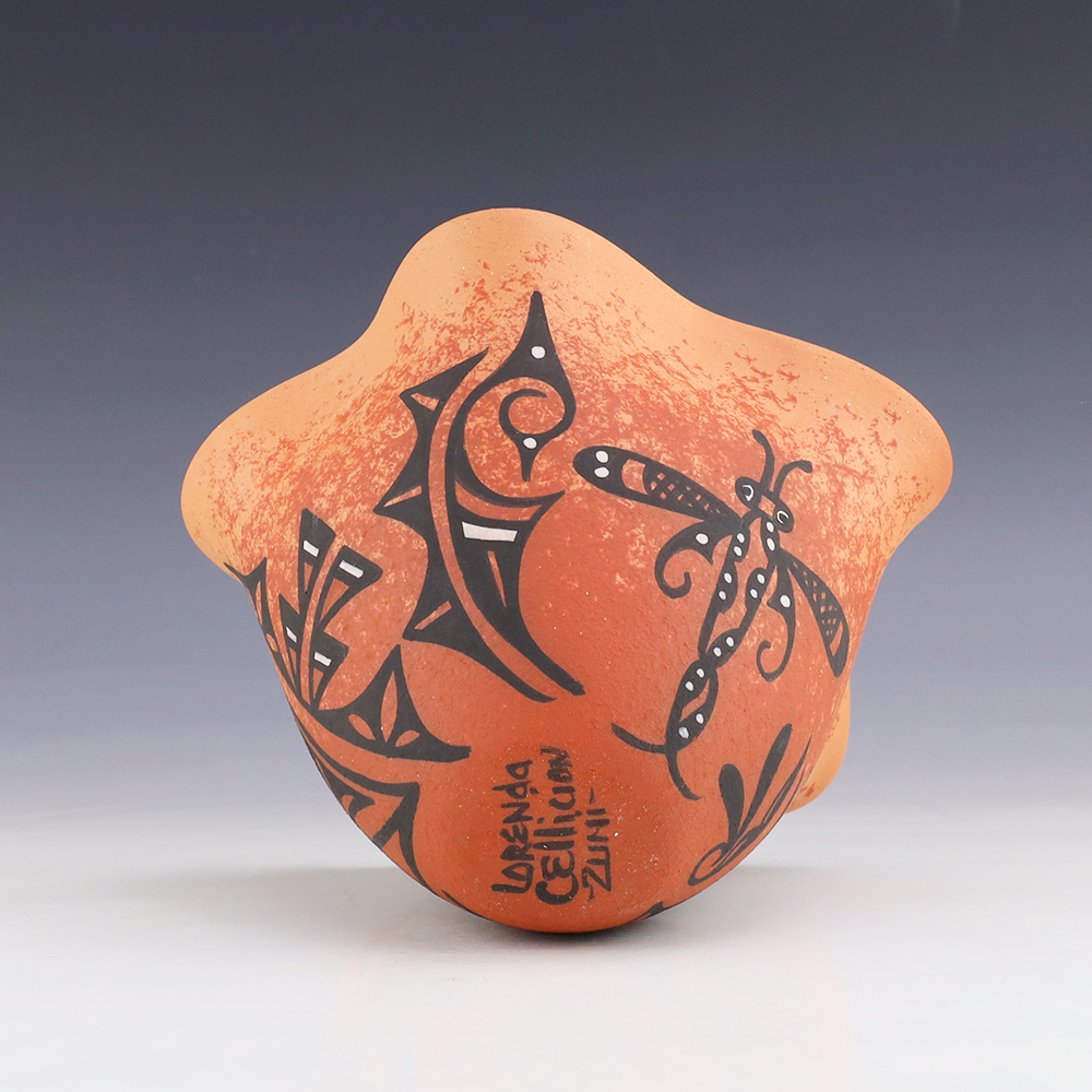 Zuni potter Lorenda Cellicion hand crafted this exquisite pot using traditional techniques of hand coiling and outdoor kiln firing. Incorporating natural colors of red, black, and white, there is a dragonfly on one side. A great addition to any pottery or Native American art collection. Signed