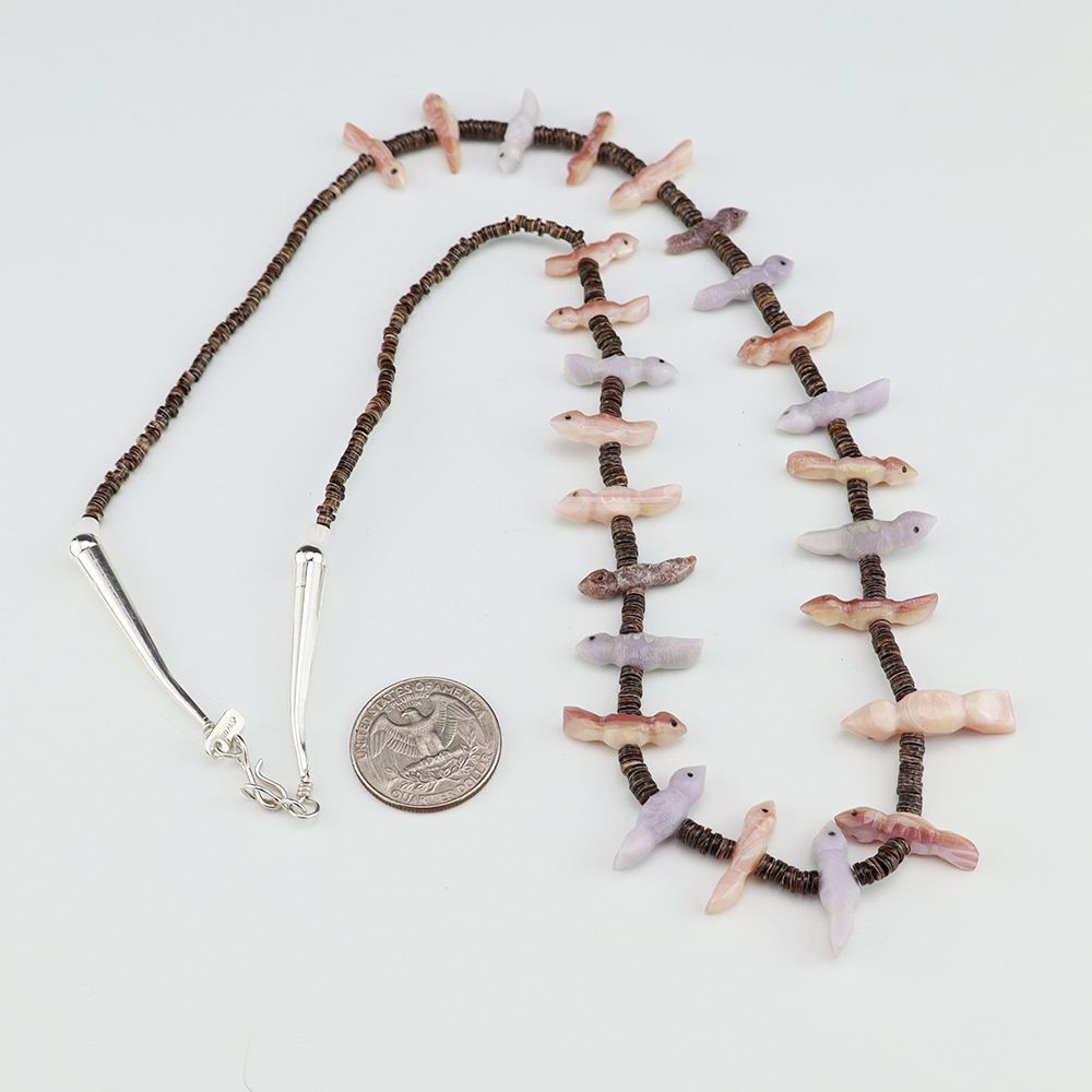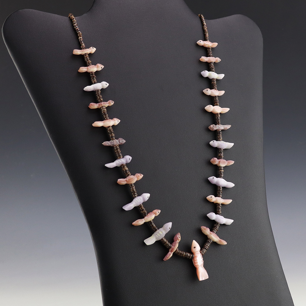 Zuni artists Nancy and Sheldon Westika created this exquisite fetish necklace. The birds are hand carved out of Lepidolite, Fluorite, and Pink Mussel. There is fine Olive Shell in between the fetish and at the ends. This beautiful strand is finished off with a sterling silver clasp and cones. A statement piece that you will enjoy for many years. Weighs 36 grams. Signed