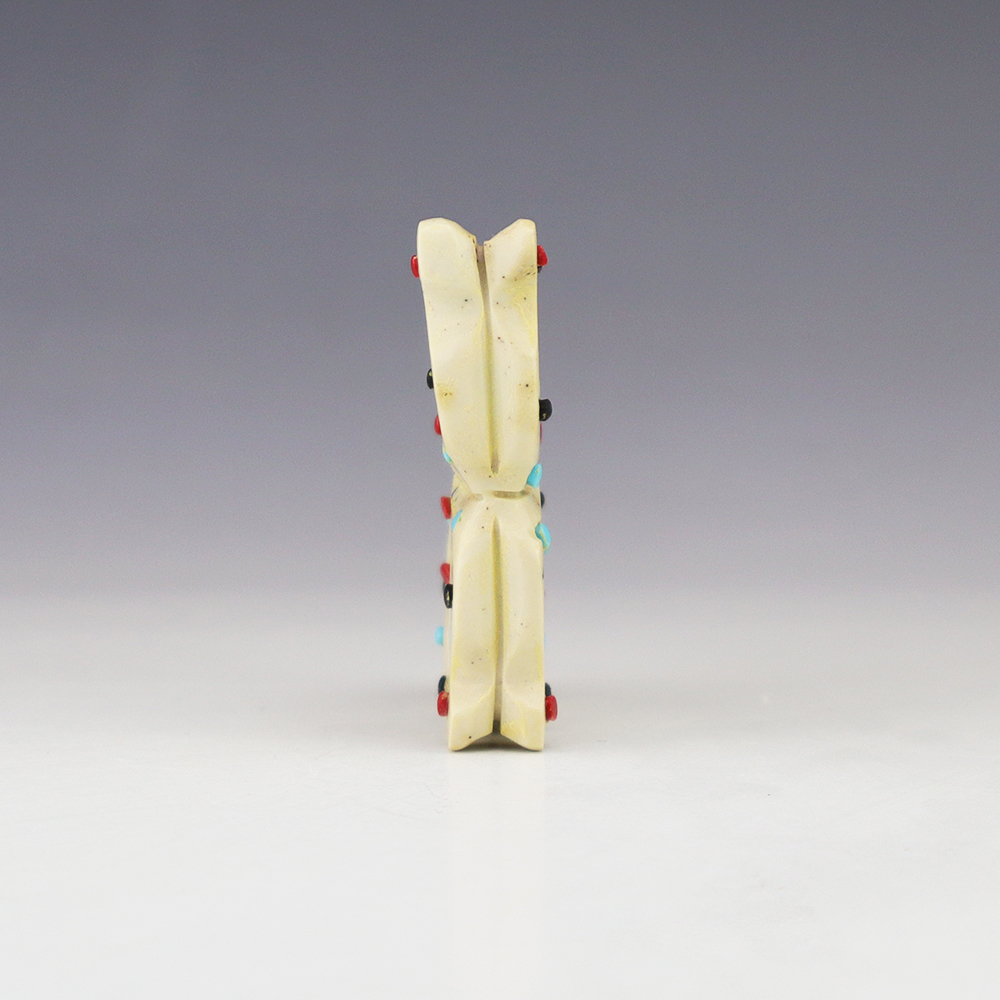 Zuni artist Gabe Sice hand carved this lovely maiden fetish. Made out of antler with intricate detail and inlaid with natural Sleeping Beauty Turquoise, Mediterranean Coral, and Penn Shell. (note-there is natural pits in the antler) This maiden would make a great addition to your Native American or Zuni fetish...
