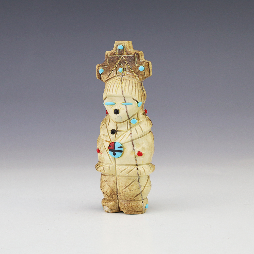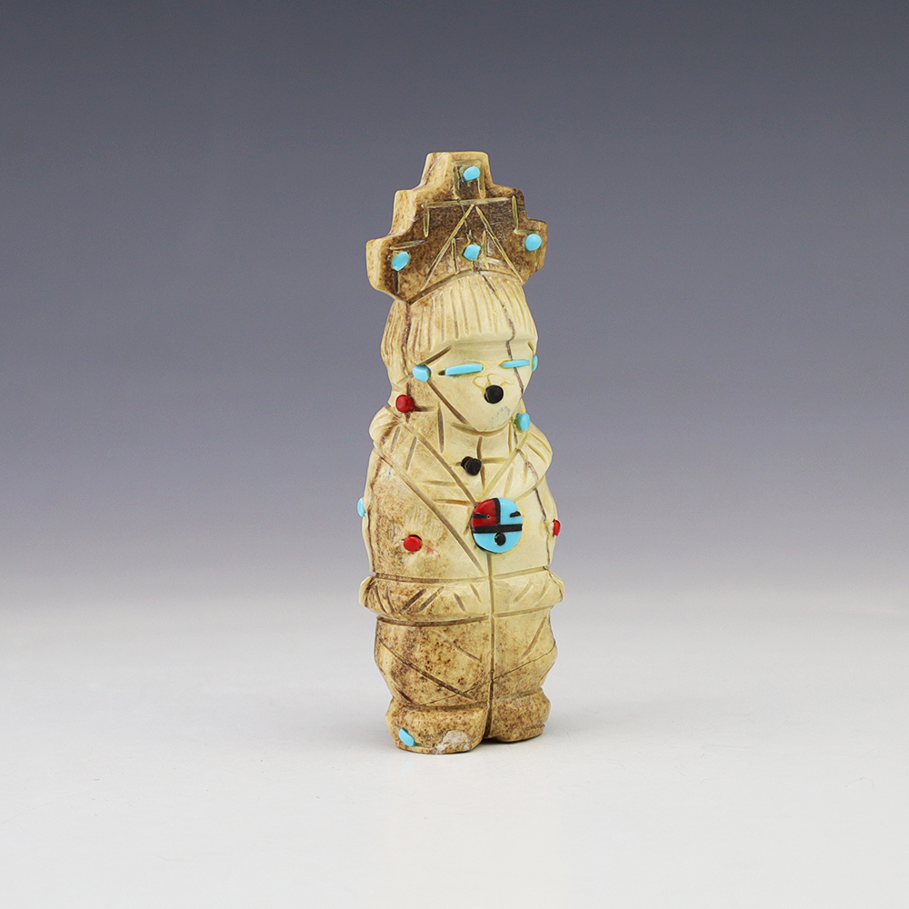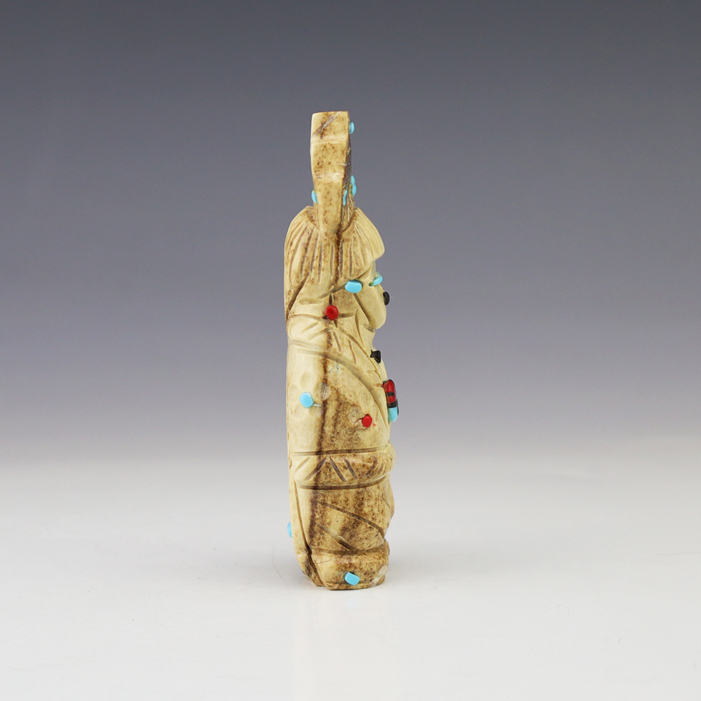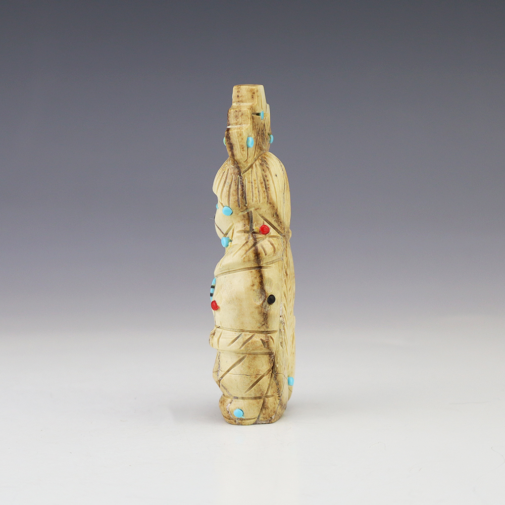 Zuni artist Gabe Sice hand carved this lovely maiden fetish. Made out of antler with intricate detail and inlaid with natural Sleeping Beauty Turquoise, Mediterranean Coral, and Penn Shell. (note-there is natural pits in the antler) This maiden would make a great addition to your Native American or Zuni fetish...