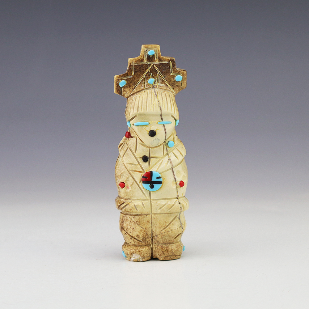 Zuni artist Gabe Sice hand carved this lovely maiden fetish. Made out of antler with intricate detail and inlaid with natural Sleeping Beauty Turquoise, Mediterranean Coral, and Penn Shell. (note-there is natural pits in the antler) This maiden would make a great addition to your Native American or Zuni fetish...