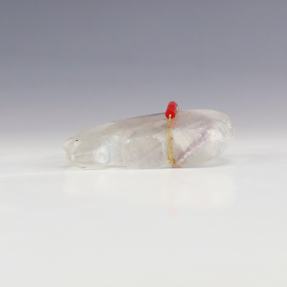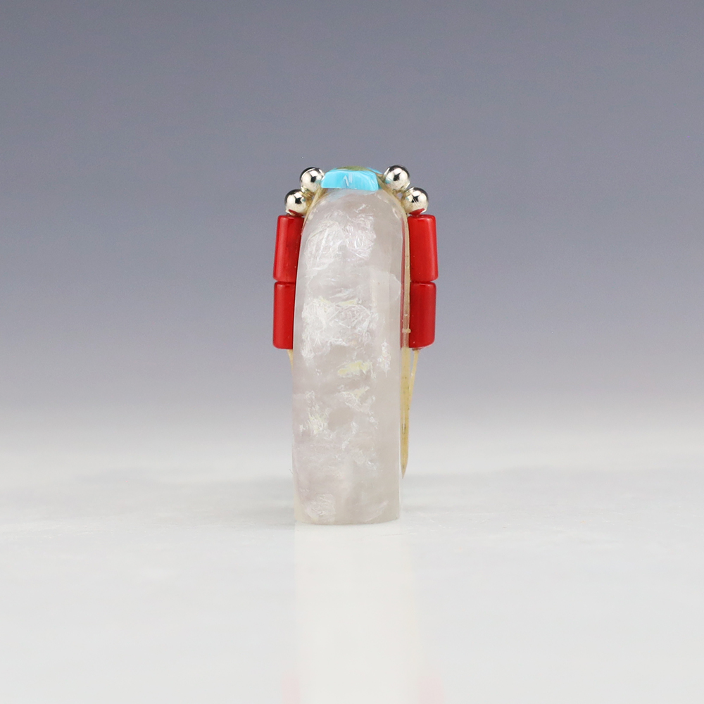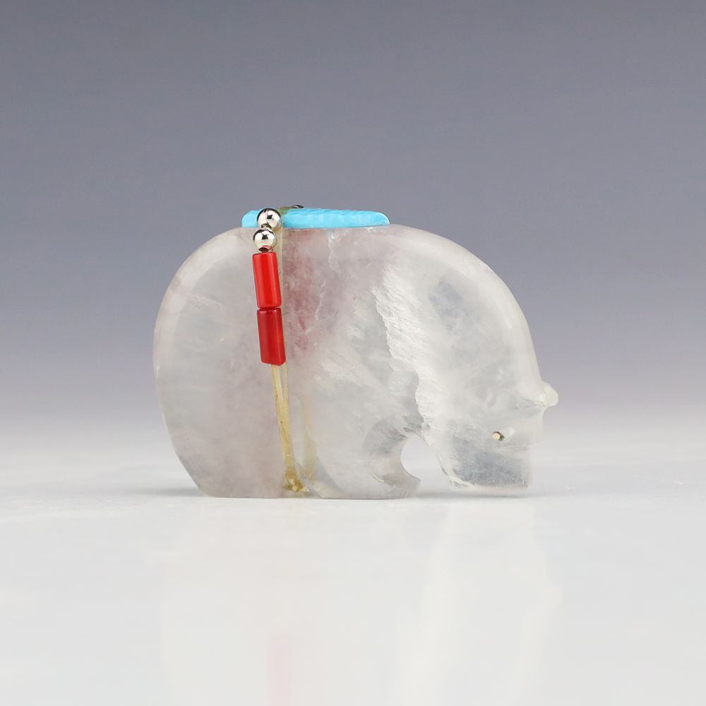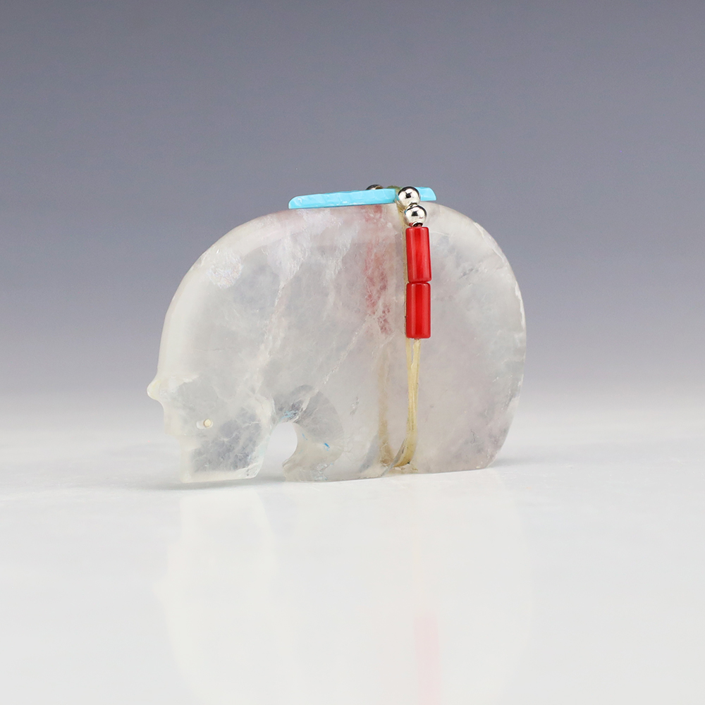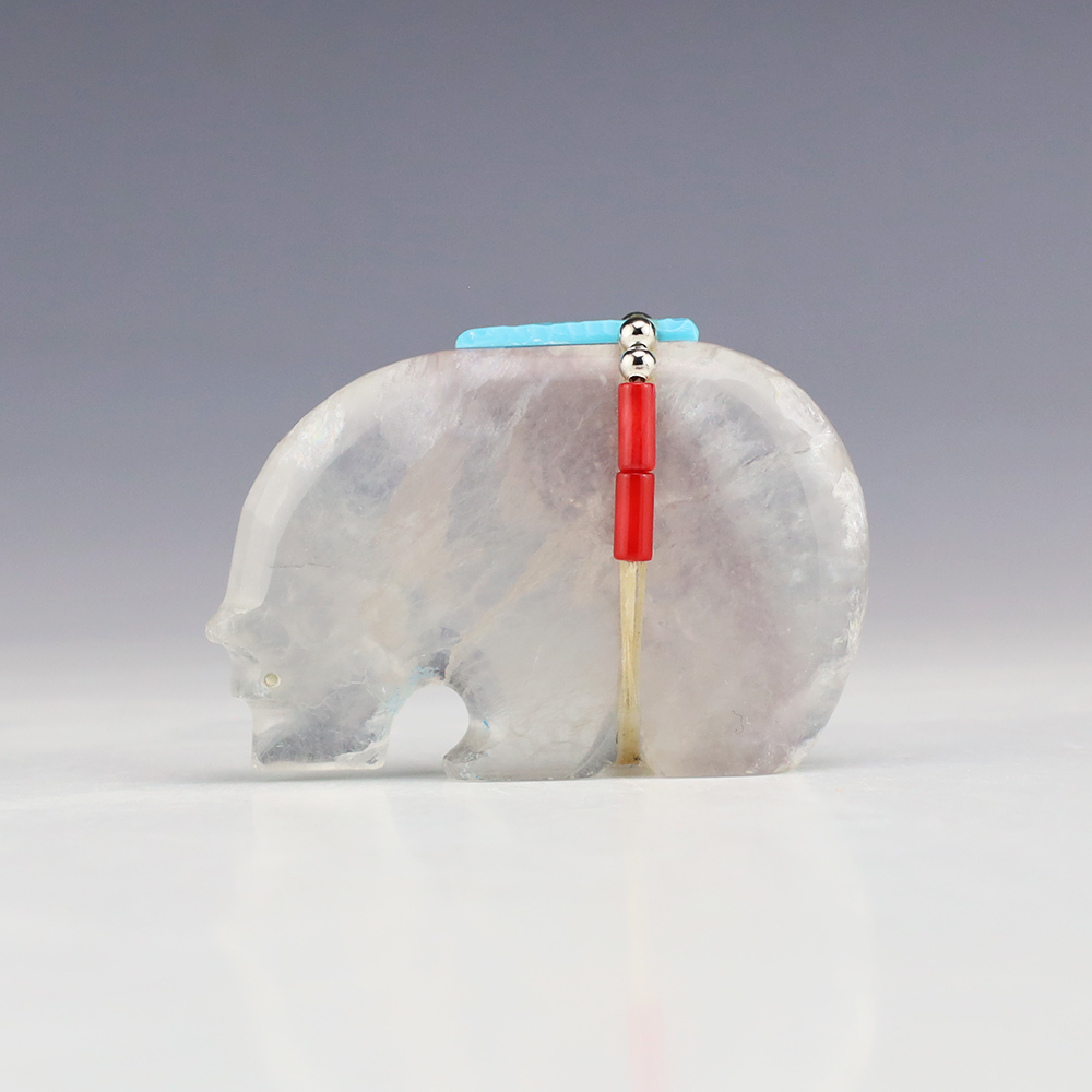 Zuni bear fetishes represent healing and strength. This marvelous bear fetish is made out of Nevada Fluorite by Zuni artist Todd Westika. It is bundled with Turquoise, Coral, and silver. This fetish showcases the graceful lines and sculptural quality of Todd’s carvings. A great addition to your Native American or Zuni fetish collection. Signed