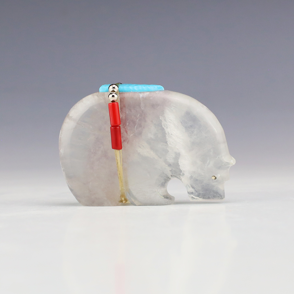 Zuni bear fetishes represent healing and strength. This marvelous bear fetish is made out of Nevada Fluorite by Zuni artist Todd Westika. It is bundled with Turquoise, Coral, and silver. This fetish showcases the graceful lines and sculptural quality of Todd’s carvings. A great addition to your Native American or Zuni fetish collection. Signed