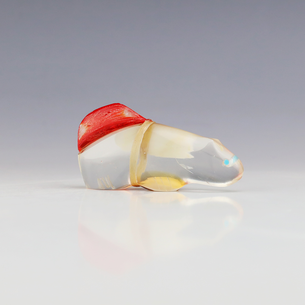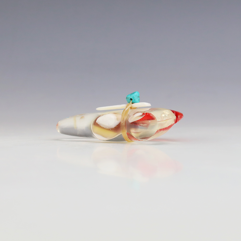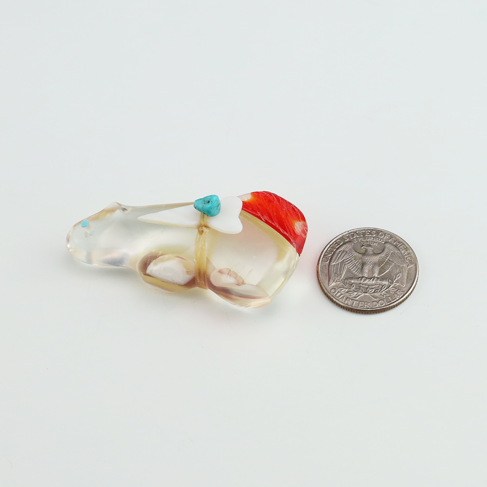 Zuni fetish artists Leland Boone and Daphne Quam hand crafted this wonderful mountain lion out of Glass and bundled it with Mother of Pearl Shell and Turquoise. Zuni mountain lion fetishes represent leadership and resourcefulness. A great addition to your Native American or Zuni fetish collection.