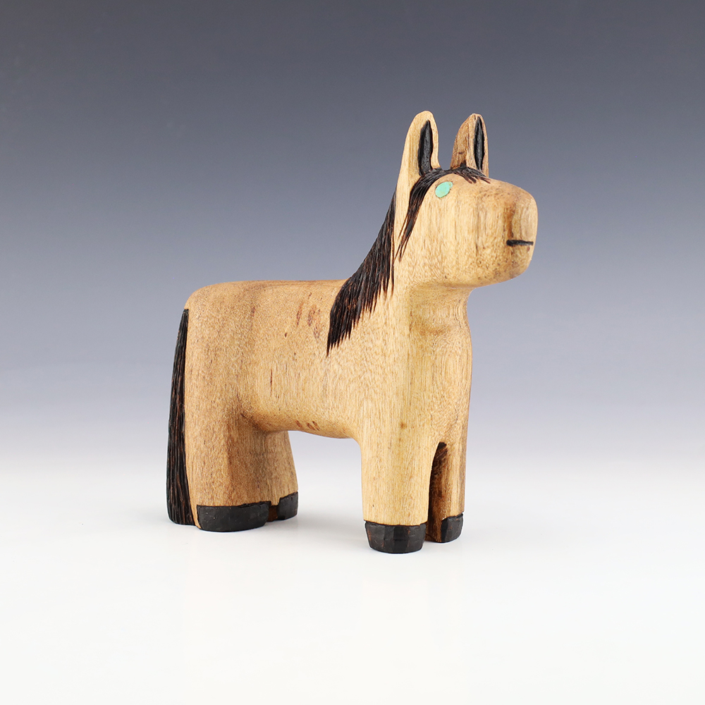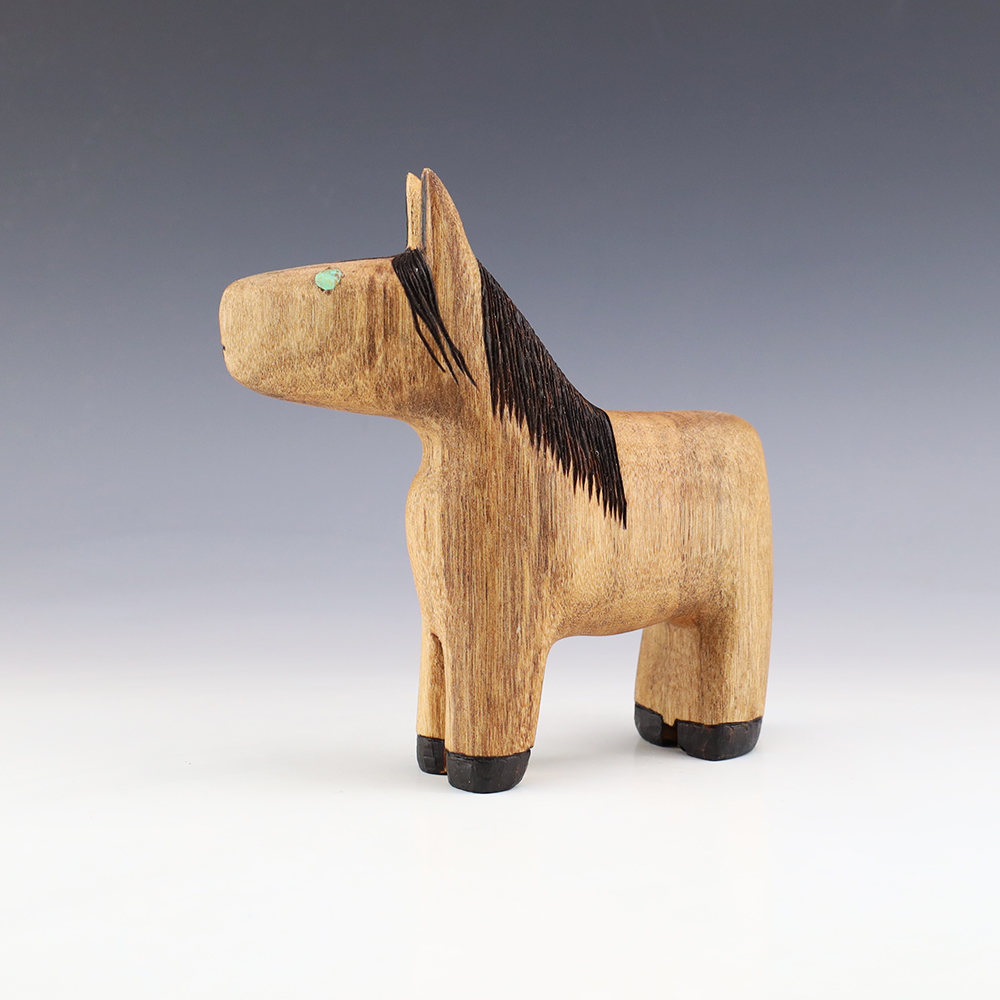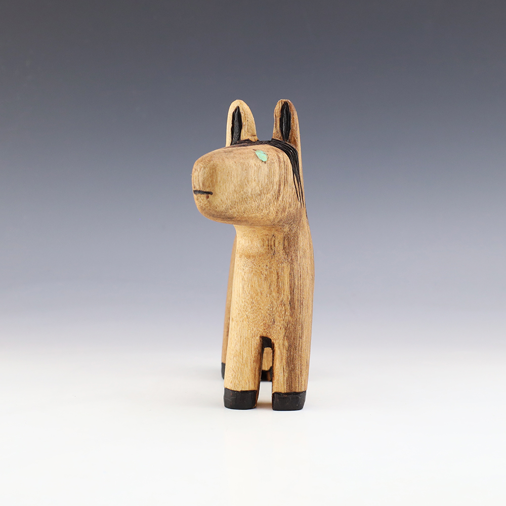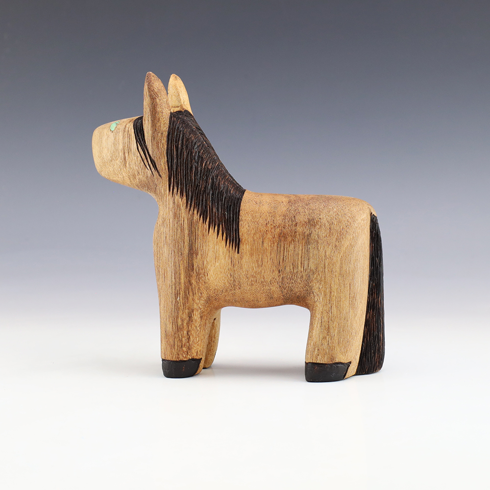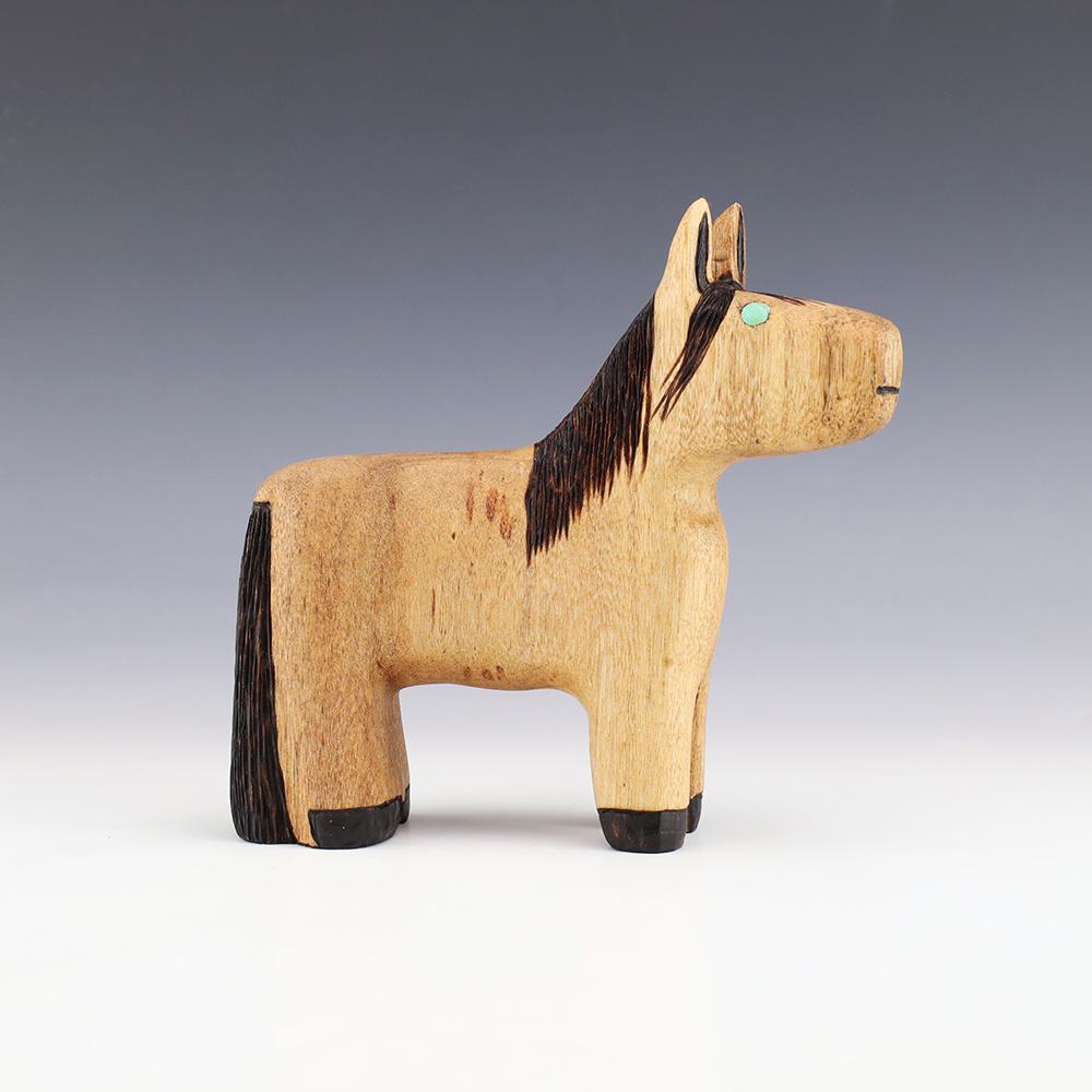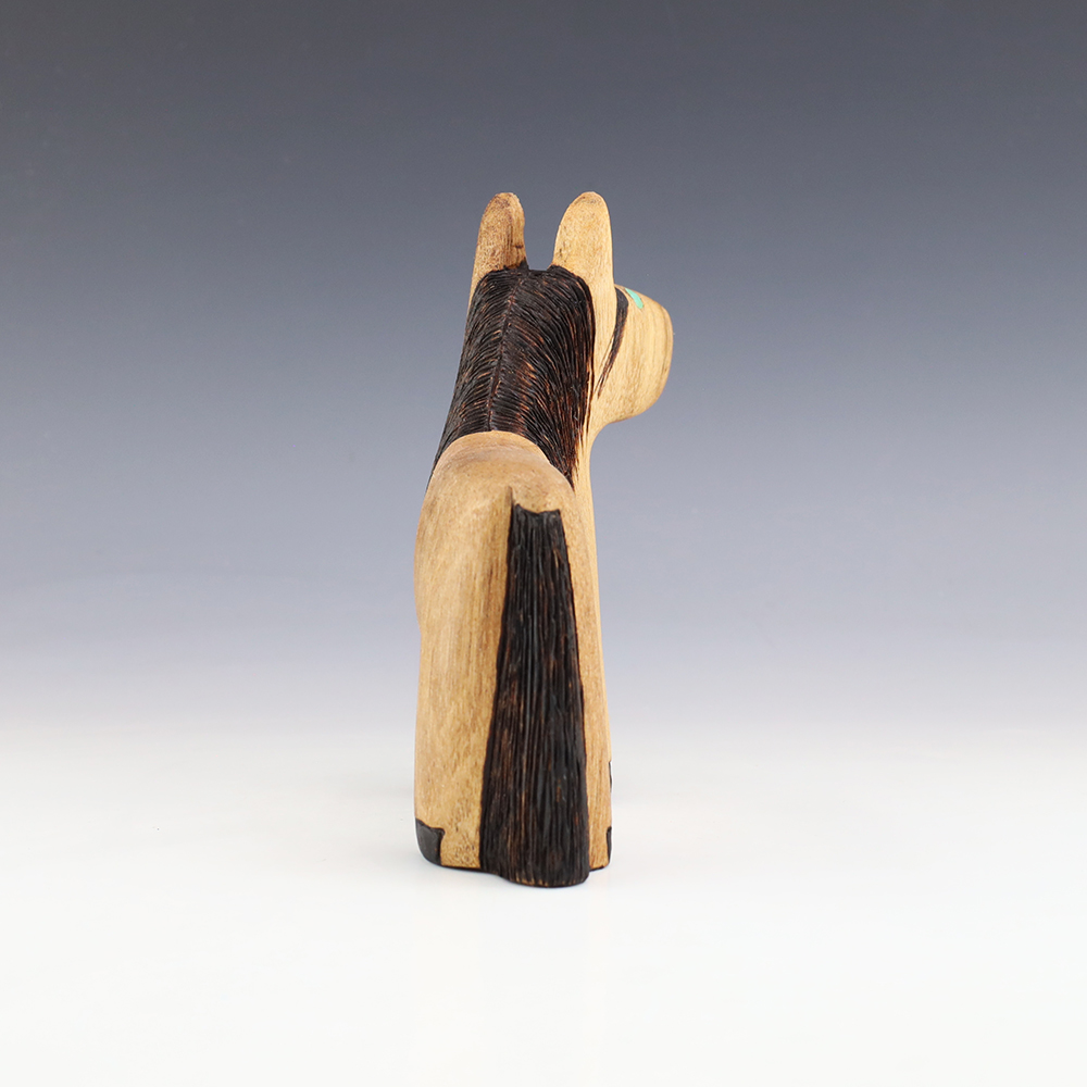 Zuni artist Alan Lewis carved this wonderful horse out of wood. He burns the wood with intricate detail and then stains it with alluring colors. A wonderful addition to your Native American art collection. Signed
