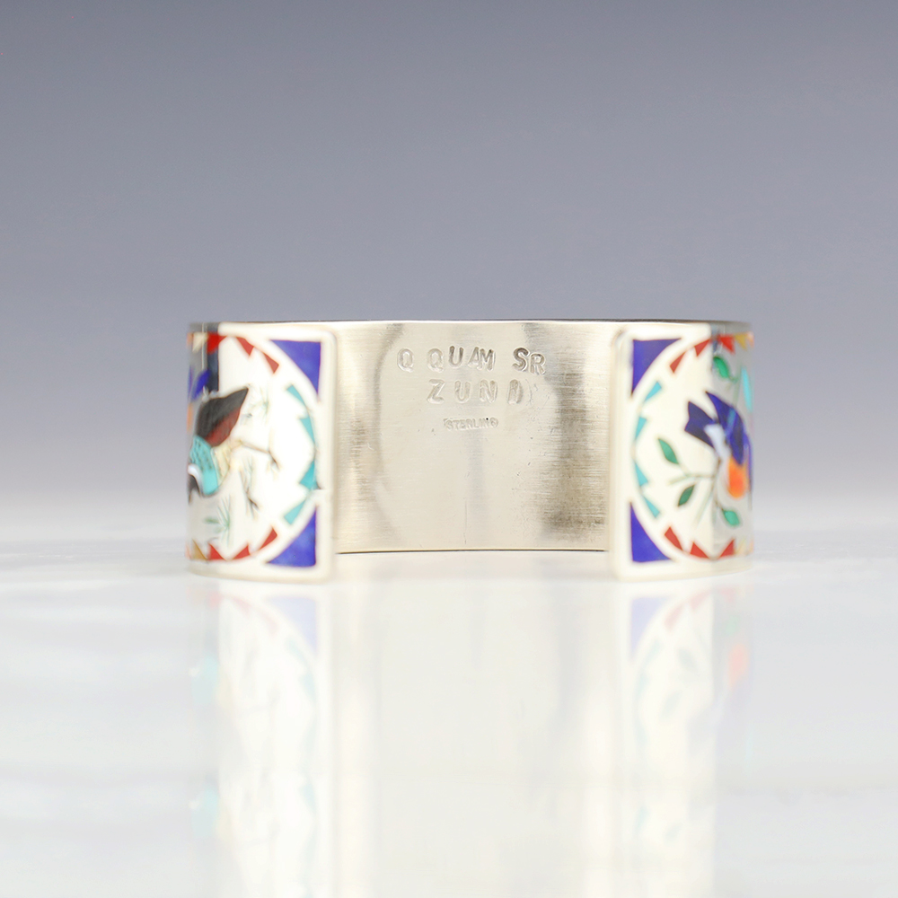 Zuni jewelry makers, Nancy and Sheldon Westika created this exquisite buckle. Made out of sterling silver and inlaid with natural Kingman Turquoise and Mother of Pearl Shell. Zuni artists are known for their lapidary work. The Westikas have been making jewelry since the 1970’s and they are known for their...