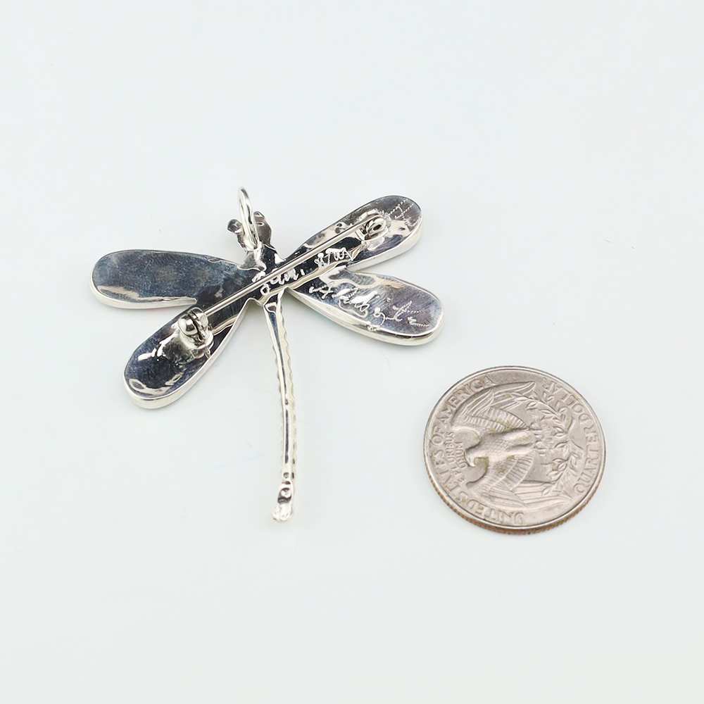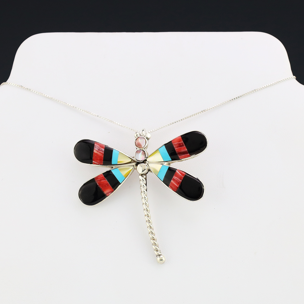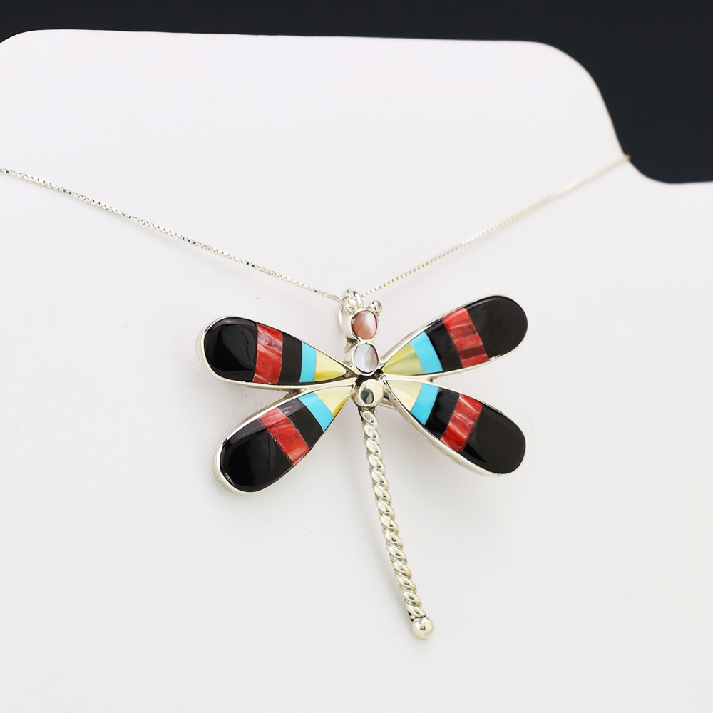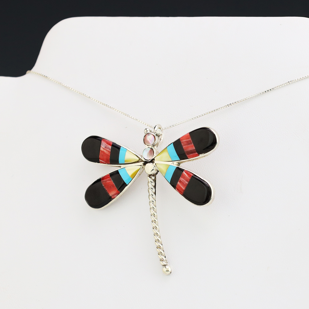 Zuni jeweler Angus Ahiyite hand crafted this lovely dragonfly pendant. Each stone is hand cut, polished, and set into a sterling silver setting. The pendant is inlaid with Turquoise, Mother of Pearl Shell, Jet, and Spiny Oyster. Weighs 8 grams. Signed (Chain not included)