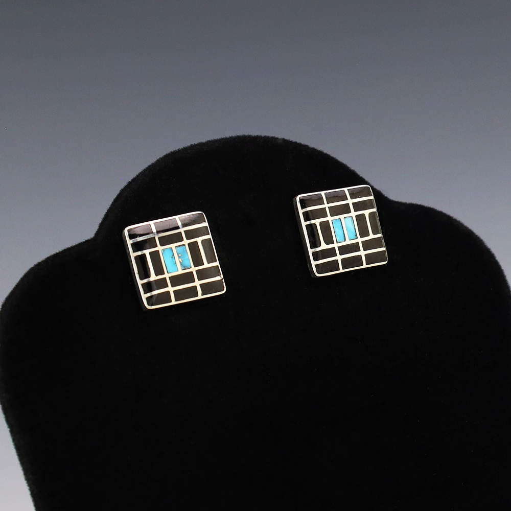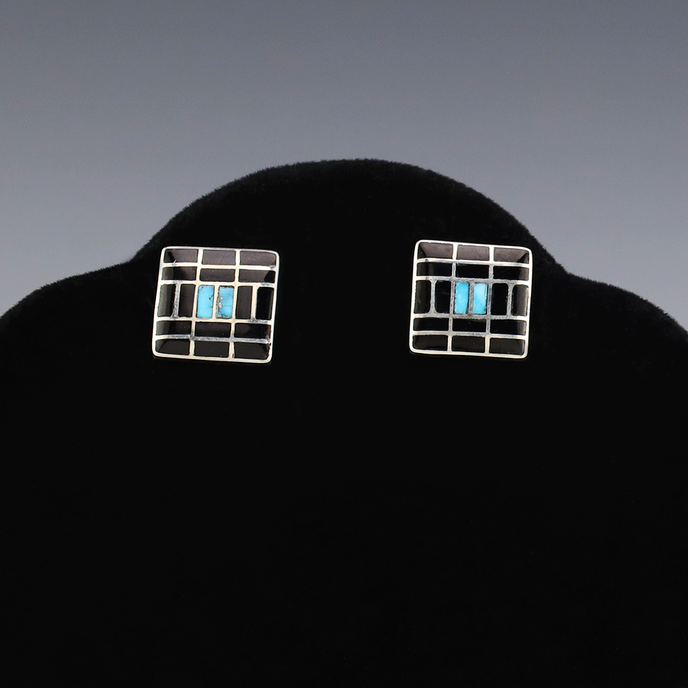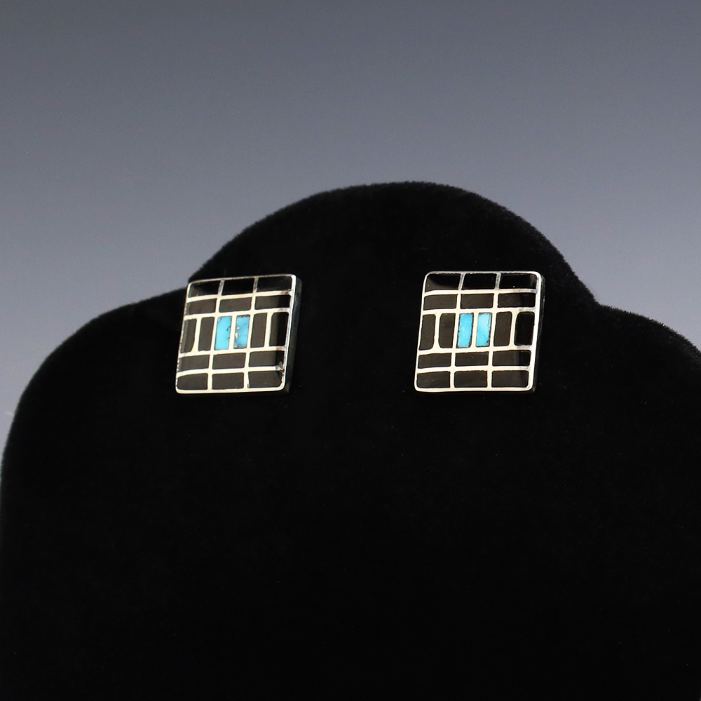 Zuni artists Nancy and Sheldon Westika created these lovely earrings. The Westikas have been making jewelry since the 1970’s and they are known for their fine inlay work. Made out of sterling silver and inlaid with natural Kingman Turquoise and Jet. Weighs 6 grams. Signed