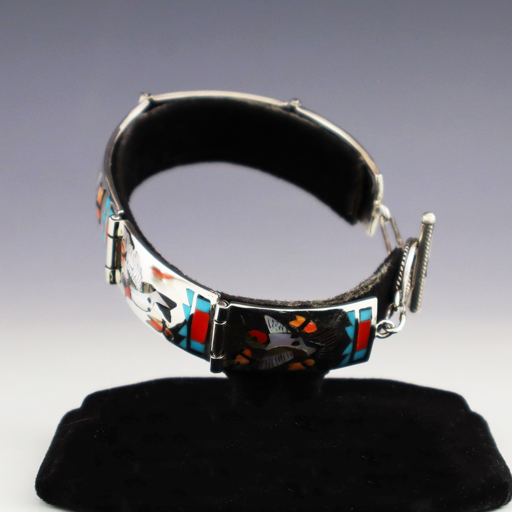 Zuni jewelry makers, Nancy and Sheldon Westika created this exquisite buckle. Made out of sterling silver and inlaid with natural Kingman Turquoise and Mother of Pearl Shell. Zuni artists are known for their lapidary work. The Westikas have been making jewelry since the 1970’s and they are known for their...