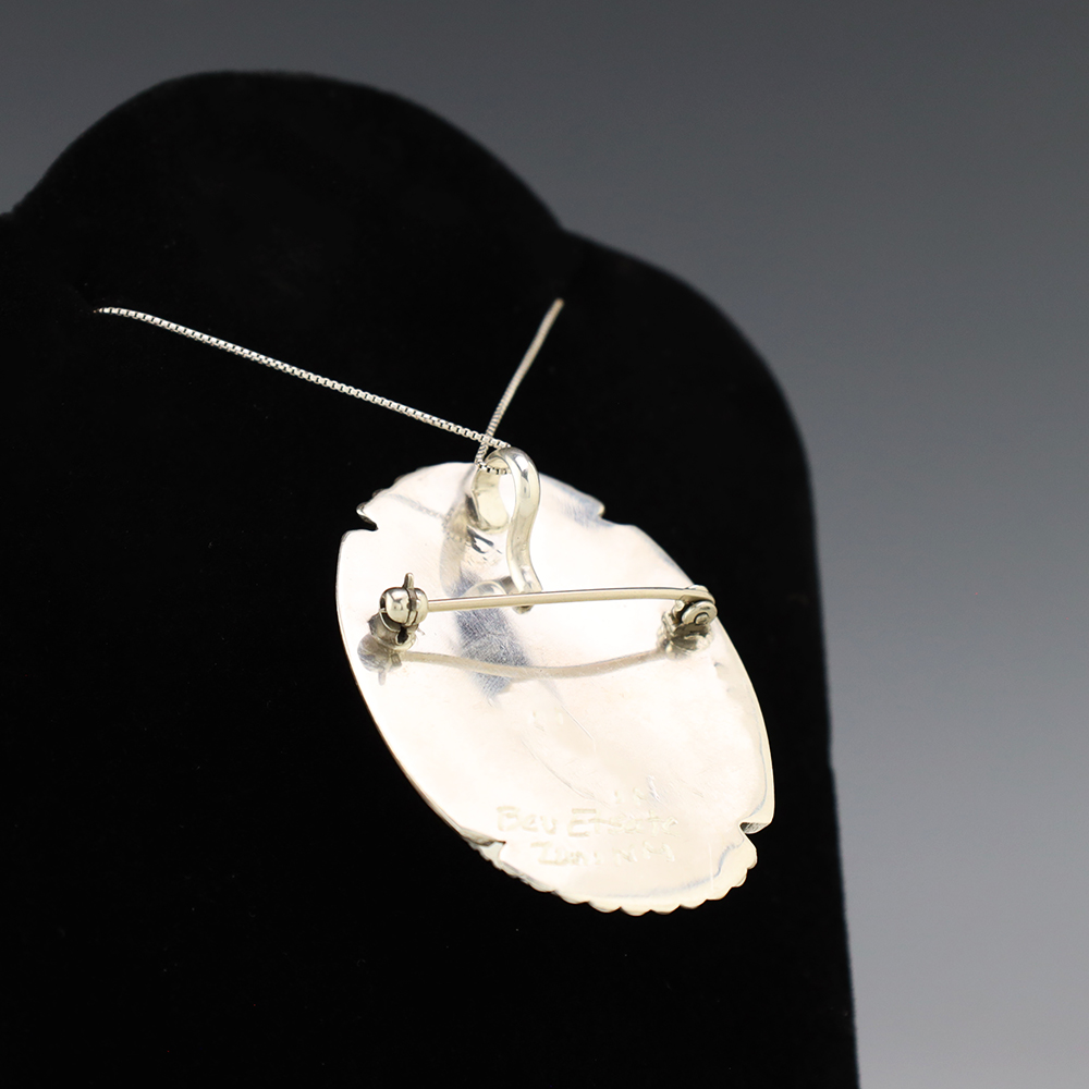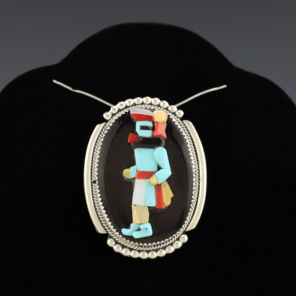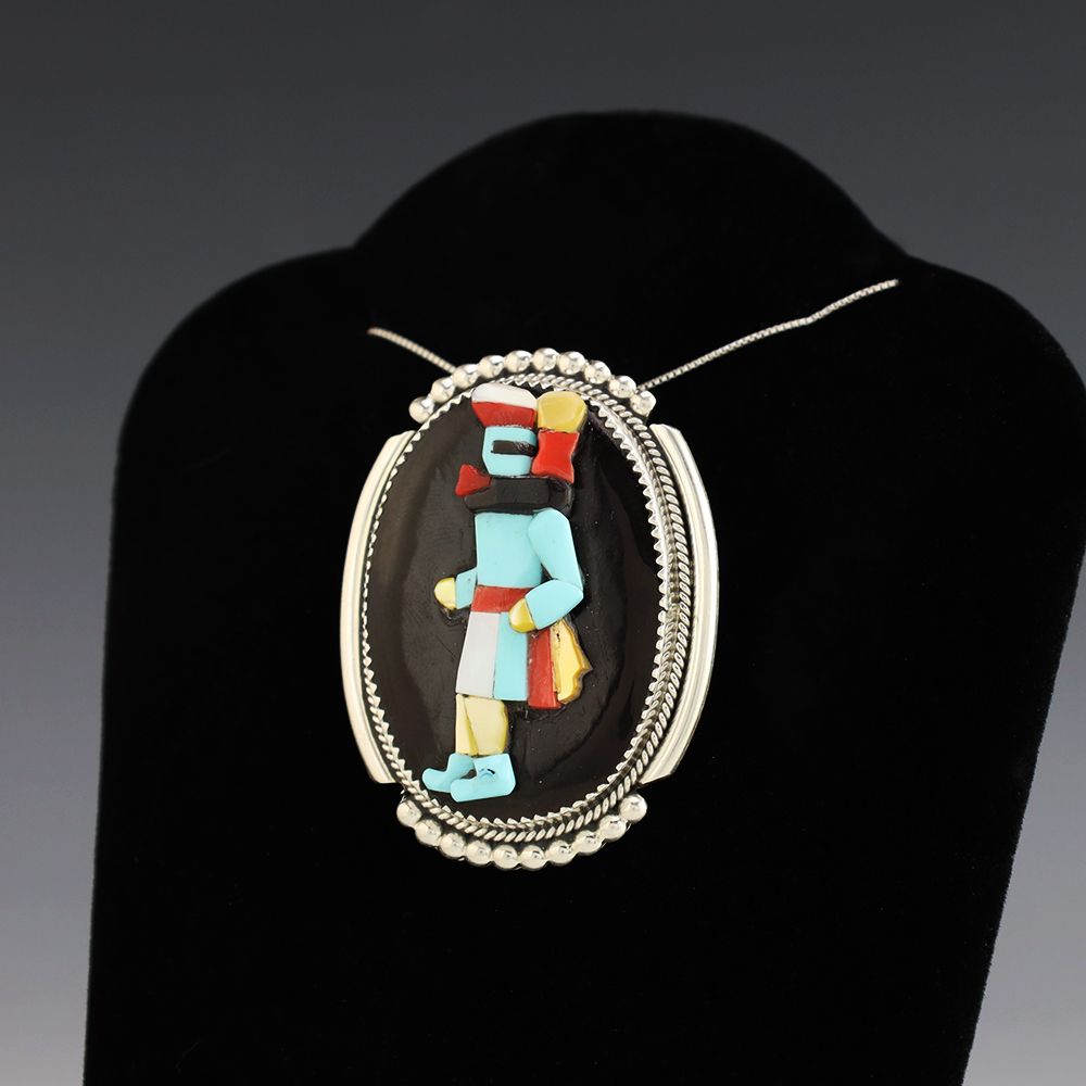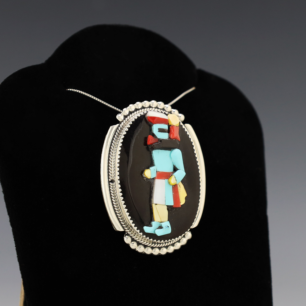 Zuni artist Beverly Etsate made this exquisite kachina pendant. Zuni artists are known for their fine lapidary skills. Each stone is hand cut, polished, and set into a sterling silver setting. The pendant is inlaid with Mother of Pearl Shell, Coral, Turquoise, and Jet. It can also be worn as a pin. Weighs 16 grams. Signed. (Chain not included)