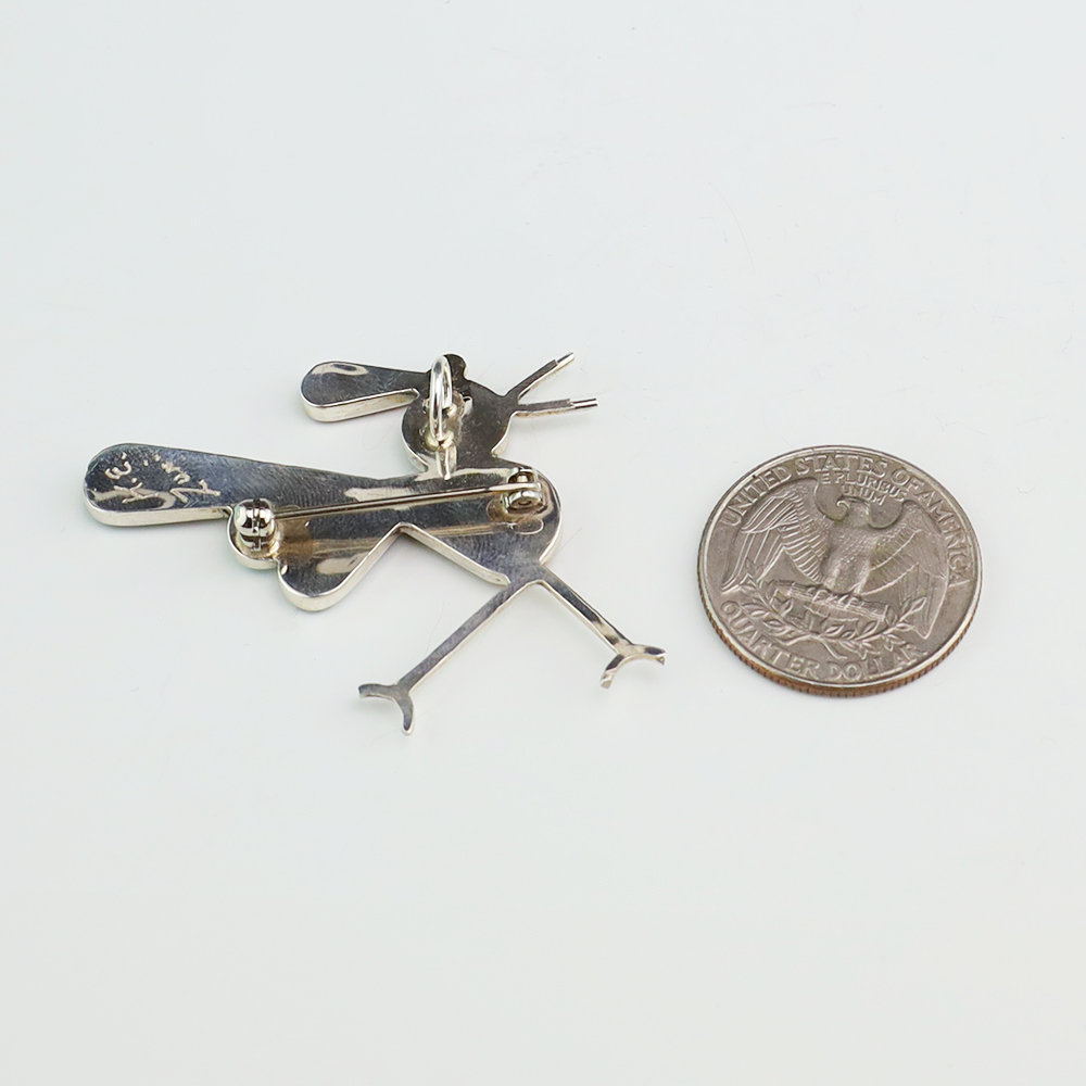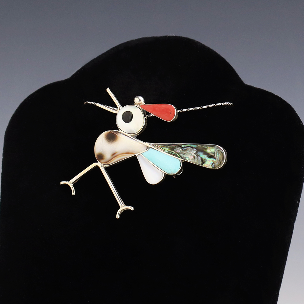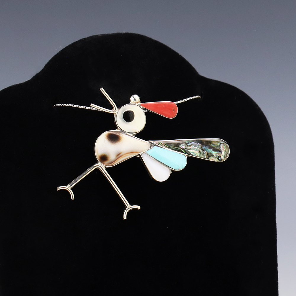 Zuni artist Kelly Edaakie hand made this wonderful Roadrunner pendant. The sterling silver pendant is inlaid with Turquoise, Abalone, Jet, Coral, Cowry Shell, and Mother of Pearl Shell. Amazing detail! It can also be worn as a pin. Weighs 4 grams. (Chain not included) Signed