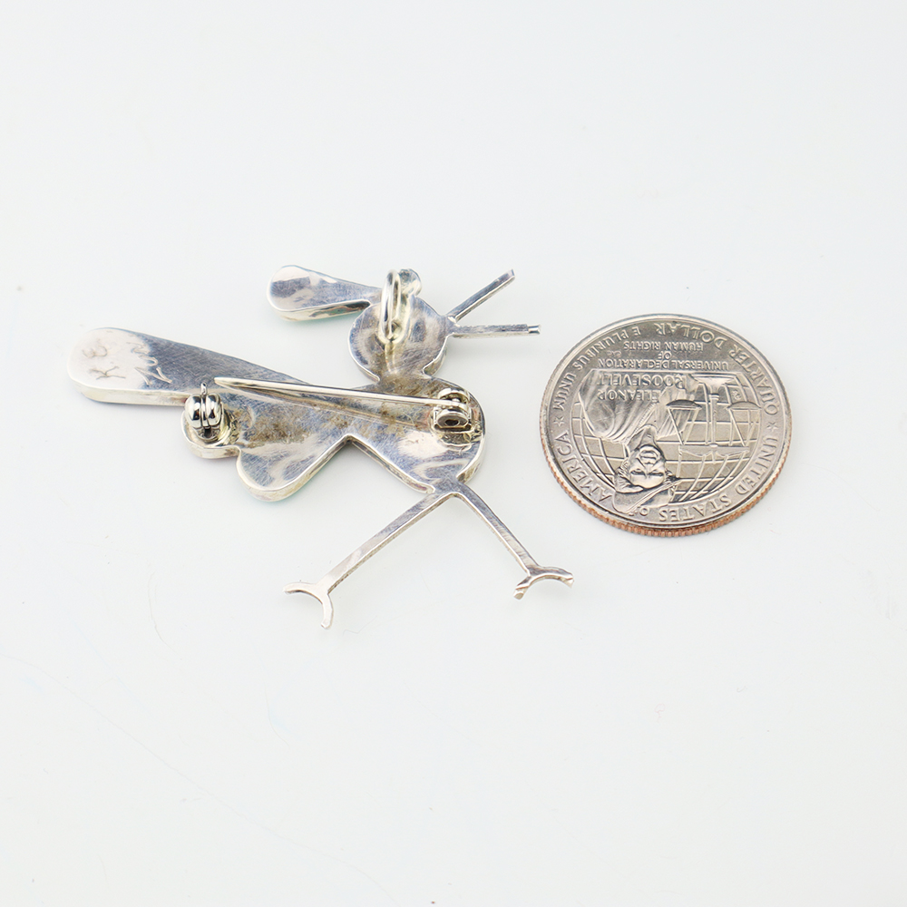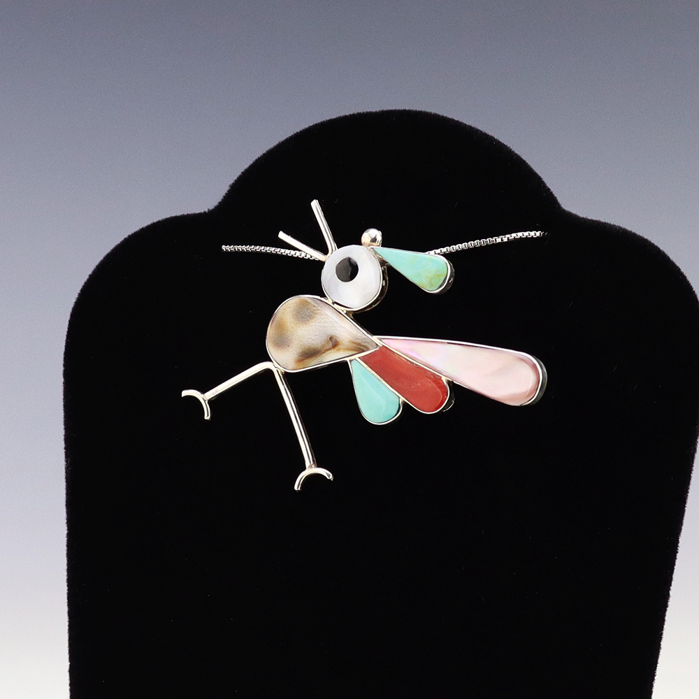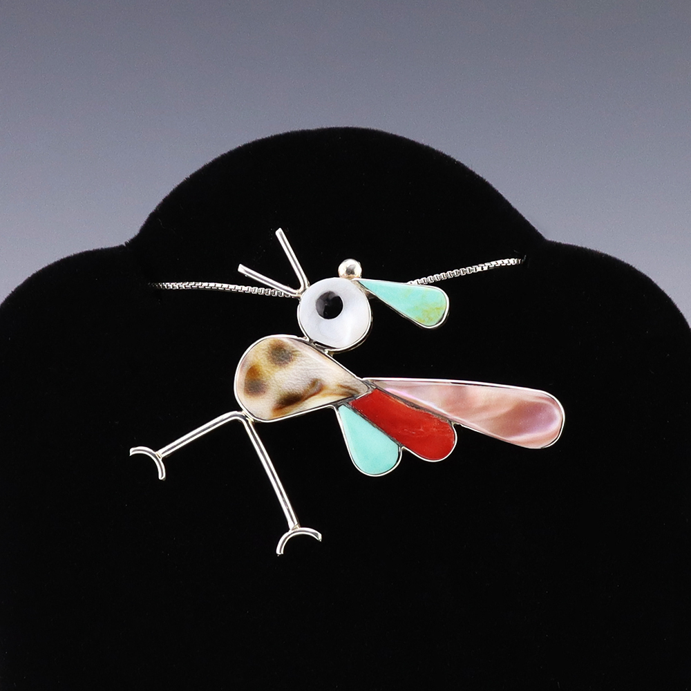Zuni artist Kelly Edaakie hand made this wonderful Roadrunner pendant. The sterling silver pendant is inlaid with Turquoise, Pink Mussel, Jet, Coral, Cowry Shell, and Mother of Pearl Shell. Amazing detail! It can also be worn as a pin. Weighs 4 grams. (Chain not included) Signed