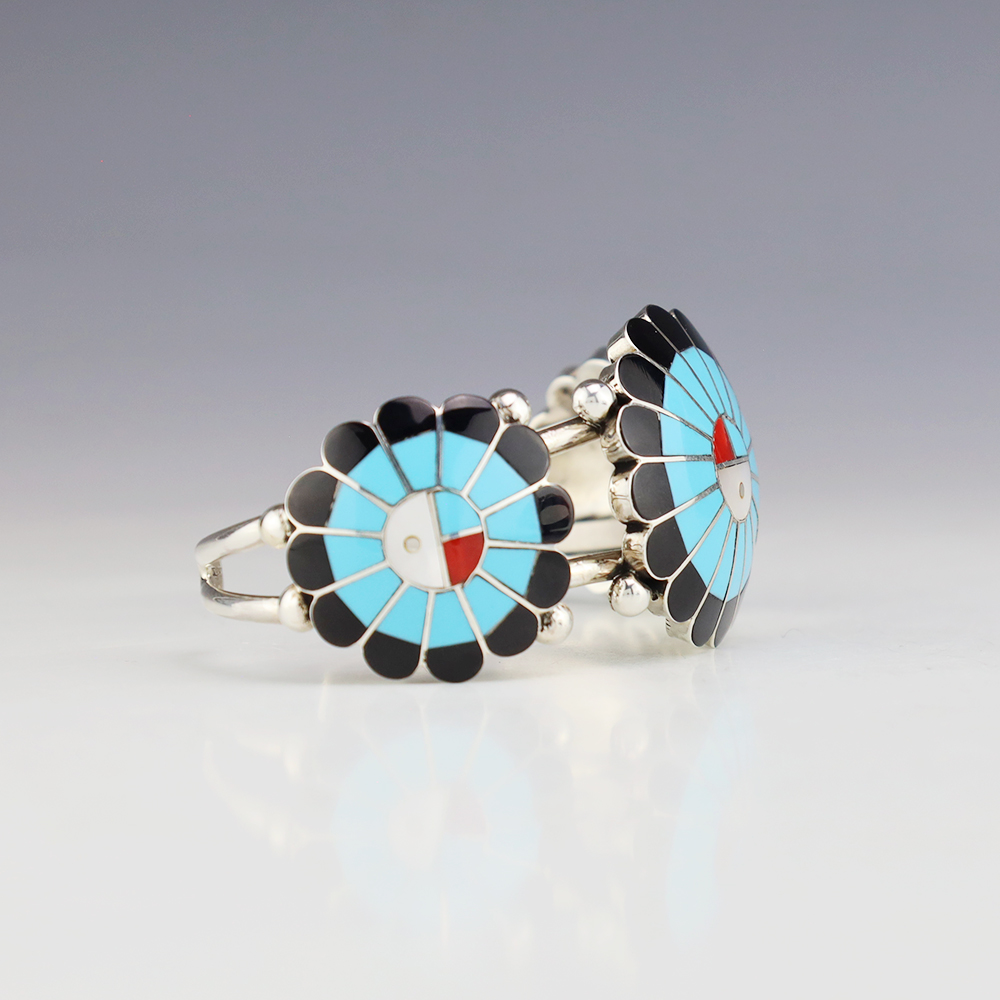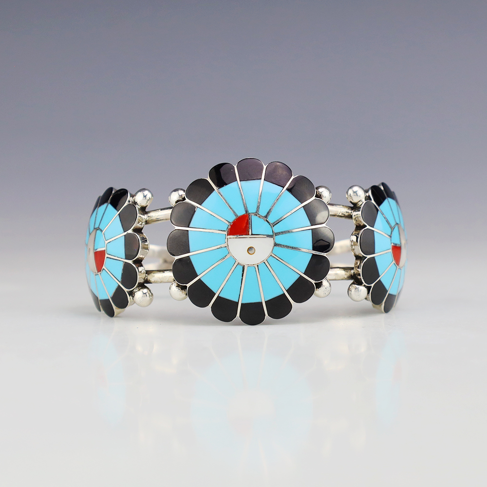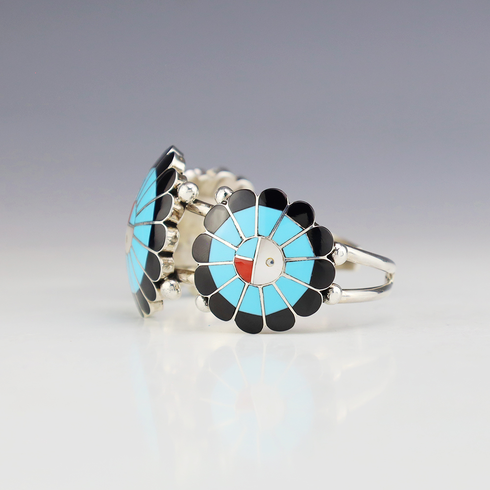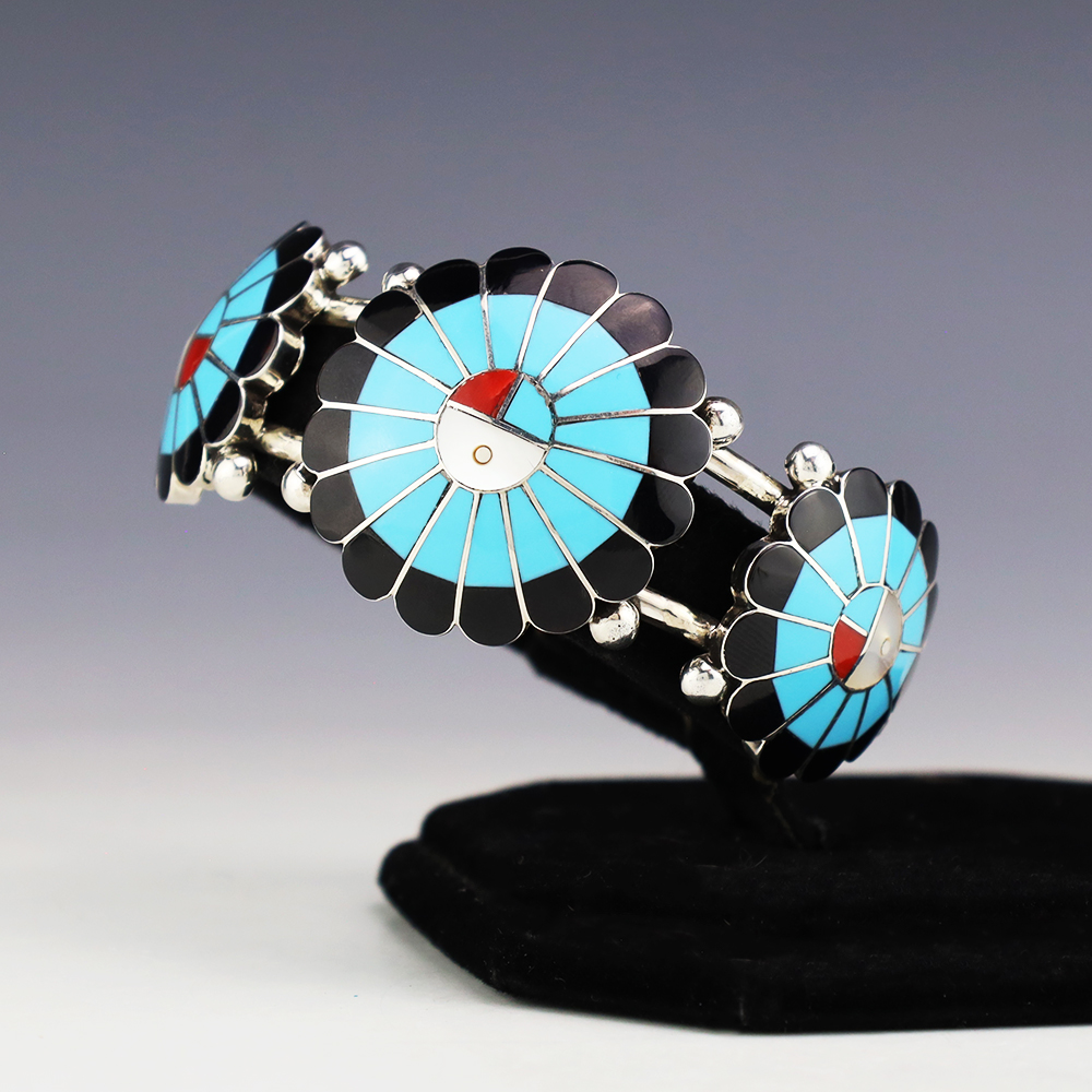Zuni artists Fred and Denise Suitza made this lovely Sun Face bracelet. Zuni artists are known for their fine lapidary skills. Each stone is hand cut, polished, and set into a sterling silver setting. The bracelet is sterling silver and inlaid with Turquoise, Jet, Coral, and Mother of Pearl Shell. For the Zunis, the Sun symbolizes abundance, positive energy, happiness and peace. Weighs 36 grams. Signed.
