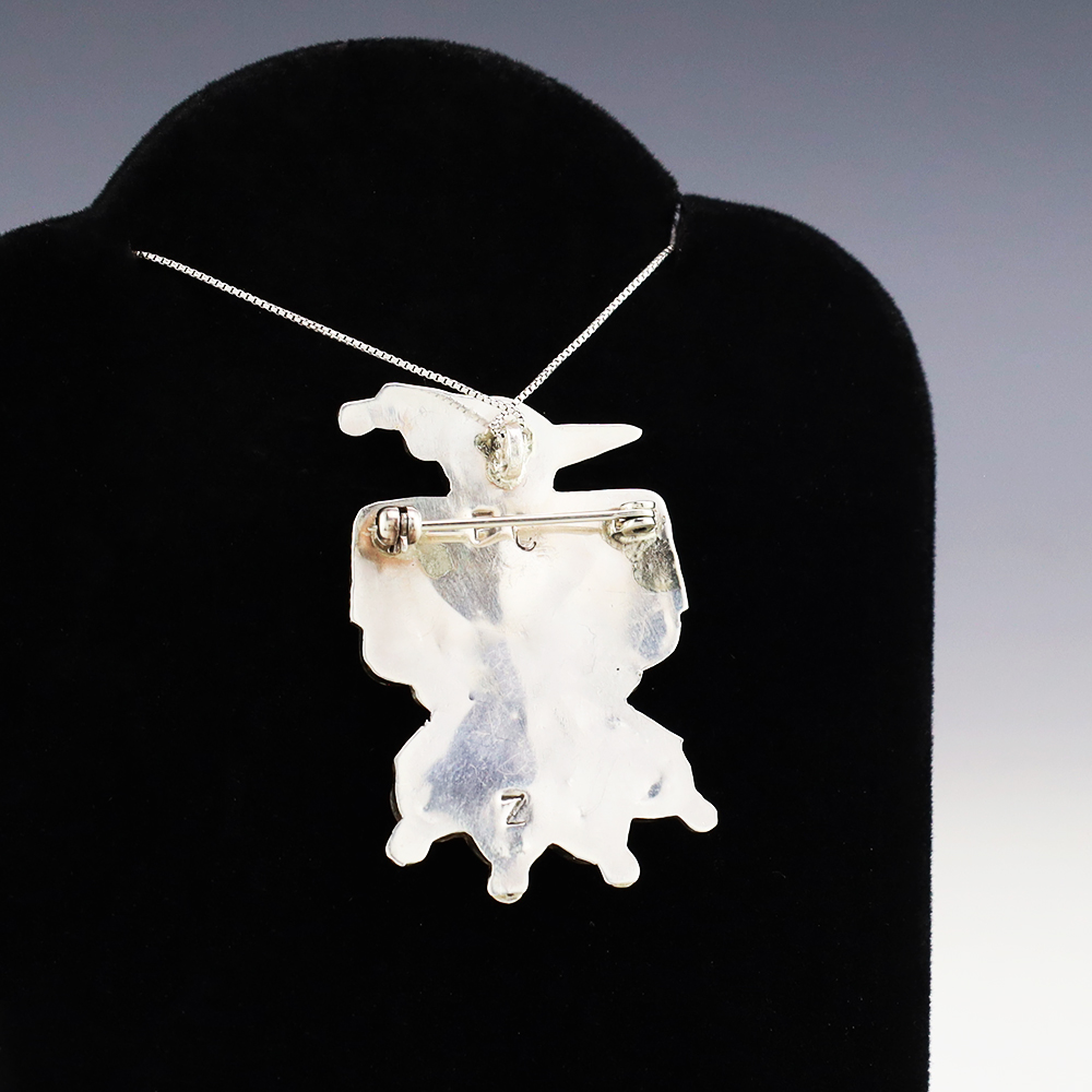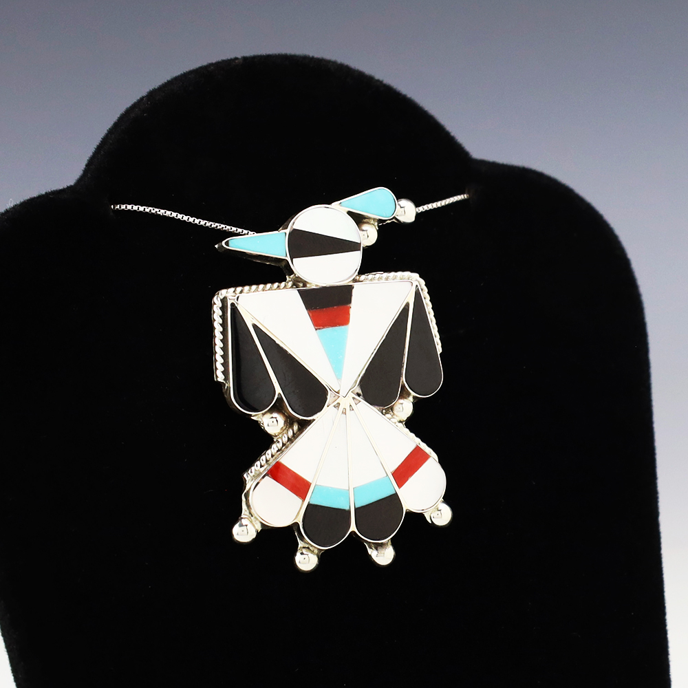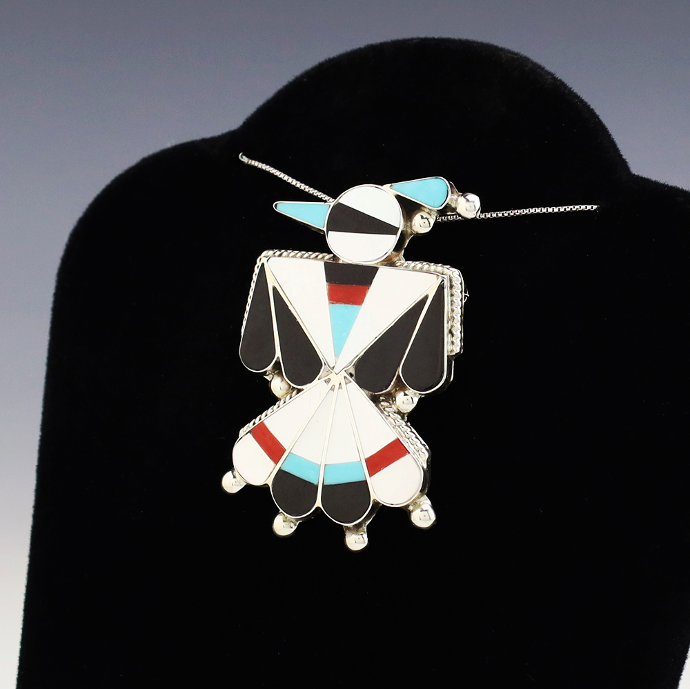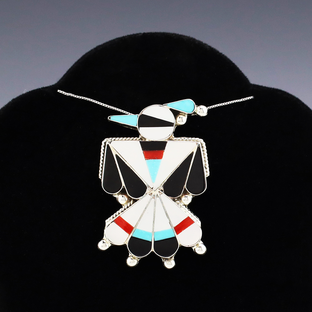 Zuni artist Fabian Cellicion made this wonderful Thunderbird pendant. The pendant is sterling silver and inlaid with Jet, Coral, Turquoise, and Mother of Pearl Shell. Can also be worn as a pin. Weighs 10 grams. Signed. (Chain not included)