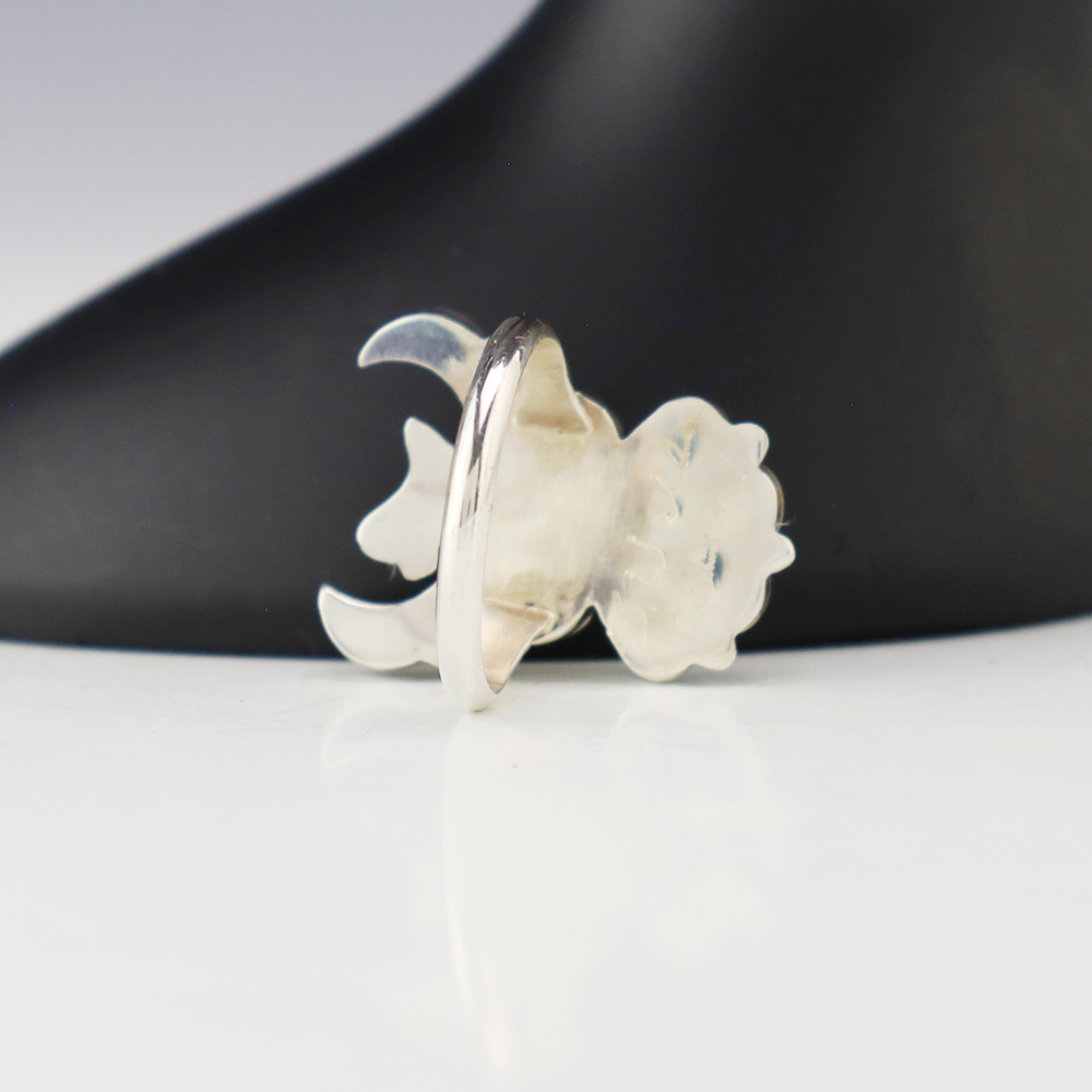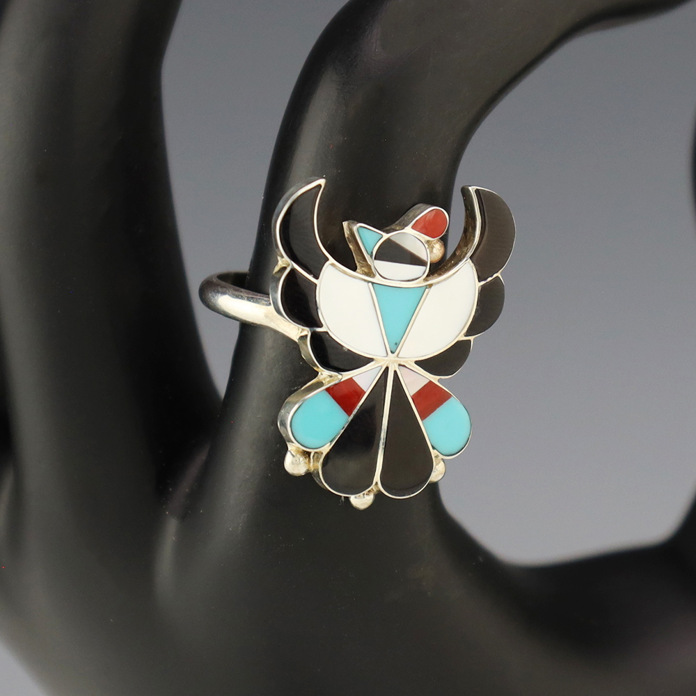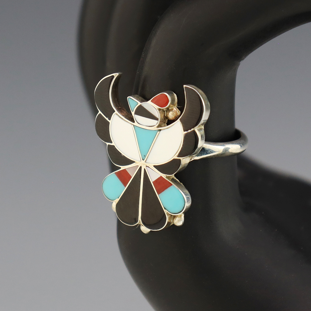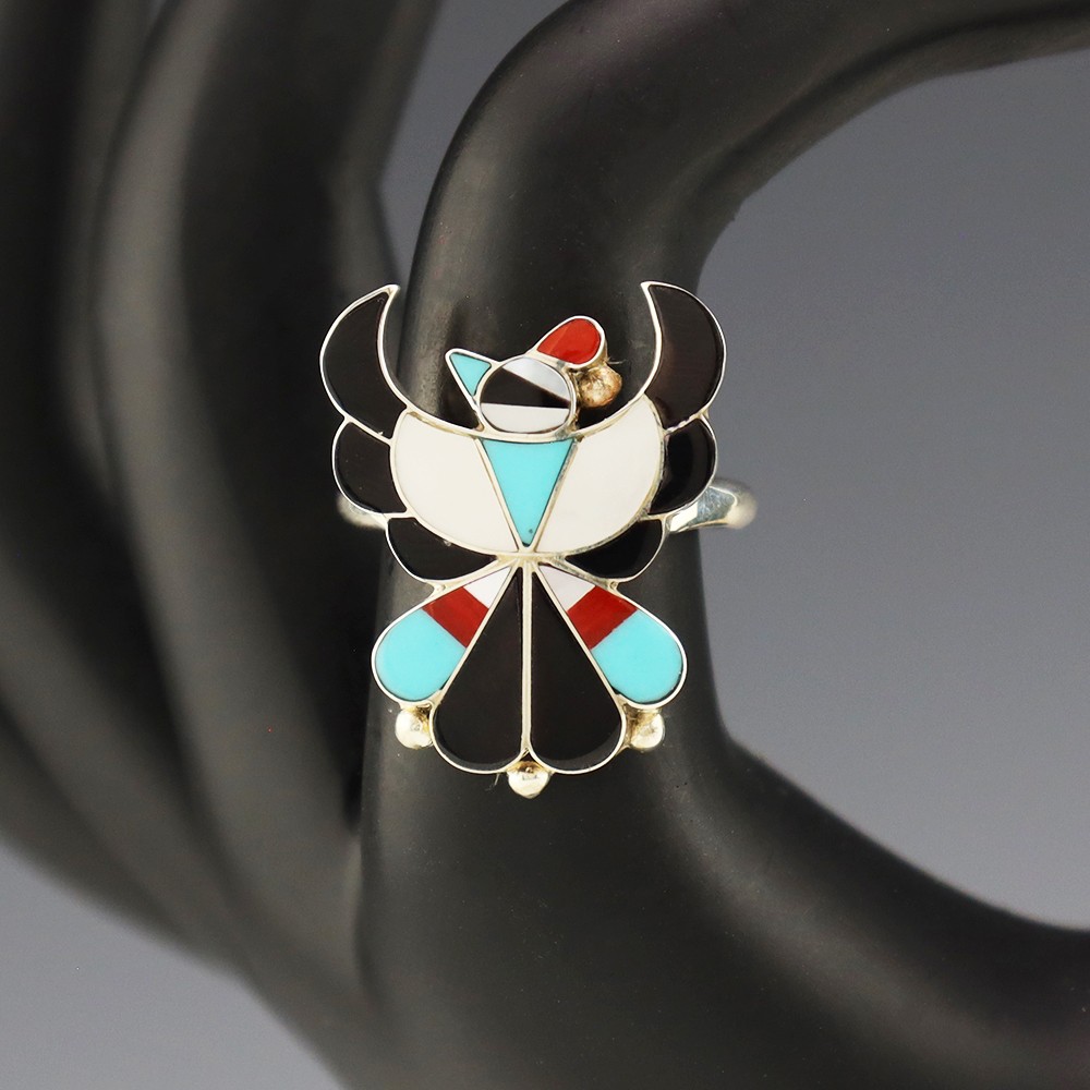 Zuni artist Breon Wallace made this fabulous Thunderbird ring. Zuni artists are known for their fine lapidary skills. Each stone is hand cut, polished, and set into a sterling silver setting. The ring is inlaid with Turquoise, Mother of Pearl Shell, Coral, and Jet. Weighs 4 grams. Size 7 1/2. Signed