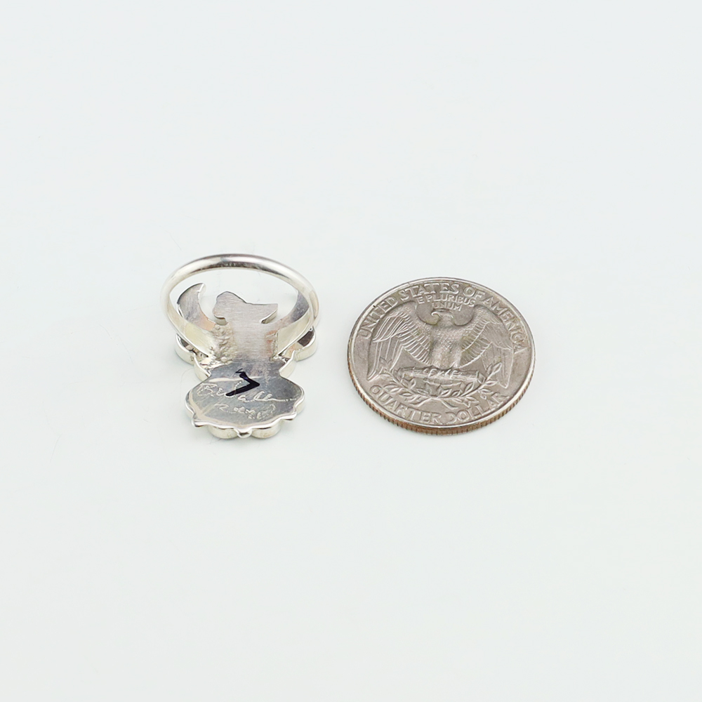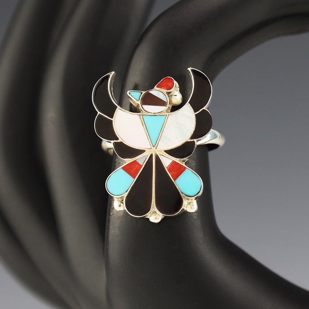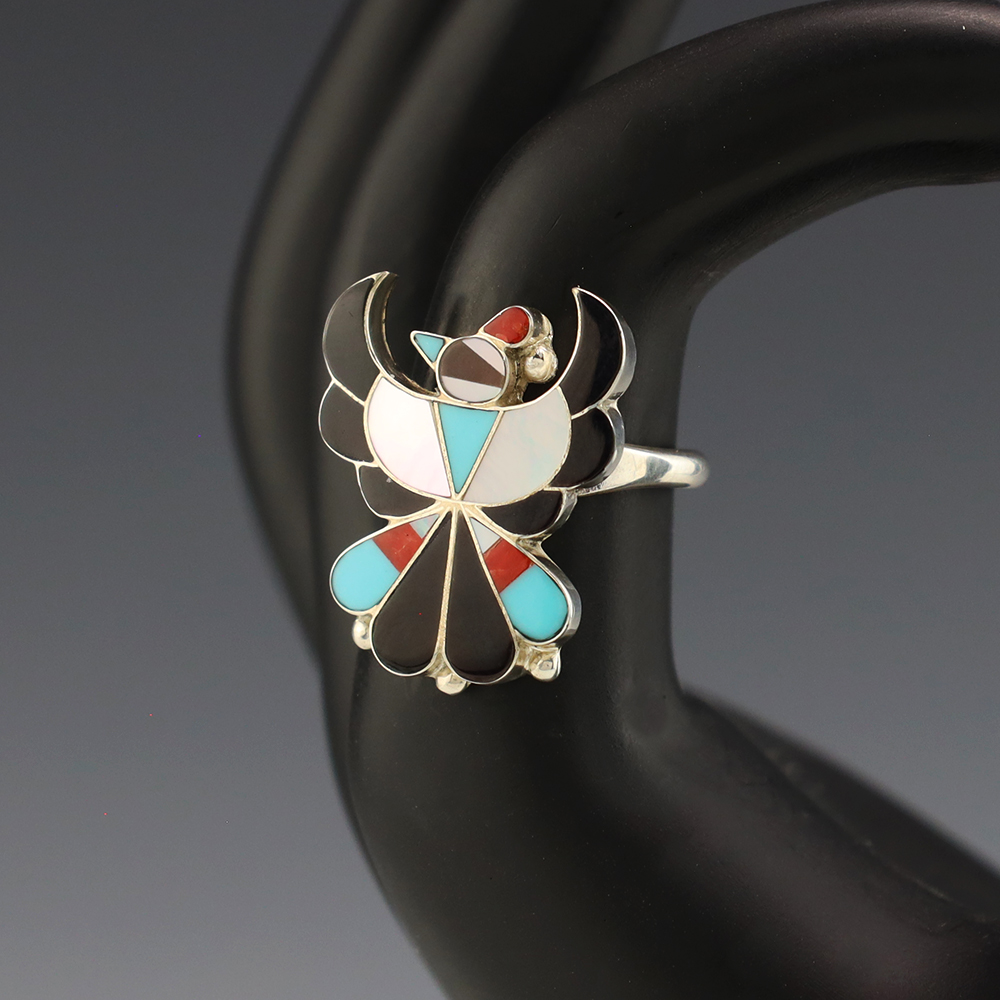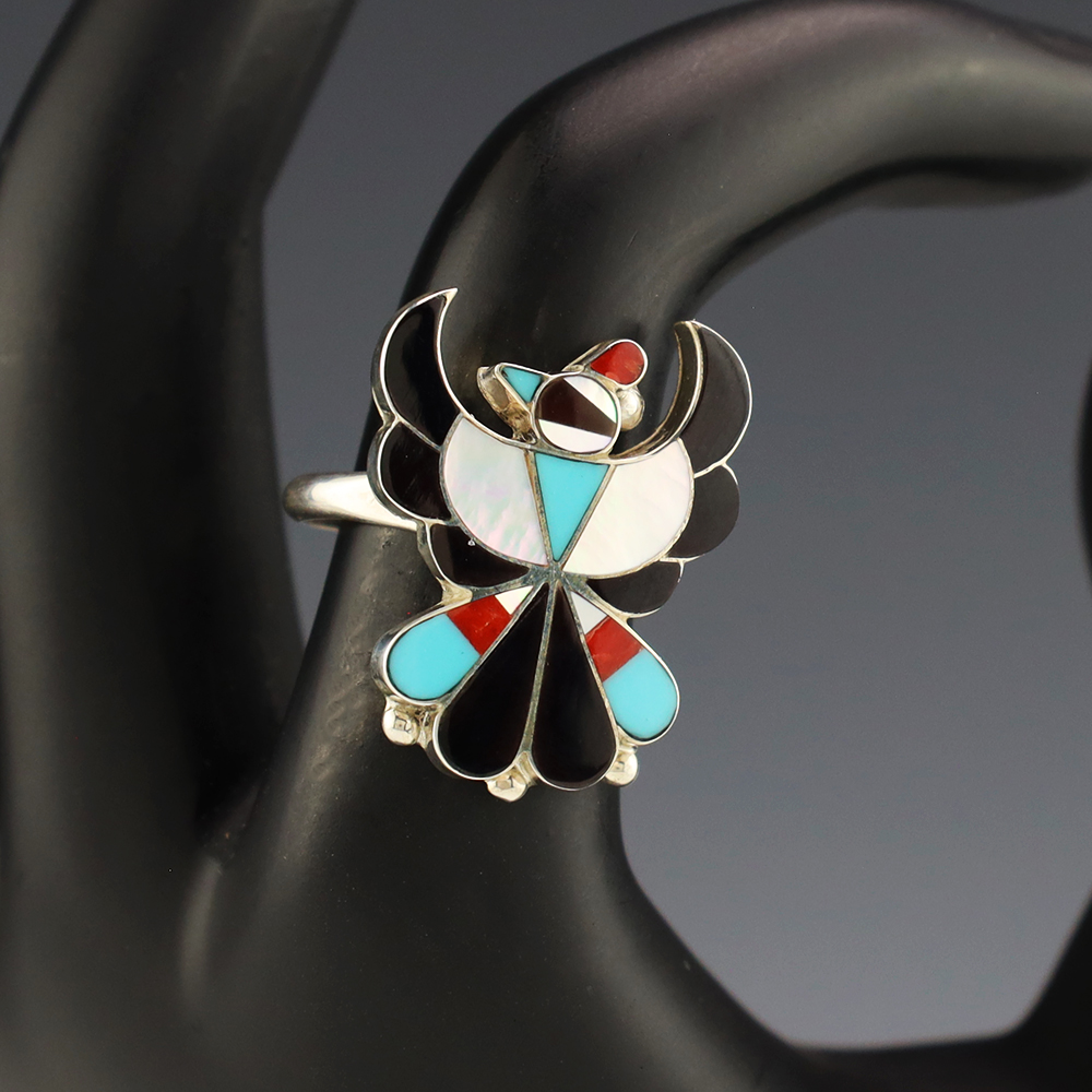 Zuni artist Breon Wallace made this fabulous Thunderbird ring. Zuni artists are known for their fine lapidary skills. Each stone is hand cut, polished, and set into a sterling silver setting. The ring is inlaid with Turquoise, Mother of Pearl Shell, Coral, and Jet. Weighs 4 grams. Size 7. Signed
