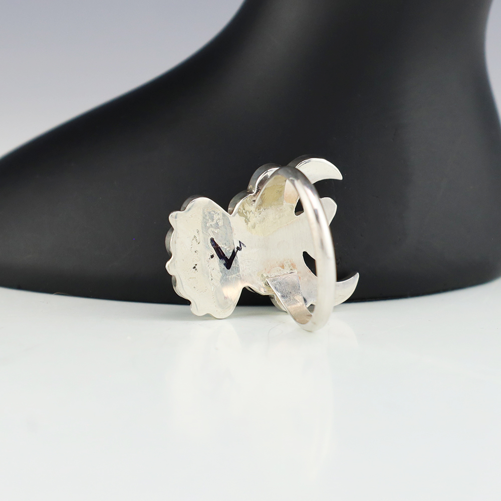 Zuni jewelry makers, Nancy and Sheldon Westika hand crafted this magnificent ring. Made out of sterling silver and inlaid with Kingman Turquoise and Jet. Zuni artists are known for their lapidary work. The Westikas have been making jewelry since the 1970’s and they are known for their fine inlay work. ...