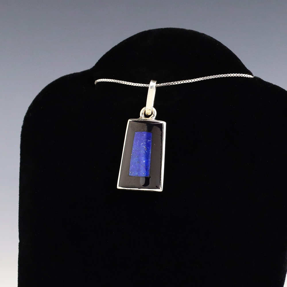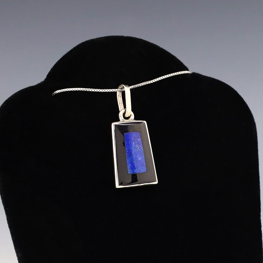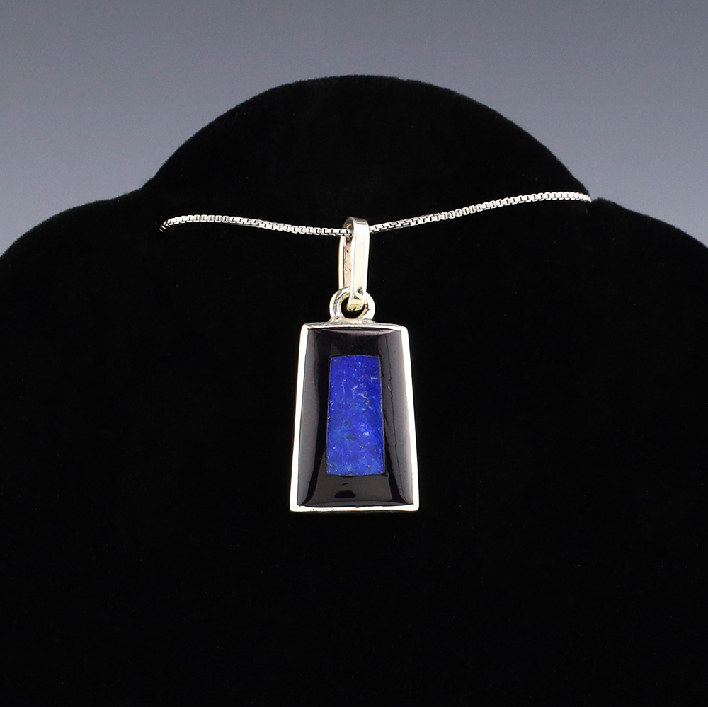 Zuni jeweler Harlan Coonsis hand made this marvelous pendant. The sterling silver pendant is intricately inlaid with Lapis and Jet. Weighs 4 grams. (Chain not included) Signed
