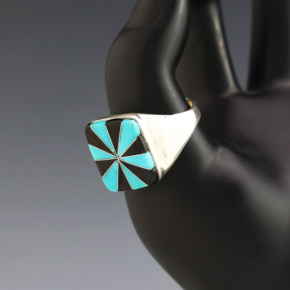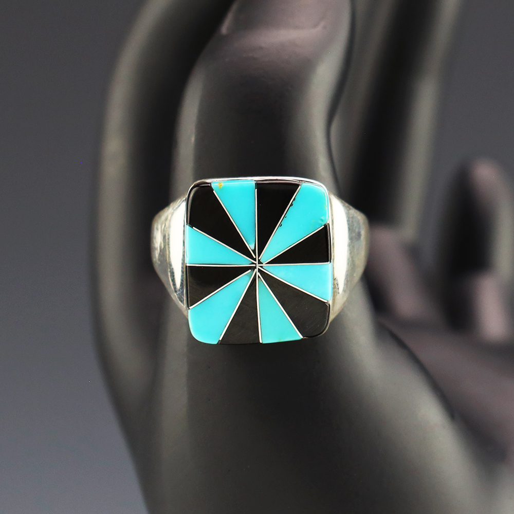 Zuni jewelry makers, Nancy and Sheldon Westika hand crafted this magnificent ring. Made out of sterling silver and inlaid with Kingman Turquoise and Jet. Zuni artists are known for their lapidary work. The Westikas have been making jewelry since the 1970’s and they are known for their fine inlay work. ...