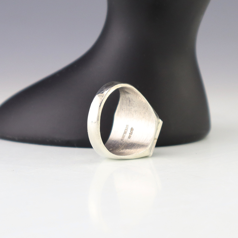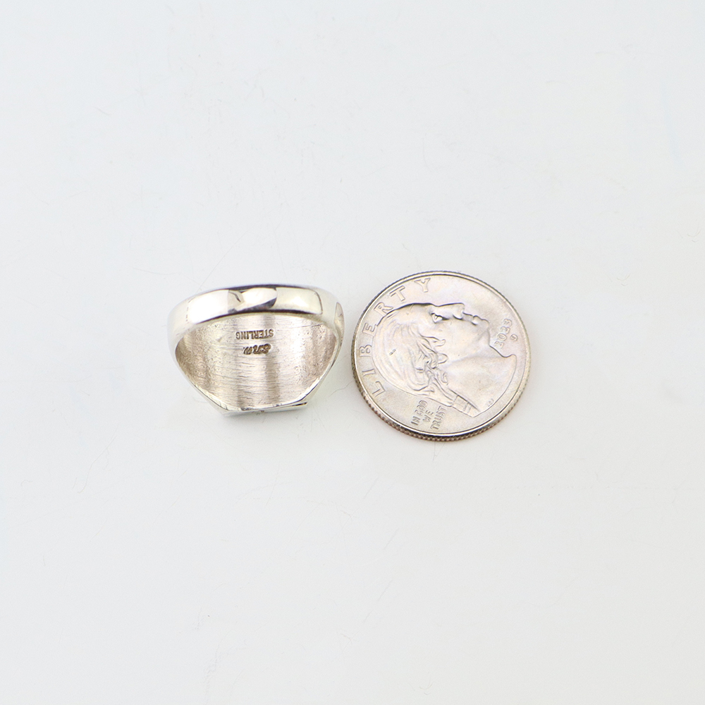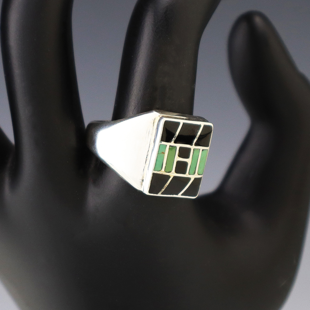 Zuni artists, Nancy and Sheldon Westika made this striking ring. Made out of sterling silver and inlaid with Turquoise and Jet. Zuni artists are known for their lapidary work. The Westikas have been making jewelry since the 1970’s and they are known for their fine inlay work. Signed. Weighs 10 grams. Size 10 1/4.