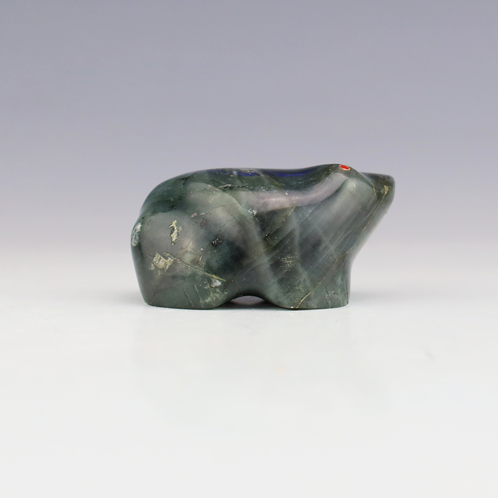 The Bear symbolizes healing and strength. Zuni fetish carver, Bernard Laiwakete hand crafted this fabulous bear fetish. The carving is made out of Orthoceras and has an inlaid Turquoise heartline. (note-the bear stands but is unsteady and would be best on a flat surface that won’t be moved) Signed 1 ...