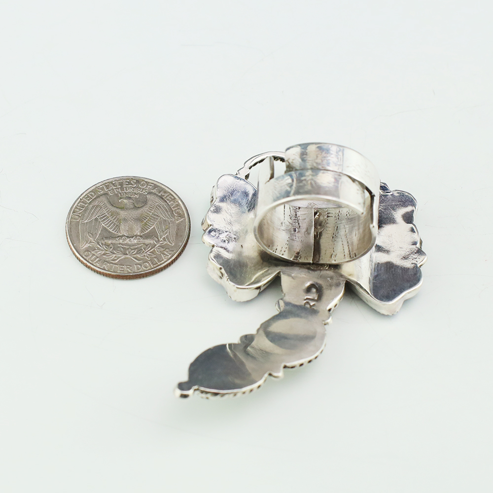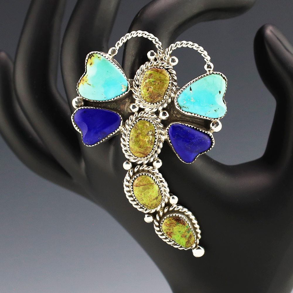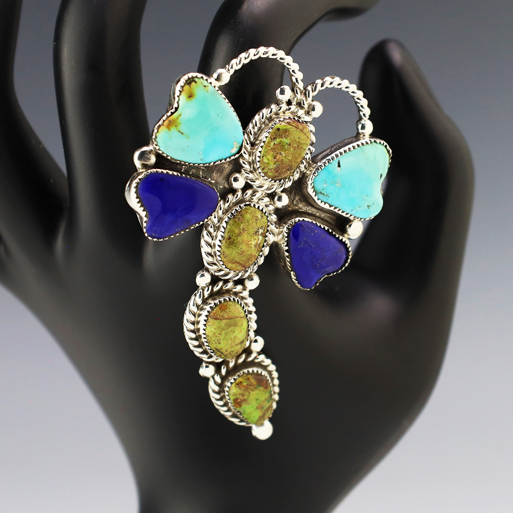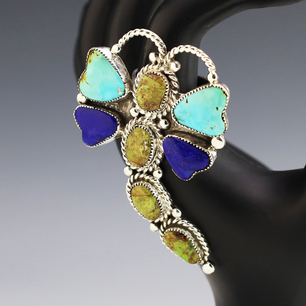 Zuni artist Diane Lonjose hand crafted this gorgeous Dragonfly ring. The ring is sterling silver and is set with Lapis and Royston Turquoise stones. The components are all hand fabricated, and the stones are all natural. Diane comes from a family of Zuni jewelers. She is the daughter of Alice and Duane Quam, and grandchild of Doris and Warren Ondelacy. A timeless beauty that you will enjoy for years to come. Weighs 26 grams. Size is adjustable. Signed.