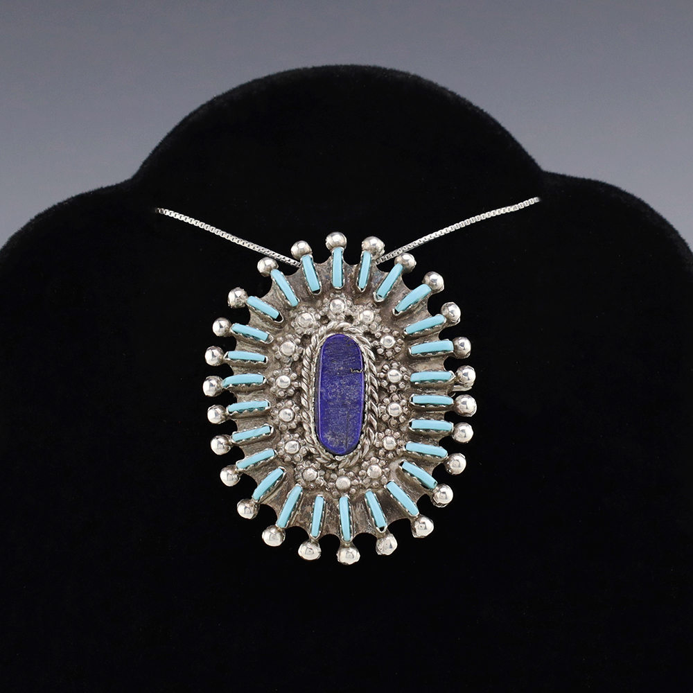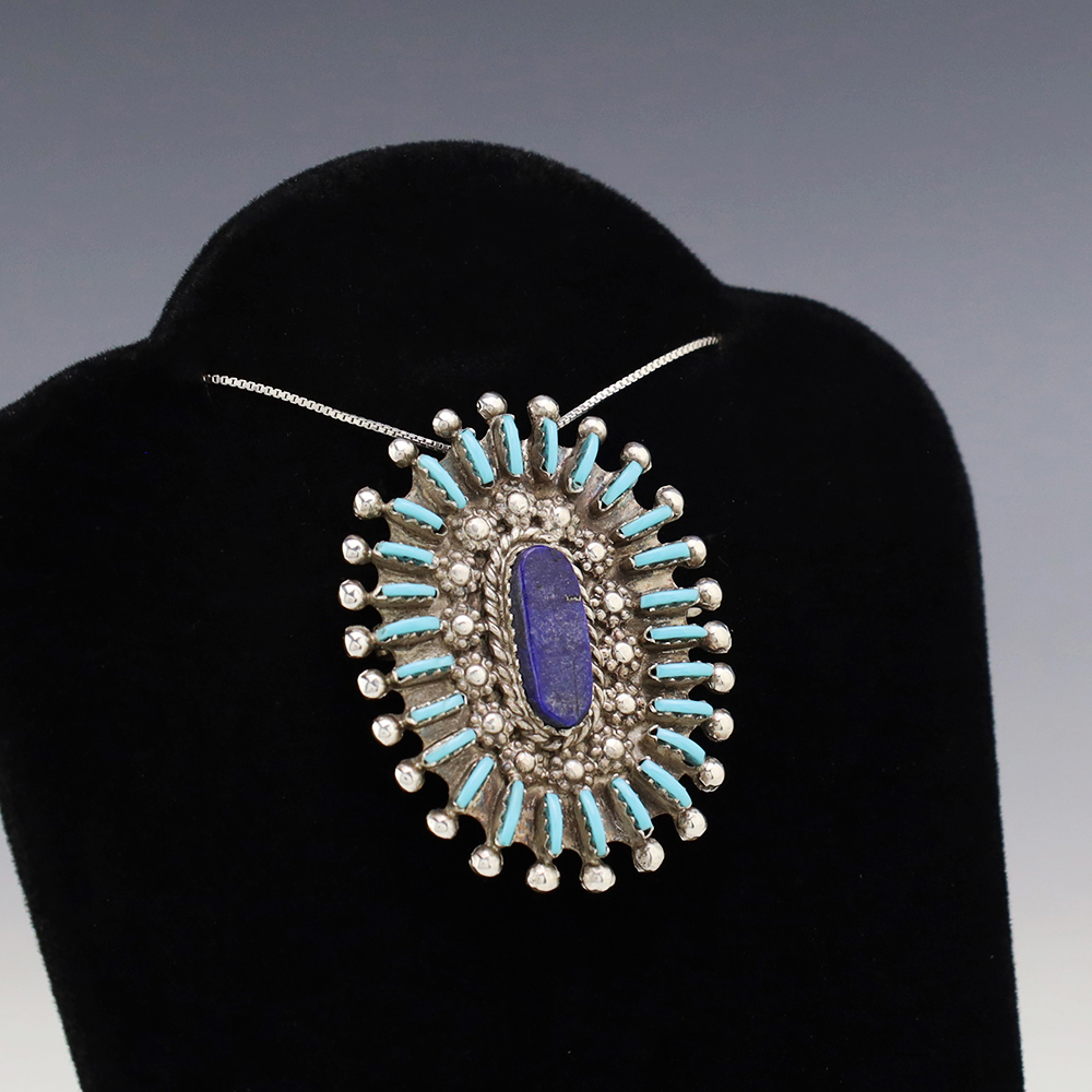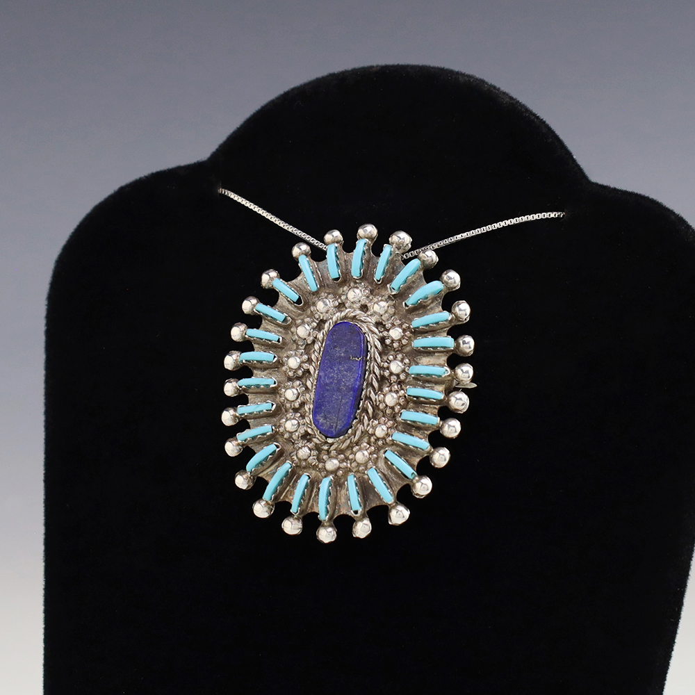 Zuni jeweler Carmelita Simplicio made this beautiful pendant. Zuni artists are known for their fine lapidary skills. Each stone is hand cut, polished, and set into a sterling silver setting. The pendant has two Turquoise stones and is surrounded with silver work. Weighs 6 grams. Signed 3/4” wide x 1 ...
