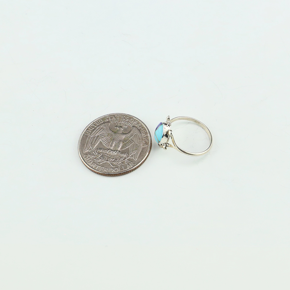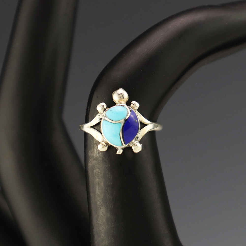 Amazing inlay work! Zuni jewelry makers, Nancy and Sheldon Westika created this magnificent ring. Made out of sterling silver and inlaid with Kingman Turquoise and Jet. Zuni artists are known for their lapidary work. The Westikas have been making jewelry since the 1970’s and they are known for their fine...