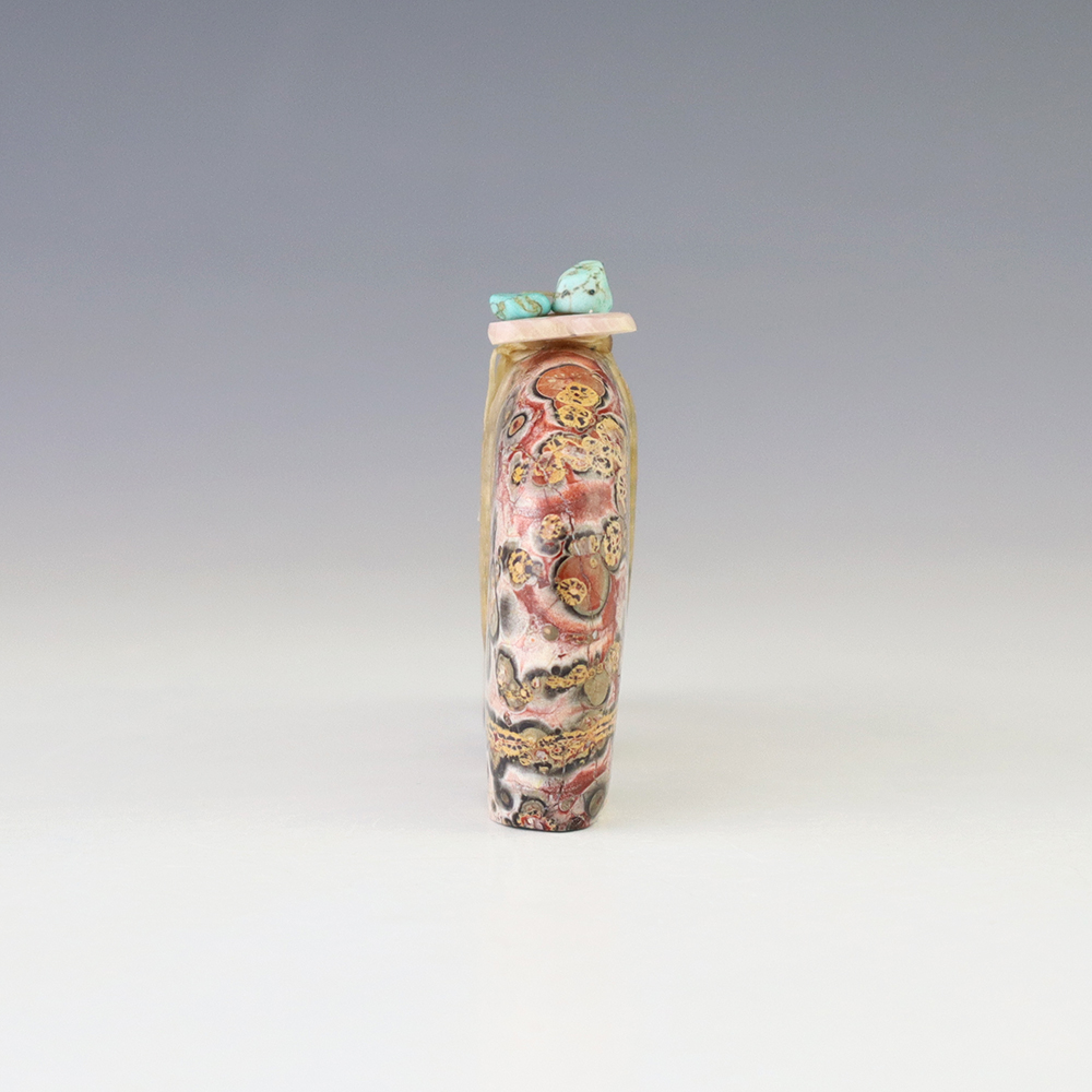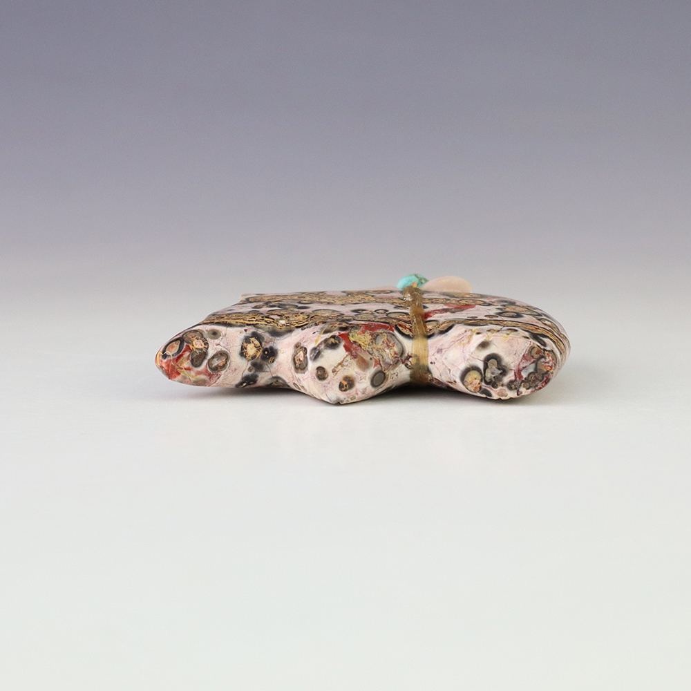 Horned Toad fetishes represent self-reliance and longevity. Zuni fetish carver Nelson Yatsattie created this marvelous horned toad out of picasso marble with turquoise eyes. He’s ready to scuttle away to a new home. Signed 3/4” tall x 2 7/8” long x 1 1/2” wide Artist card included Zuni fetishes are...