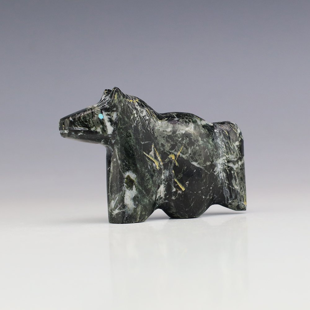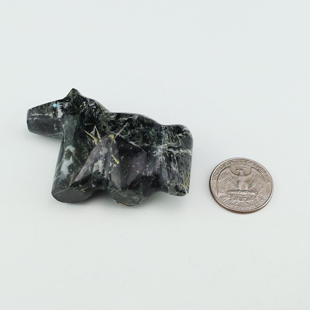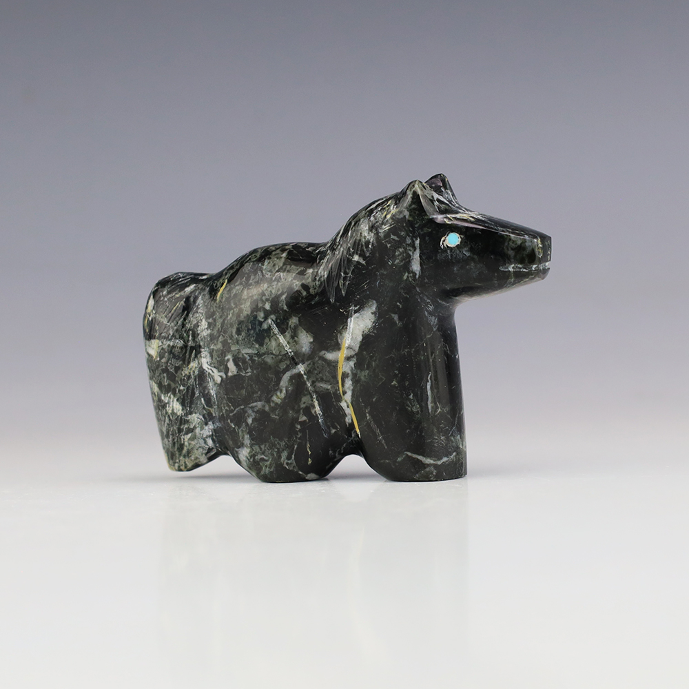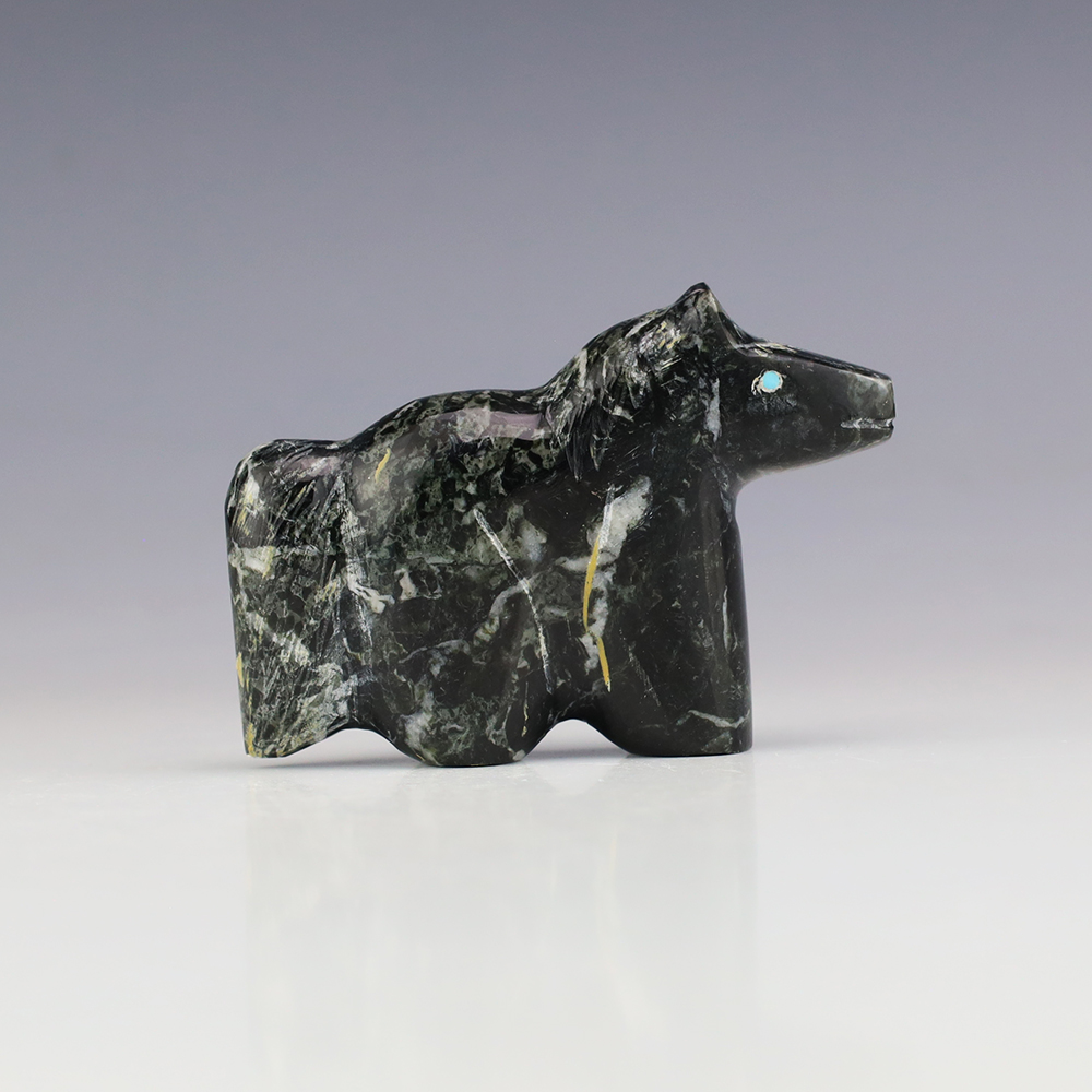 The Horse represents strength, swiftness, and possesses healing powers. Zuni artists Leland Boone and Daphne Quam hand carved this stellar horse fetish. The carving is made out of Marble with Turquoise eyes.