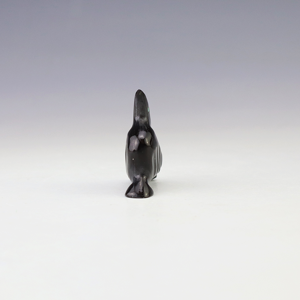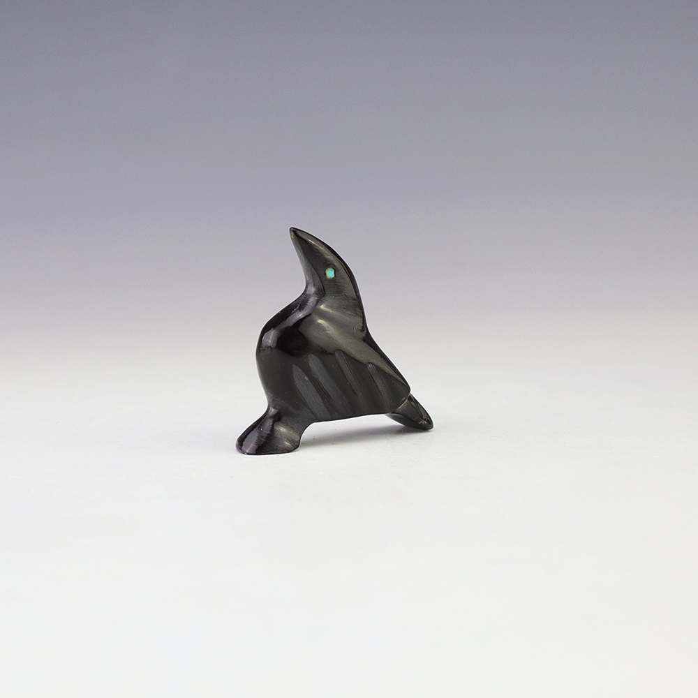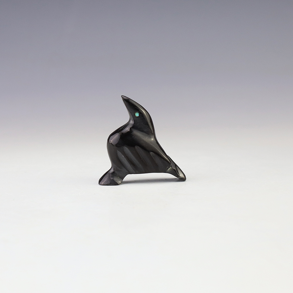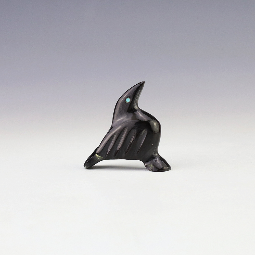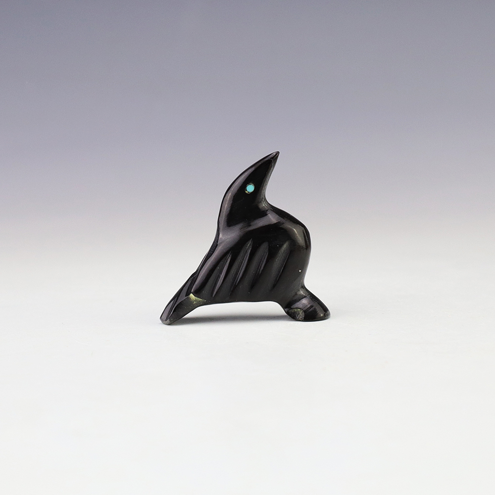 Zuni fetish artist Calvert Bowannie made this wonderful raven out of Marble. The raven’s eyes are made out of Turquoise. The raven represents magic, transformation, and a a change in consciousness. He also is the messenger of mystery, and he helps guide us through the darkest of times. A great addition to your Native American or Zuni fetish collection. Signed