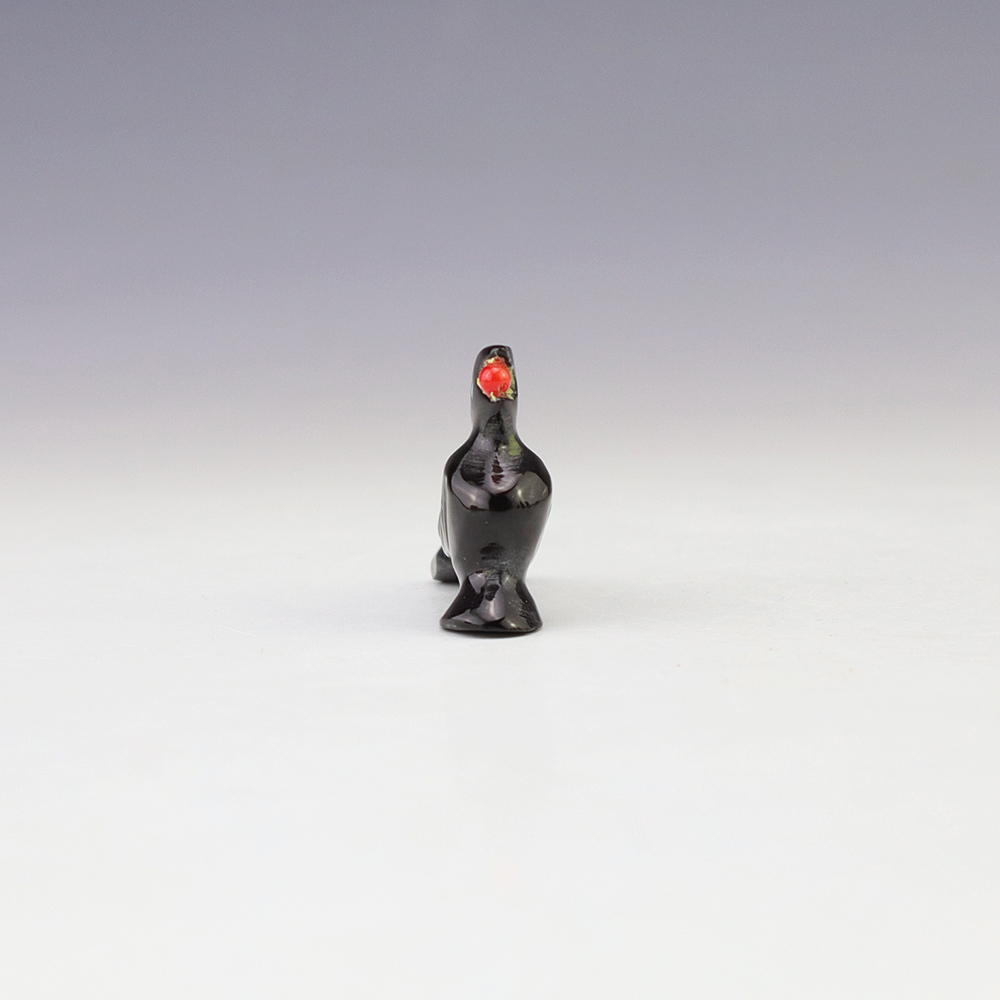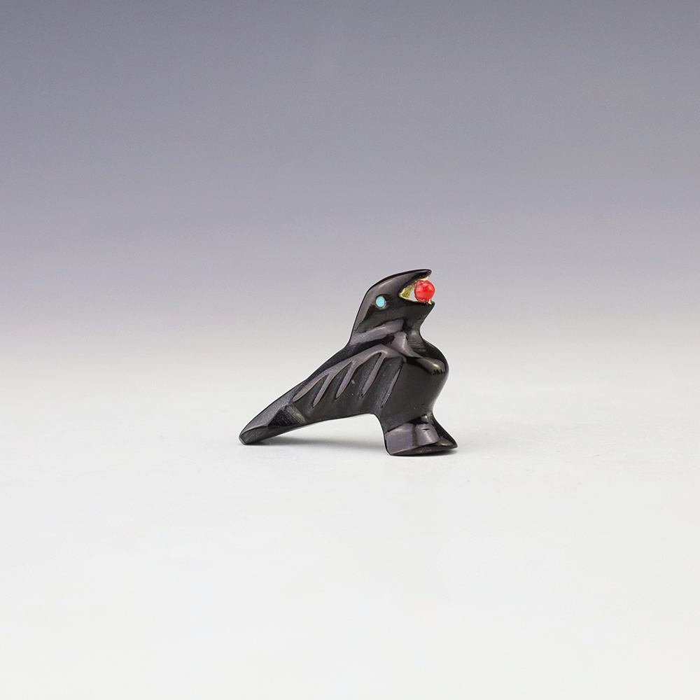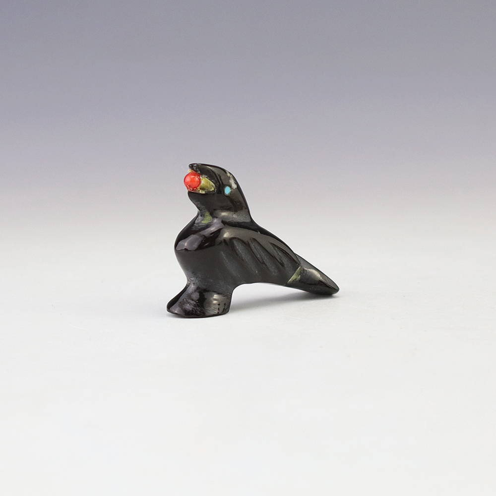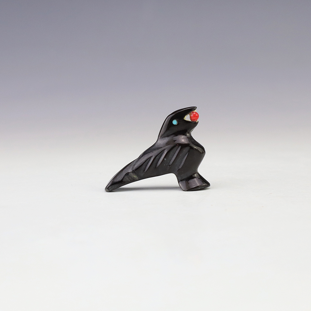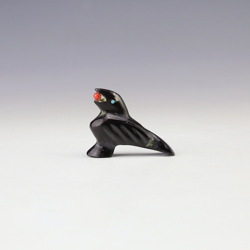 Zuni fetish artist Calvert Bowannie made this wonderful raven out of Marble. The raven’s eyes are made out of Turquoise and he has a Coral pebble in his mouth. The raven represents magic, transformation, and a a change in consciousness. He also is the messenger of mystery, and he helps guide us through the darkest of times. A great addition to your Native American or Zuni fetish collection. Signed