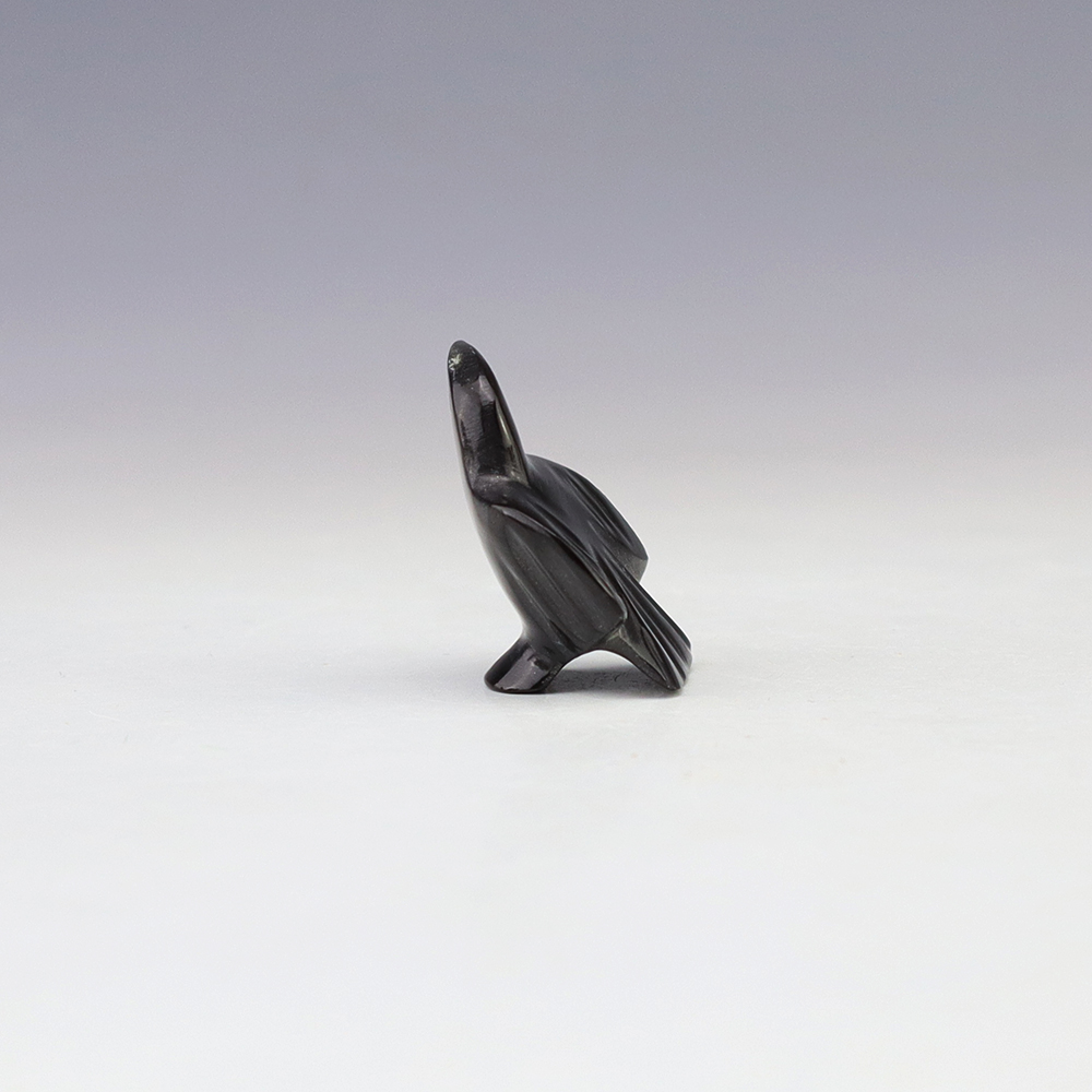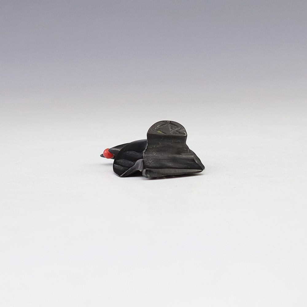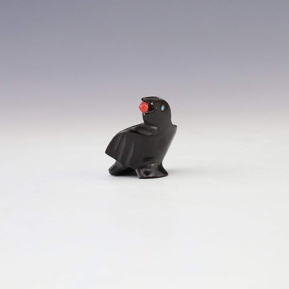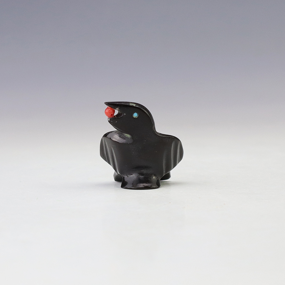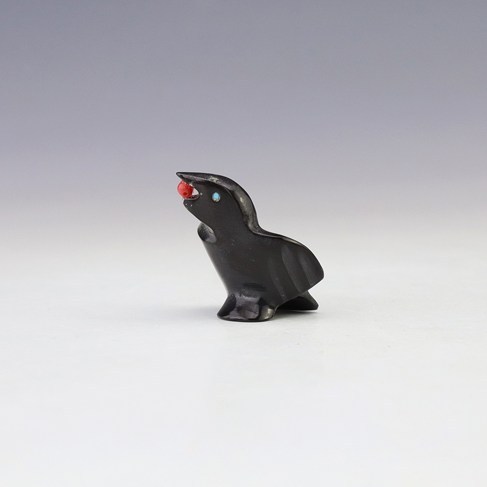 Zuni fetish artist Calvert Bowannie made this magnificent raven out of Marble and Turquoise. The raven’s eyes are made out of Turquoise, and he has a Coral pebble in his mouth. The raven represents magic, transformation, and a a change in consciousness. He also is the messenger of mystery, and he helps guide us through the darkest of times. A great addition to your Native American or Zuni fetish collection. Signed