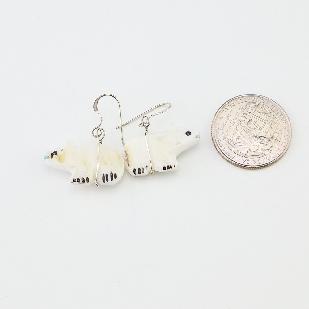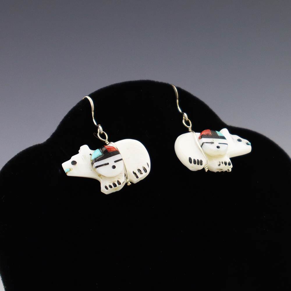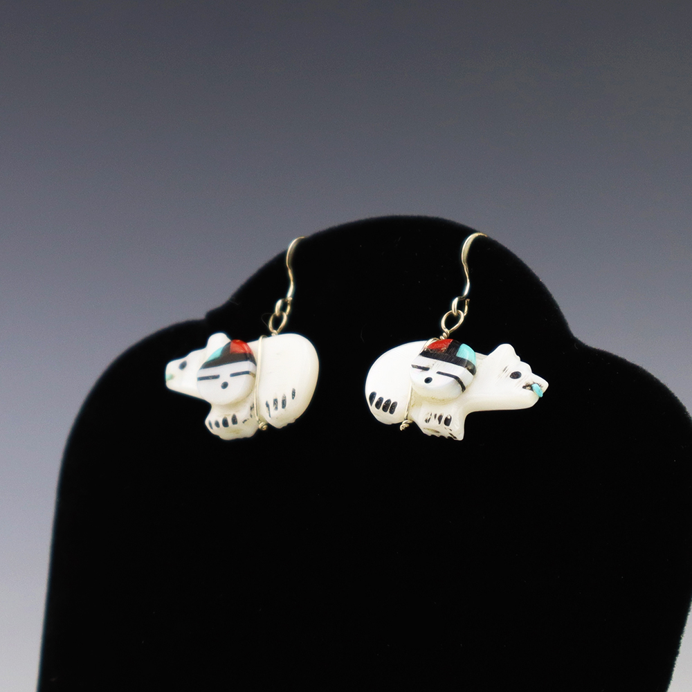 Zuni artist Darrin Boone made these fabulous bear earrings out of Jet, Mother of Pearl Shell, Coral, and Turquoise. These wonderful earrings will become a versatile accessory in your jewelry collection. Weighs 4 grams.