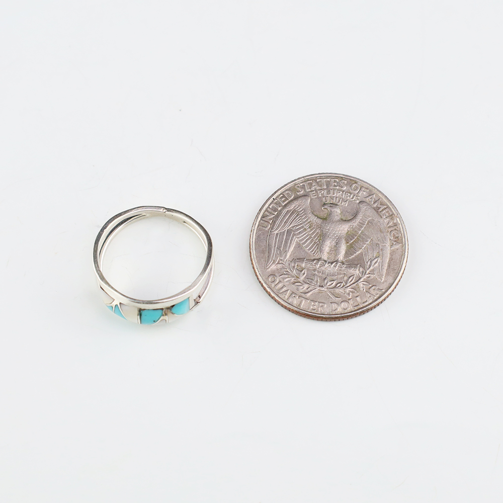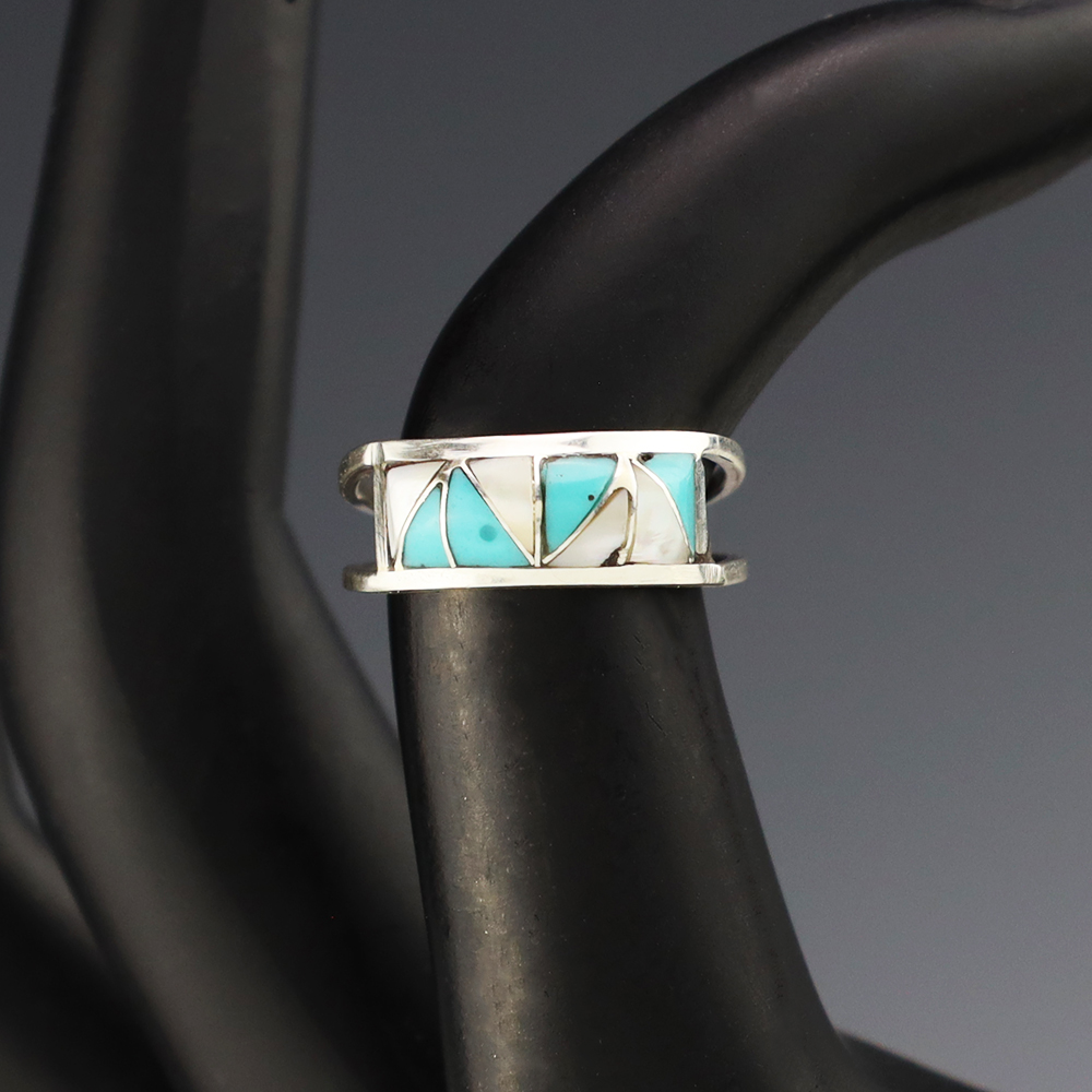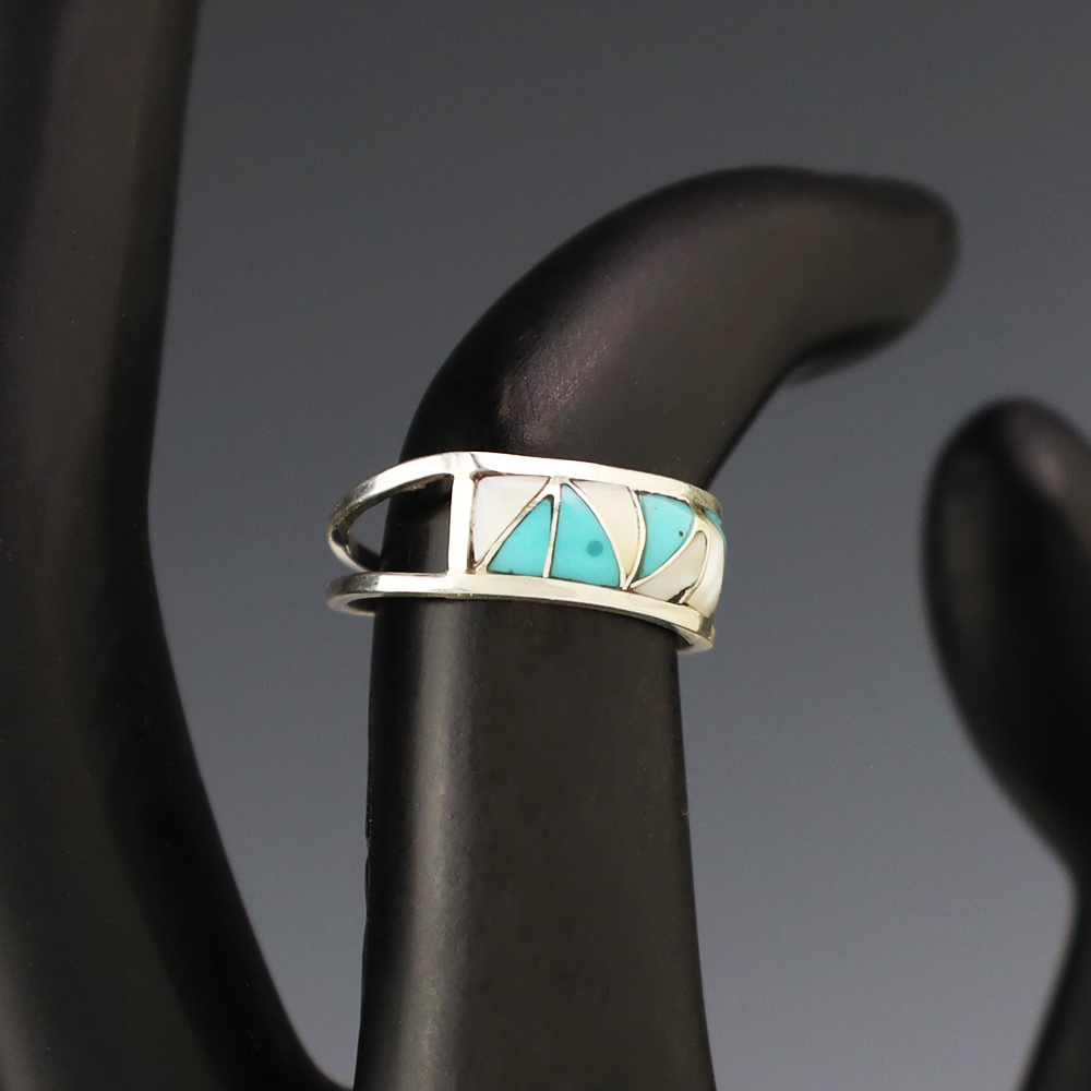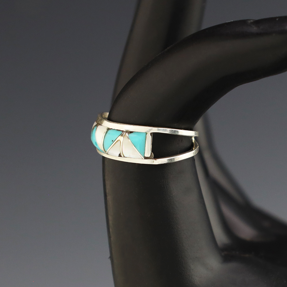 Zuni artists are known for their fine lapidary skills. Each stone is hand cut, polished, and set into a sterling silver setting. The ring is set with Mother of Pearl Shell and Turquoise stones. Hand made by Zuni artist Gloria Tucson. Weighs 2 grams. Size 5. Signed