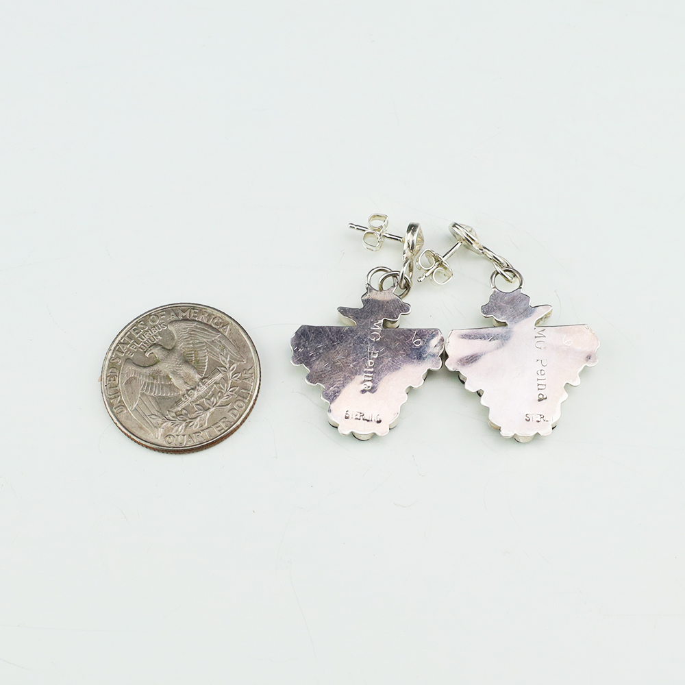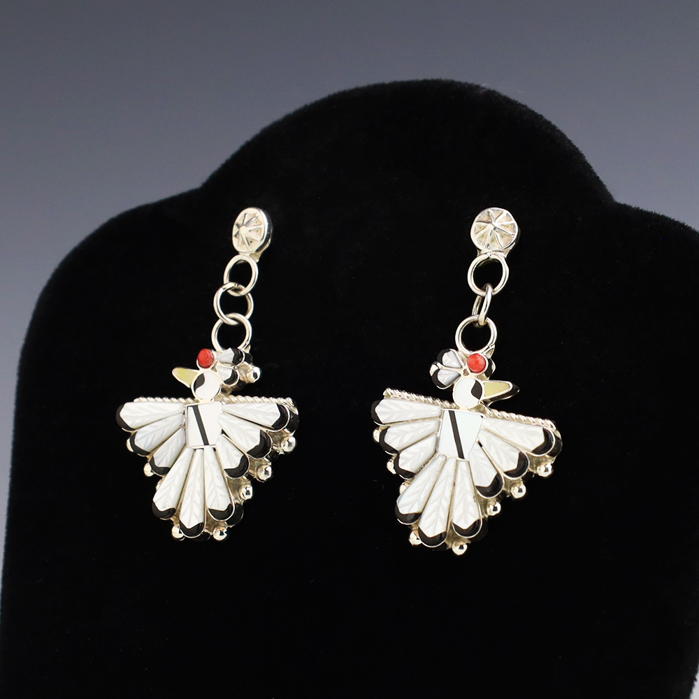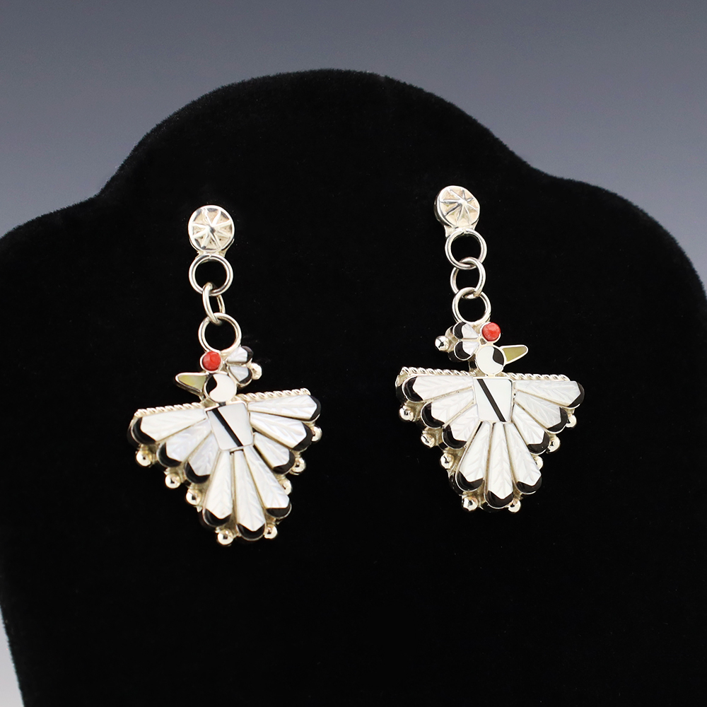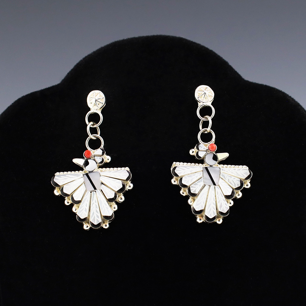 Zuni artist Michelle Peina made these fabulous Thunderbird earrings. Zuni artists are known for their fine lapidary skills. Each stone is hand cut, polished, and set into a sterling silver setting. The earrings are inlaid with Coral, Jet, and Mother of Pearl Shell. Weighs 8 grams. Signed