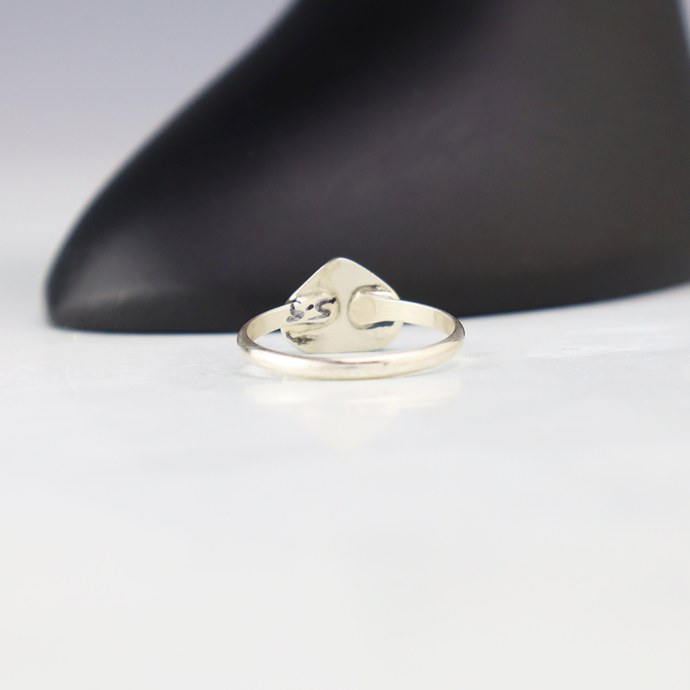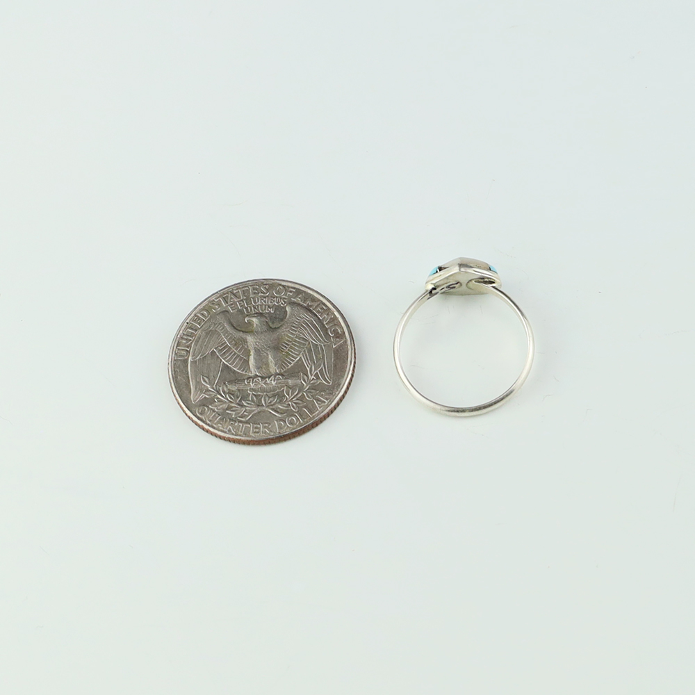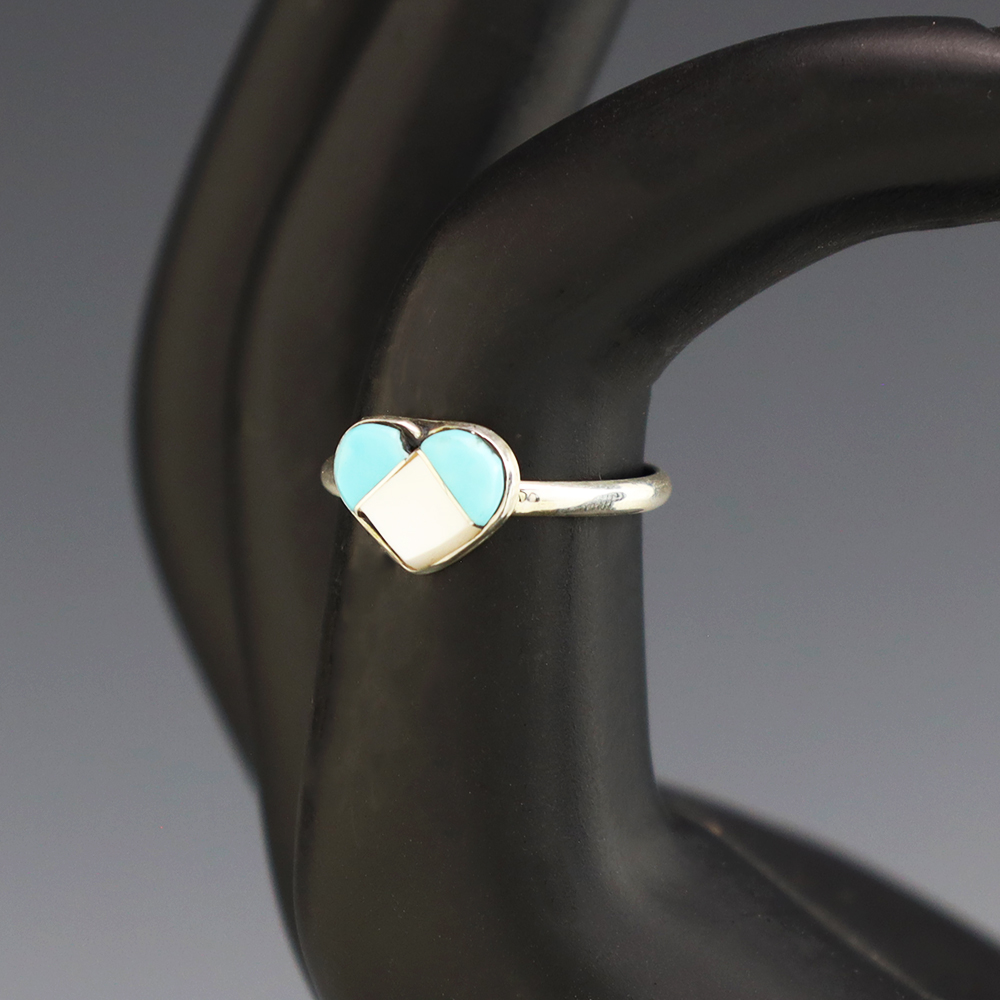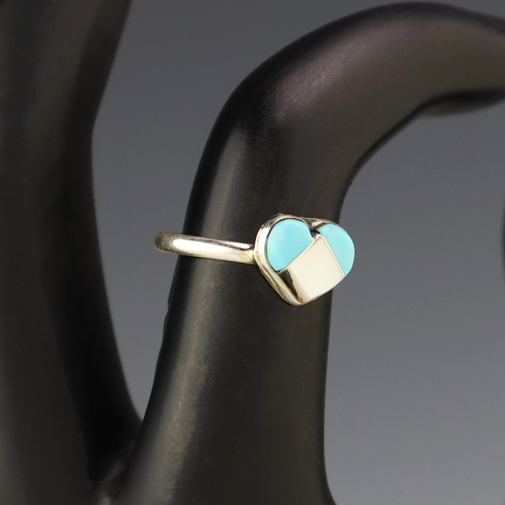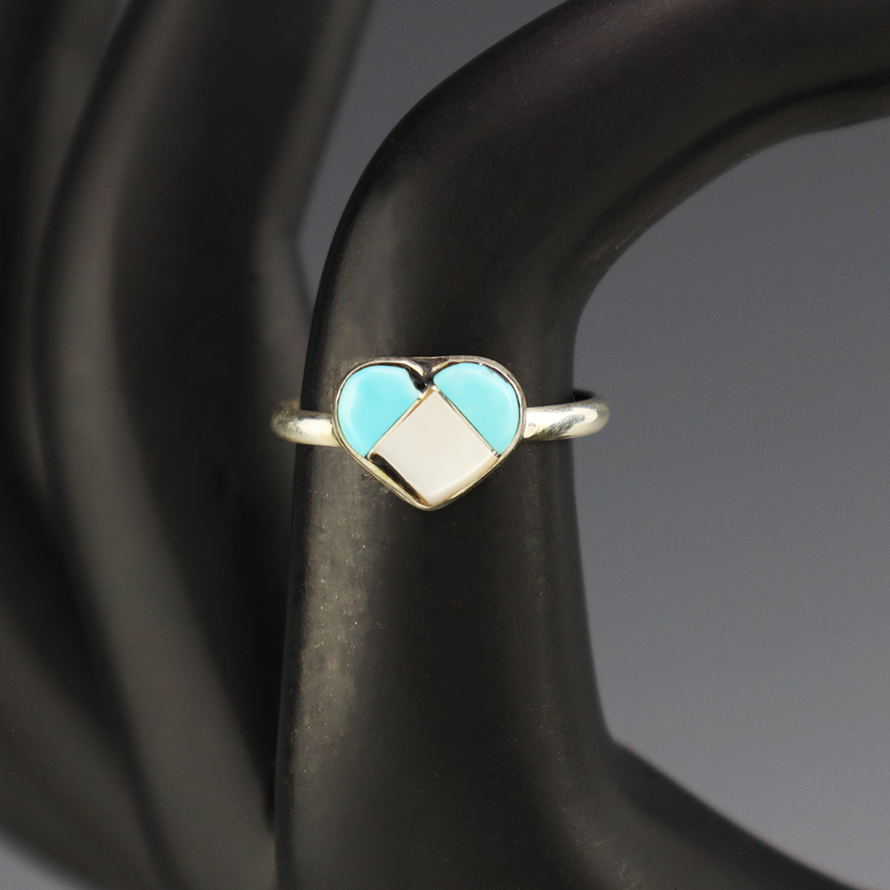 Zuni artists are known for their fine lapidary skills. Each stone is hand cut, polished, and set into a sterling silver setting. The ring is set with Mother of Pearl Shell and Turquoise stones. Hand made by Zuni artist Linda Chavez. Weighs 2 grams. Size 5 1/2.