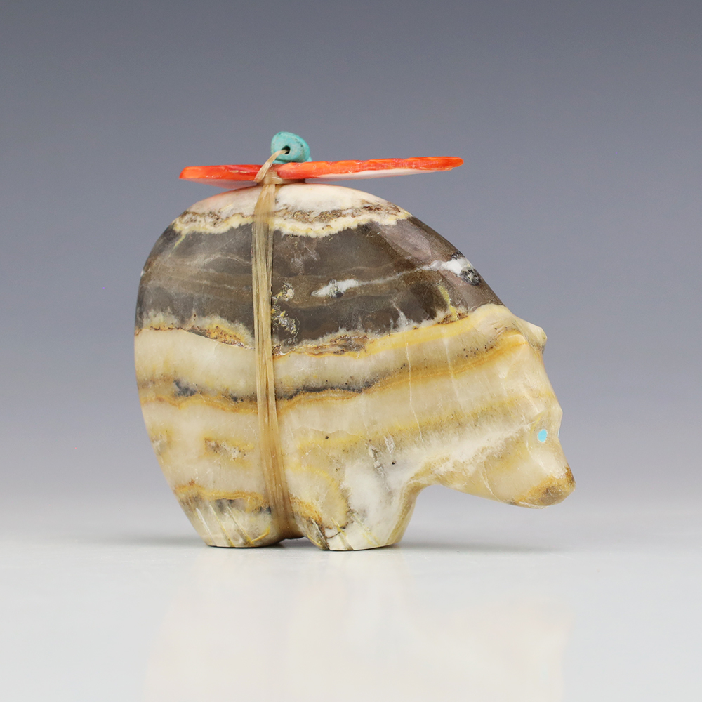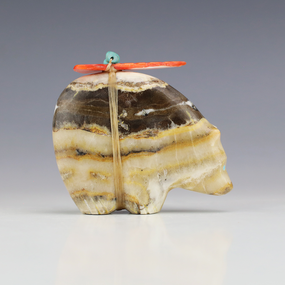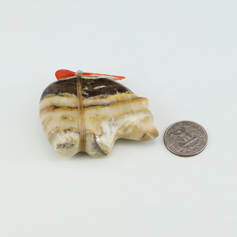 Zuni fetish carvers Leland Boone and Daphne Quam made this wonderful bear fetish out of Onyx and is bundled with Turquoise and Spiny Oyster. The Bear is the Guardian fetish of the West, and represents healing and strength. A great addition to your Native American or Zuni fetish collection. (note-there is natural fracturing in the stone)