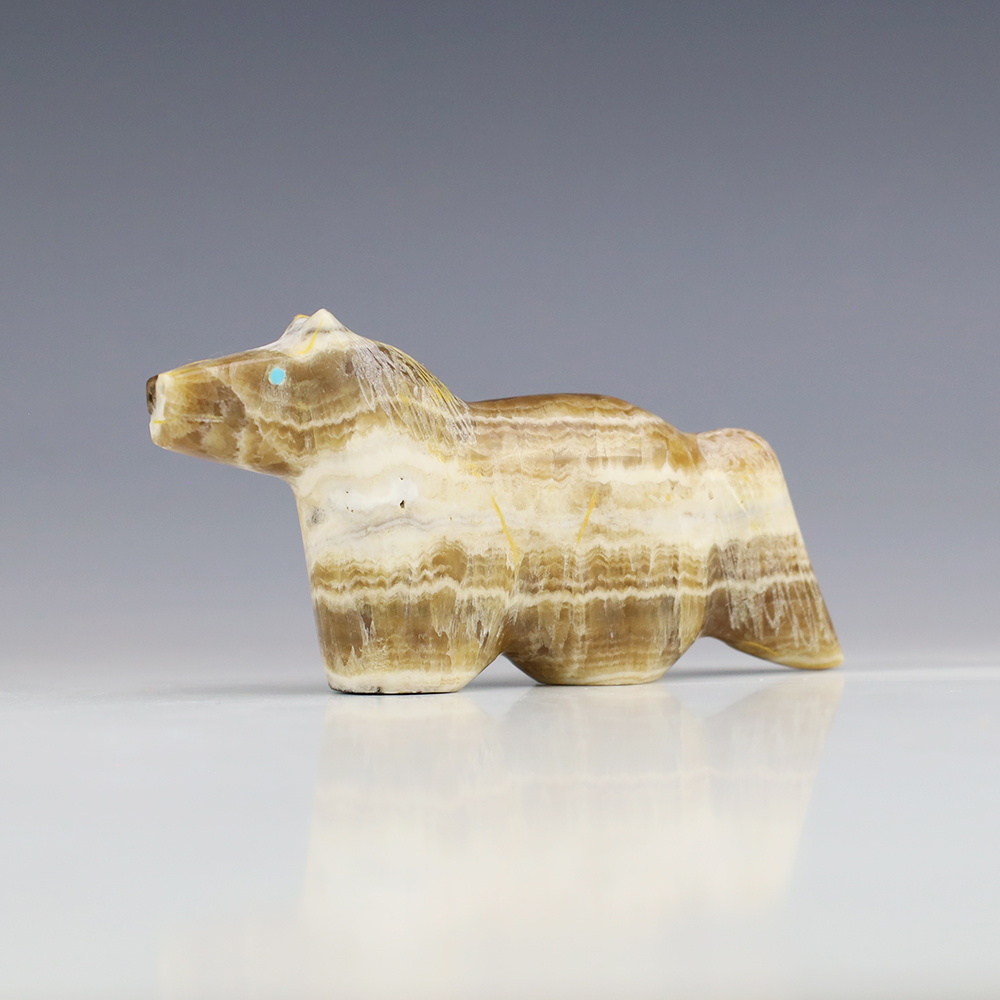 The Horse represents strength, swiftness, and possesses healing powers. Zuni artists Leland Boone and Daphne Quam hand carved this stellar horse fetish. The carving is made out of Onyx with Turquoise eyes. (note-there is natural fracturing in the stone)