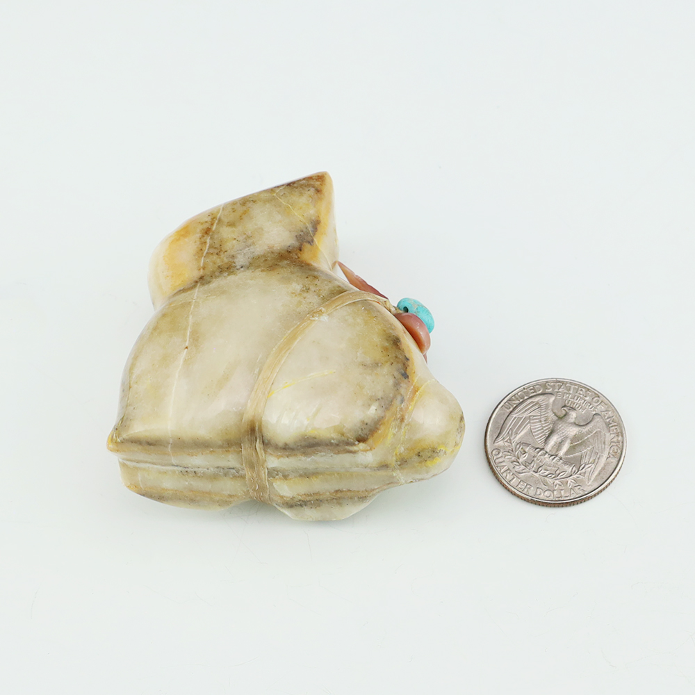 The Rabbit represents virtue, serenity, low curiosity, quiet talent, passion, conquering fear, safety, special guardian of women in childbirth, safe birth, and long life. Zuni artists Leland Boone and Daphne Quam made this wonderful rabbit fetish. Hand carved out of Onyx and bundled with Turquoise and Pink Mussel. This great carving would make a great addition to your Native American art or Zuni fetish collection.