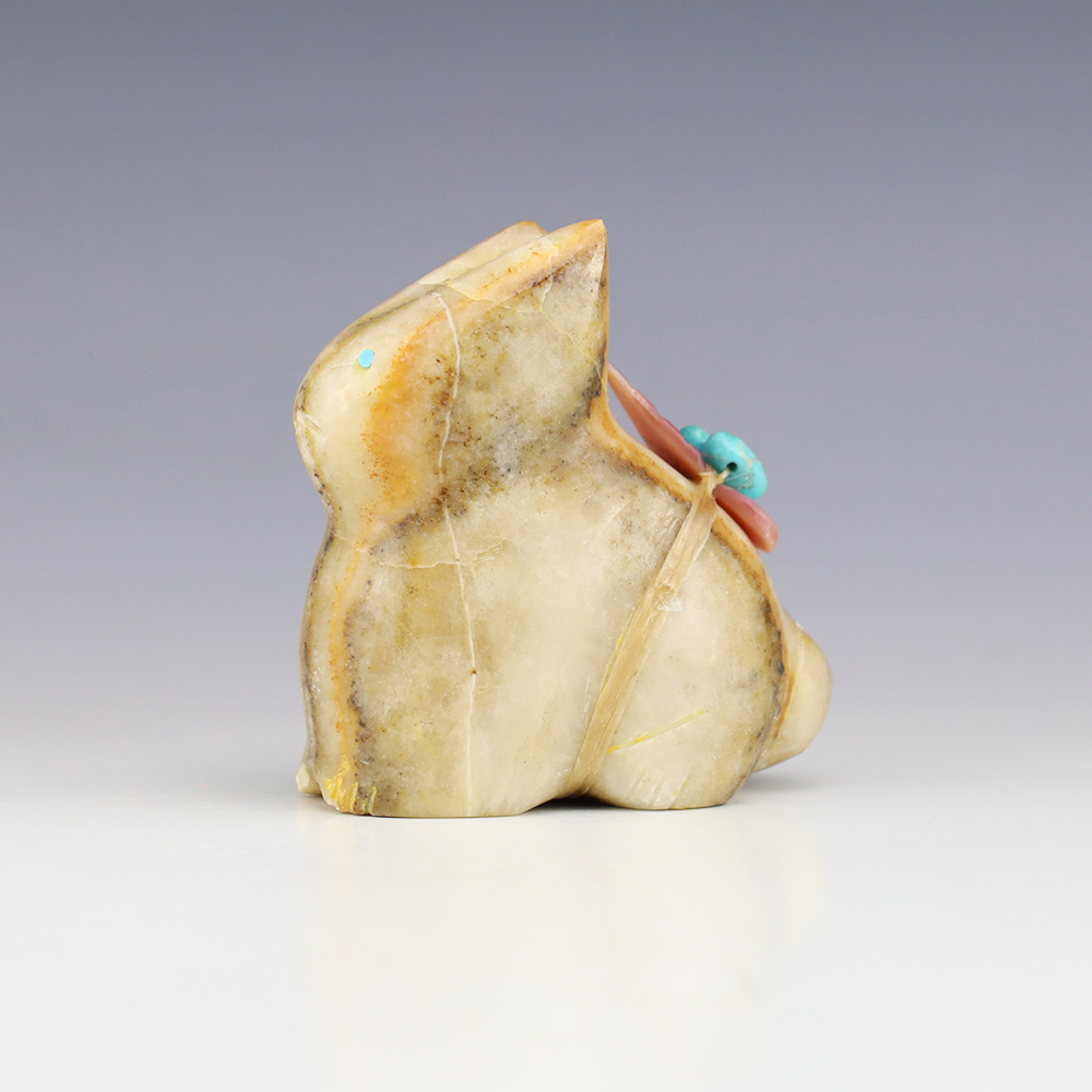 The Rabbit represents virtue, serenity, low curiosity, quiet talent, passion, conquering fear, safety, special guardian of women in childbirth, safe birth, and long life. Zuni artists Leland Boone and Daphne Quam made this wonderful rabbit fetish. Hand carved out of Onyx and bundled with Turquoise and Pink Mussel. This great carving would make a great addition to your Native American art or Zuni fetish collection.