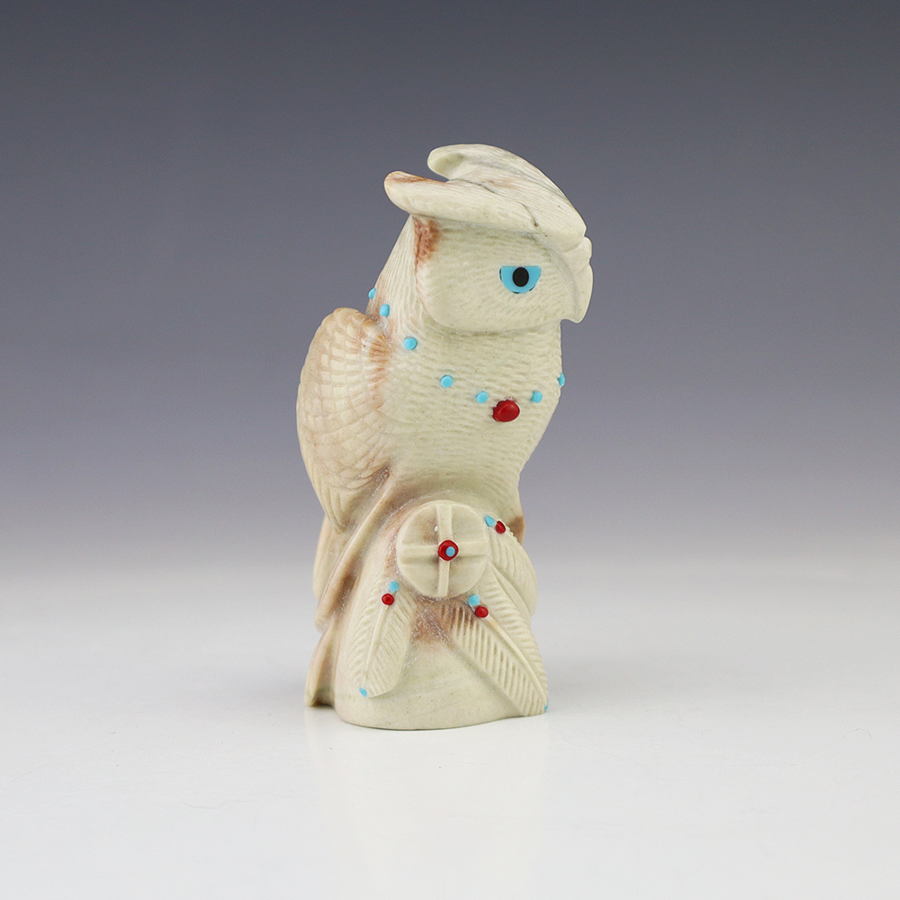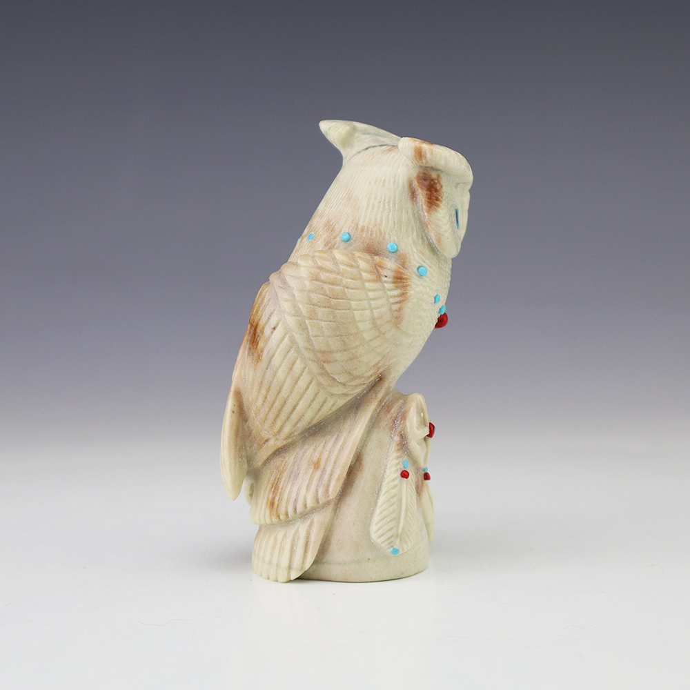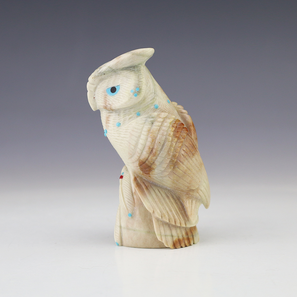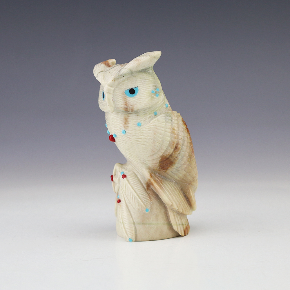 The Owl is the protector of the home. He represents wisdom and truth, and has the ability to see what others cannot. Zuni artist Hudson Sandy made this outstanding owl fetish. Hand carved out of Picasso Marble and inlaid with Turquoise and Coral. Amazing detail! This great carving would make a great addition to your Native American art or Zuni fetish collection. Signed