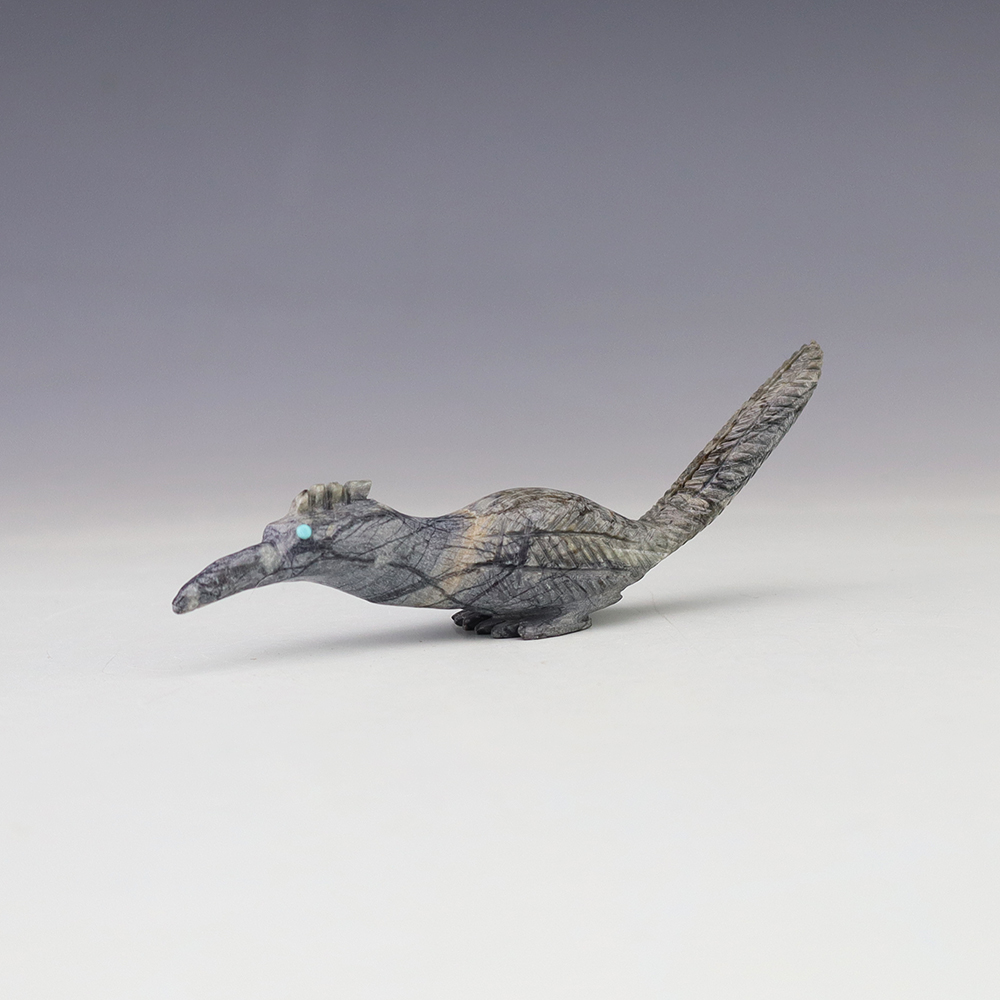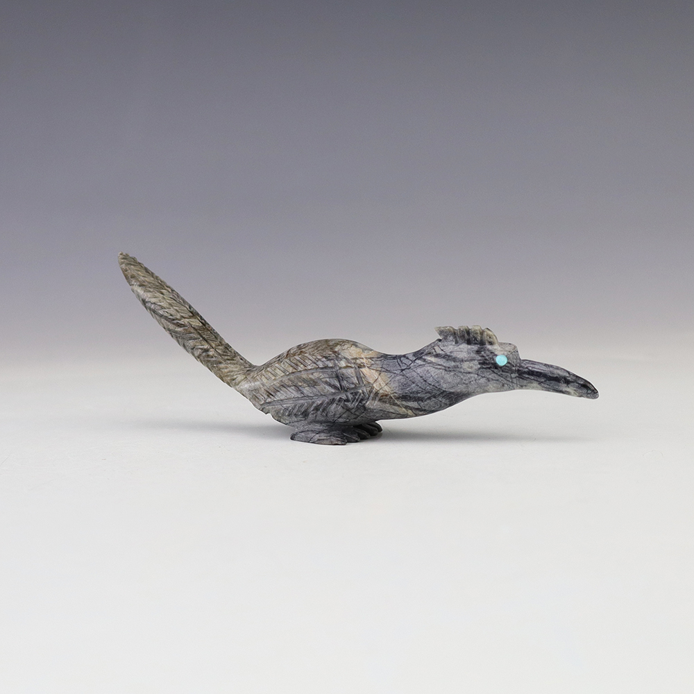 Zuni artist Bernard Laselute made this wonderful Roadrunner fetish out of Picasso Marble. It has Turquoise eyes. This unique carving would make a great addition to your Native American art or Zuni fetish collection. Signed