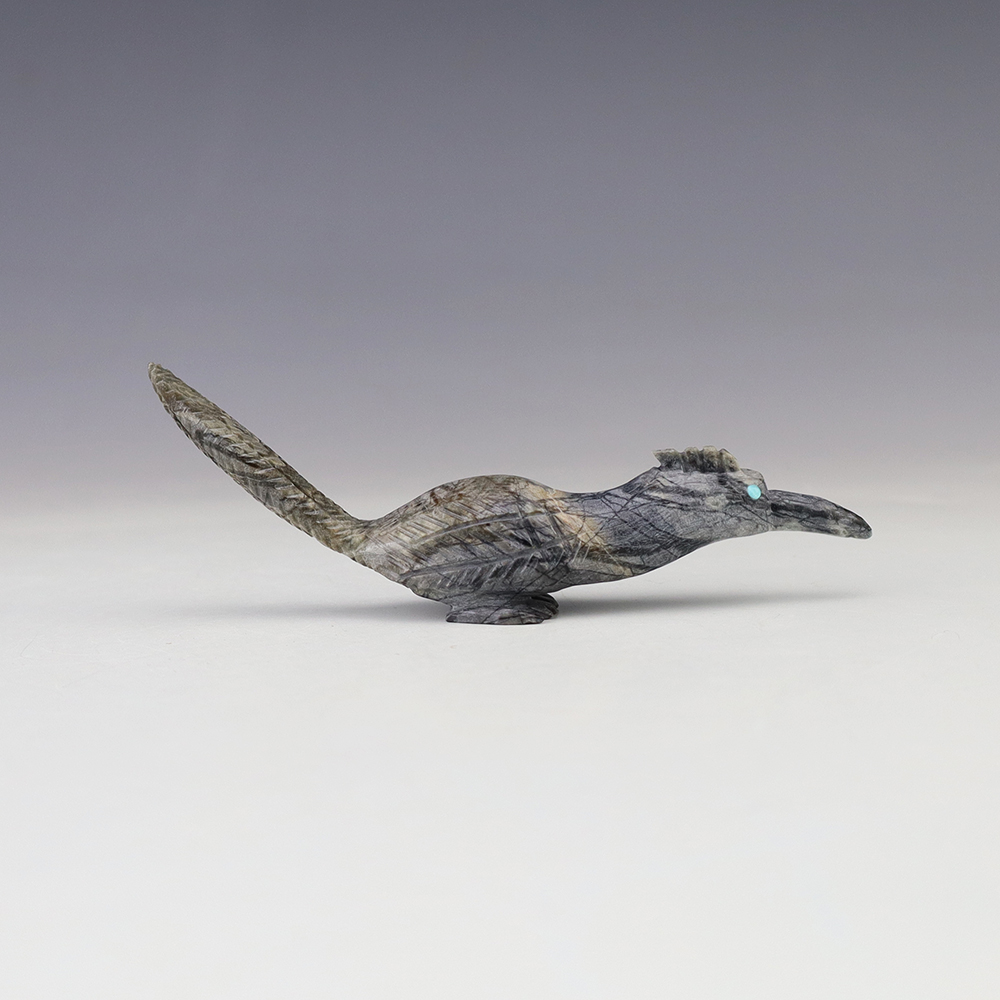 Zuni artist Bernard Laselute made this wonderful Roadrunner fetish out of Picasso Marble. It has Turquoise eyes. This unique carving would make a great addition to your Native American art or Zuni fetish collection. Signed