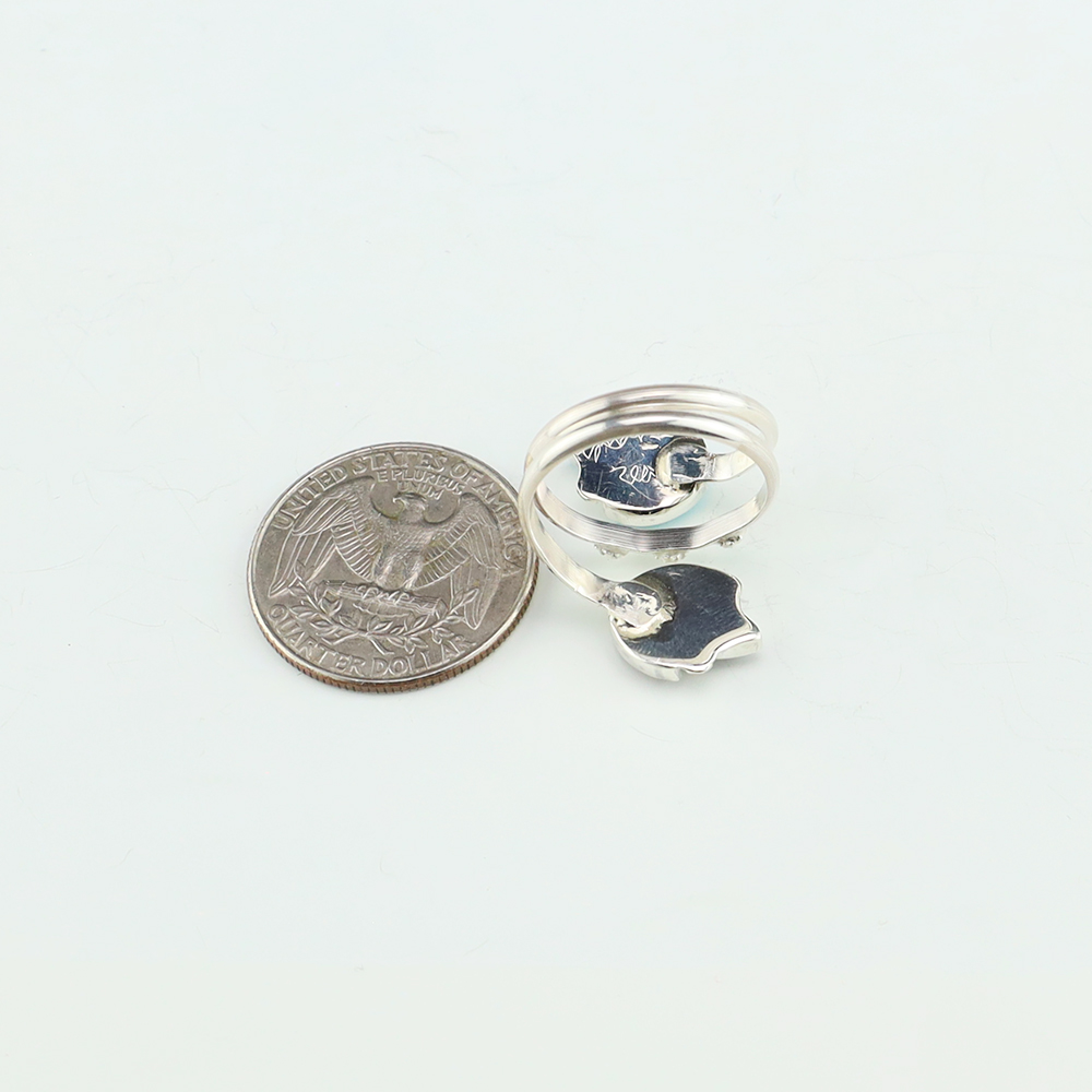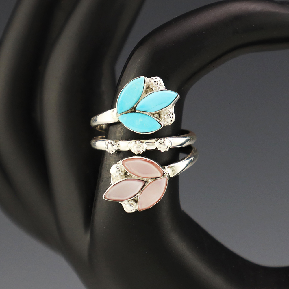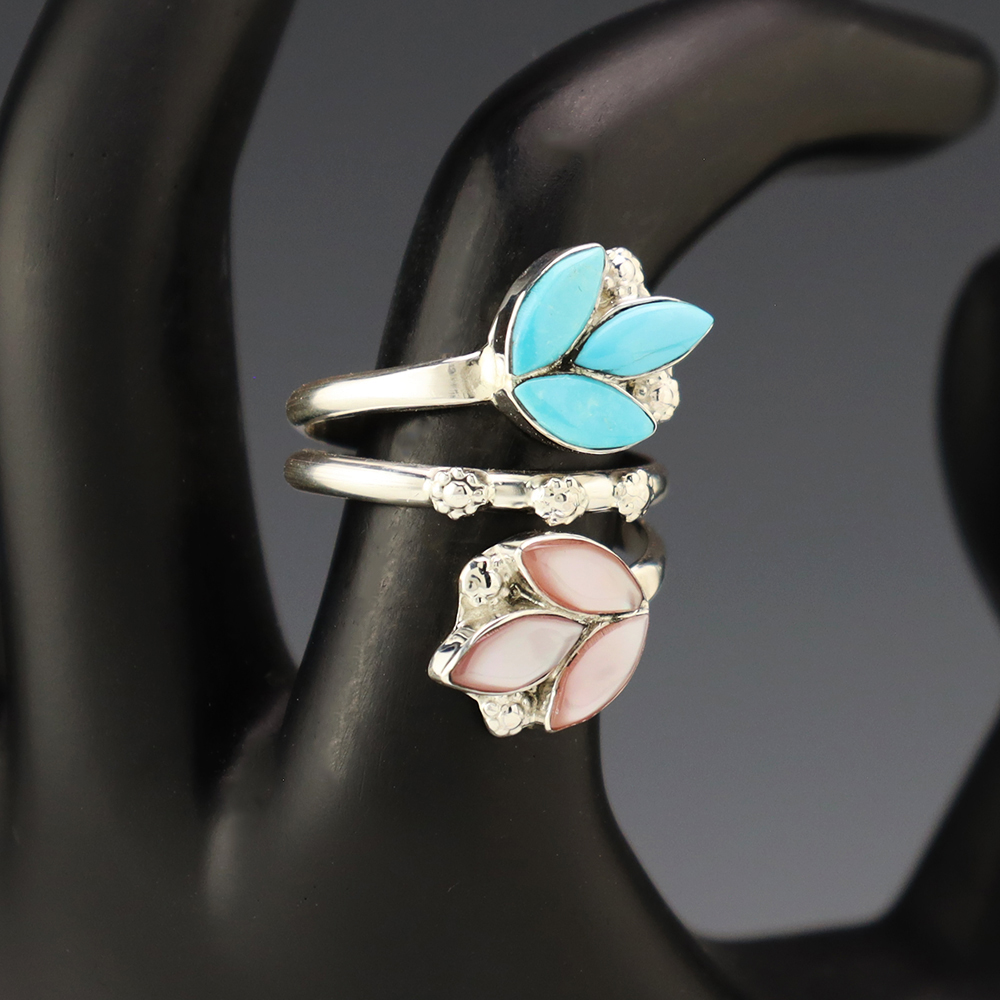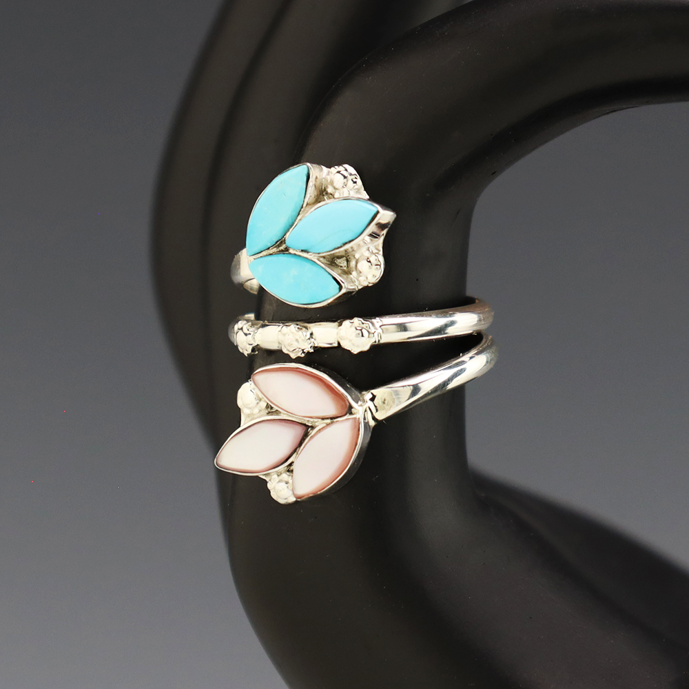 Zuni artists are known for their fine lapidary skills. Each stone is hand cut, polished, and set into a sterling silver setting. The ring is set with Pink Mussel and Turquoise stones. Weighs 6 grams. Size is adjustable. Signed