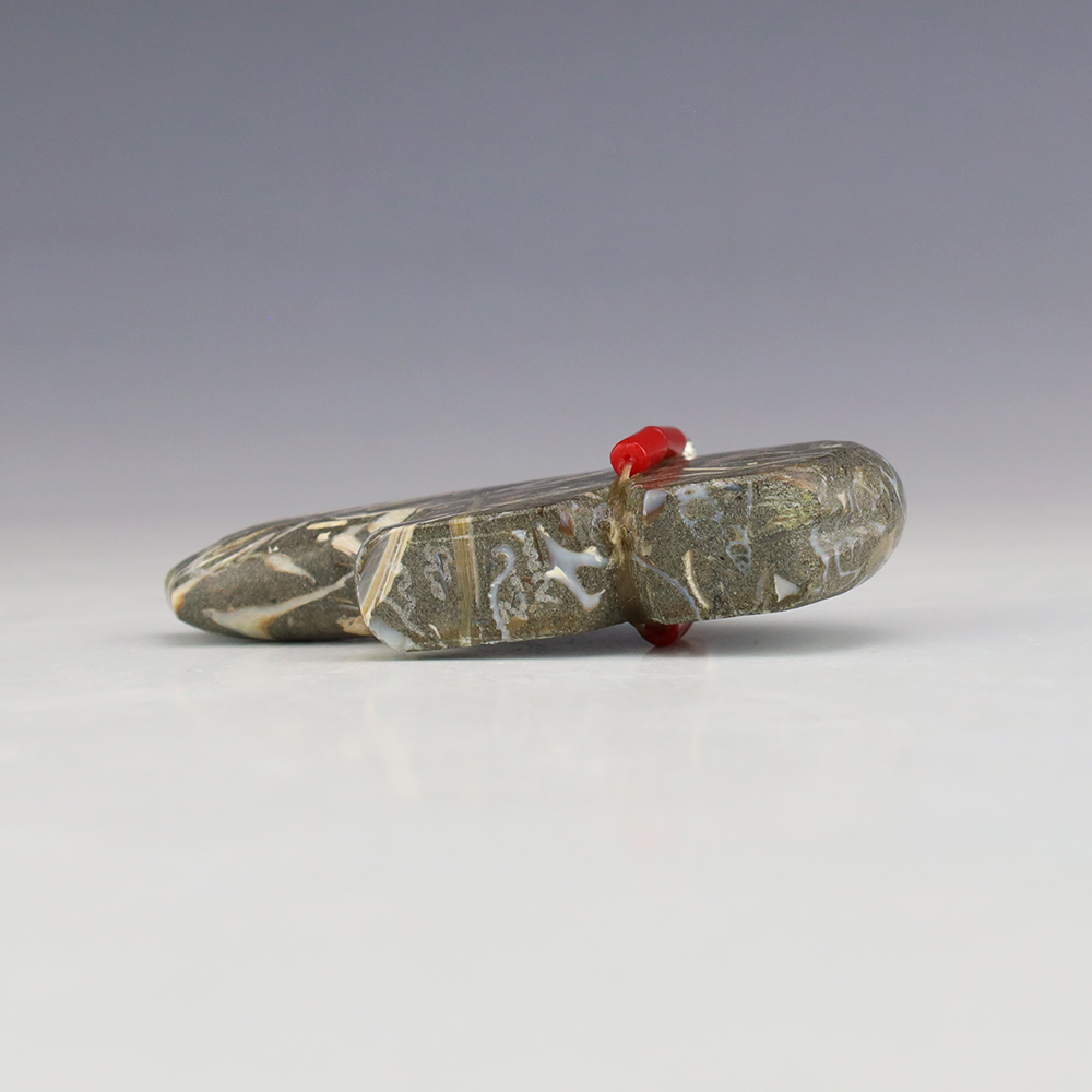Zuni bear fetishes represent healing and strength. This marvelous bear fetish is made out of Purisima Stone by Zuni artist Todd Westika. It is bundled with Turquoise, Coral, and silver. This fetish showcases the graceful lines and sculptural quality of Todd’s carvings. A great addition to your Native American or Zuni fetish collection. Signed
