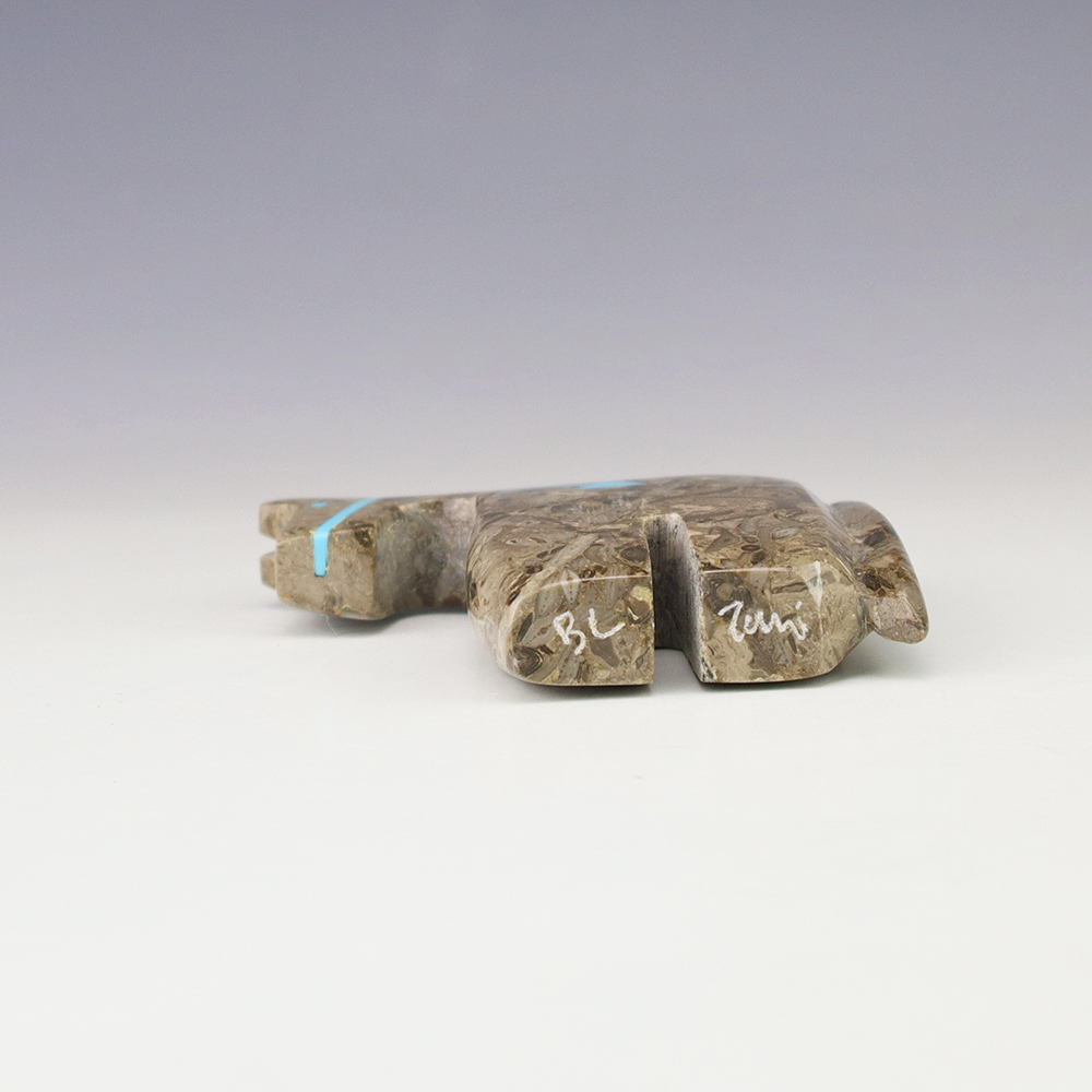 Zuni bear fetishes represent healing and strength. This exquisite bear fetish is made out of Orthoceras with a Turquoise heartline by Zuni artist Todd Westika. This fetish showcases the graceful lines and sculptural quality of Todd’s carvings. A great addition to your Native American or Zuni fetish collection. Signed 2 ...